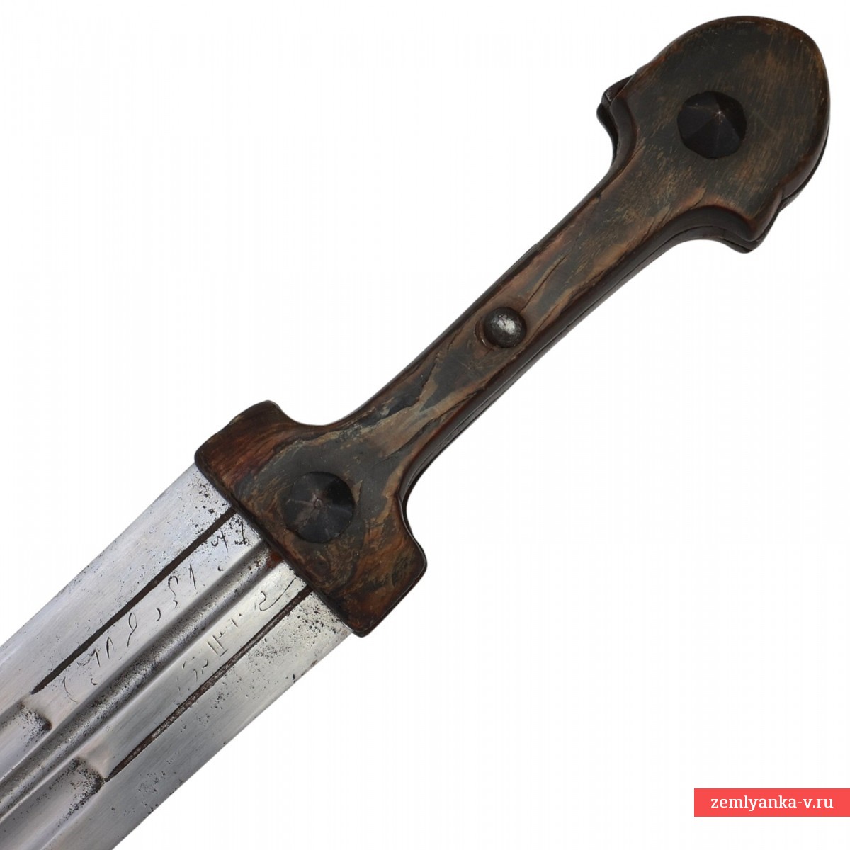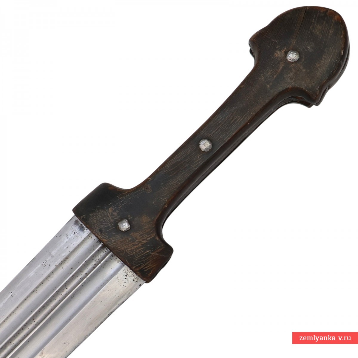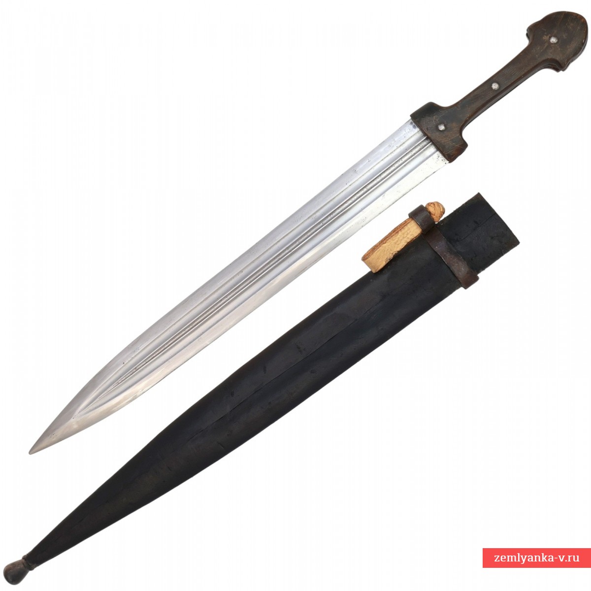 Клинок стальной, плоский, двулезвийный, с тремя долами с обеих сторон. На клинке нанесены плохо читаемые надписи на грузинском языке. Рукоять классической закавказской формы, образована двумя роговыми щёчками, которые крепятся к черенку клинка при помощи трёх заклёпок. С лицевой стороны заклёпки закрывают шлемовидные с гранями стальные накладки (по краям) и одна шарообразная по центру. Ножны деревянные, обтянутые черной кожей со стальным прибором, который состоит из устья с боковой неподвижной скобой и стальным фигурным шариком на конце. На скобе закреплена кожаная петля.