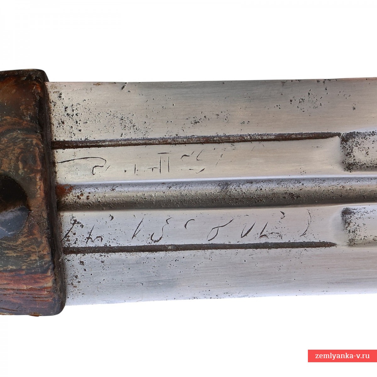 Предмет находится в хорошем коллекционном состоянии. Незначительные поверхностные следы коррозии на клинке. Следы бытования на рукояти. Кожа на ножнах заменена в позднее время.
