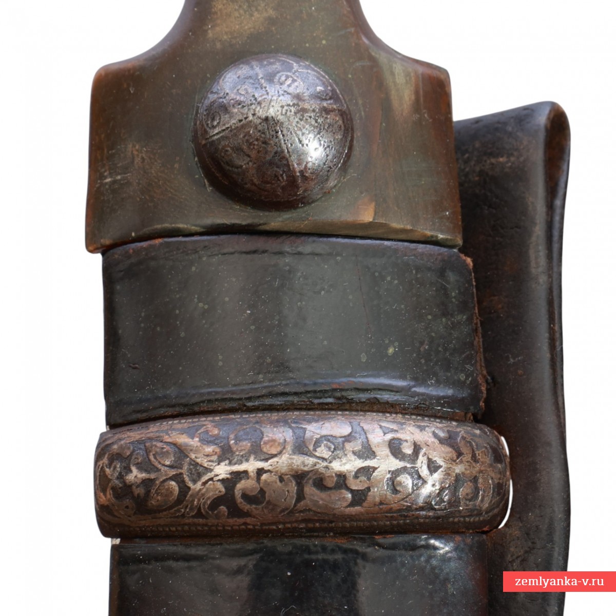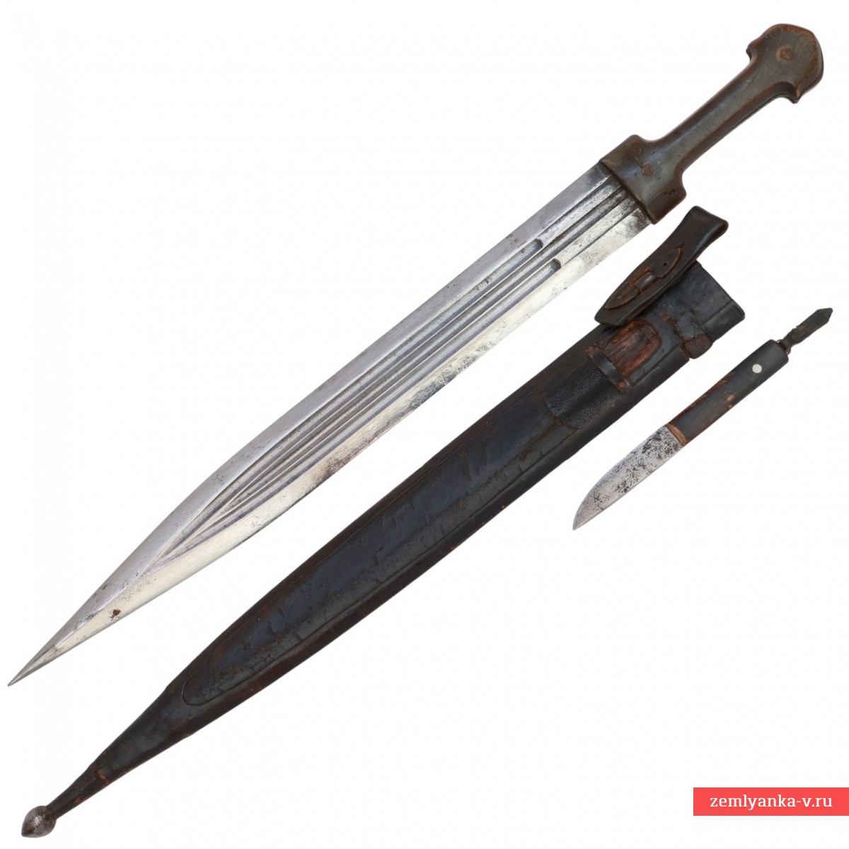 Клинок стальной, плоский, двулезвийный, с тремя долами с обеих сторон. Рукоять классической закавказской формы, образована двумя роговыми щёчками, которые крепятся к черенку клинка при помощи двух заклёпок. С лицевой стороны заклёпки закрывают шарообразные стальные накладки, украшенными таушированием серебром. Ножны деревянные, обтянутые черной кожей со стальным прибором, который состоит из устья с боковой неподвижной скобой и стальным фигурным шариком на конце. На скобе закреплена кожаная петля. Кинжал комплектуется вспомогательным кинжалом с роговой рукоятью.