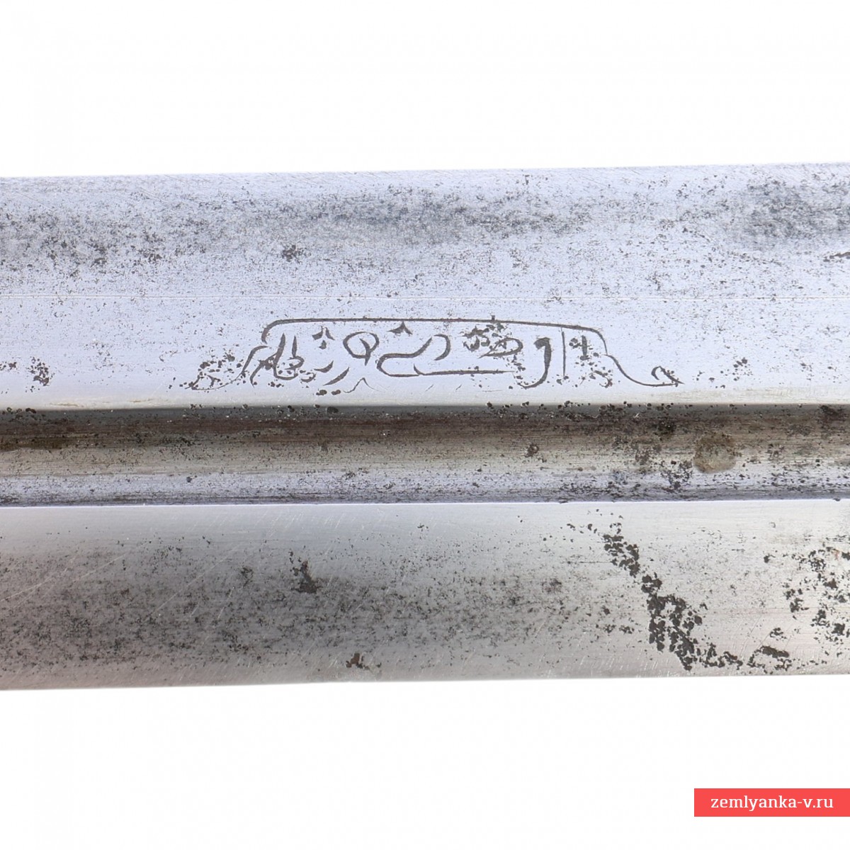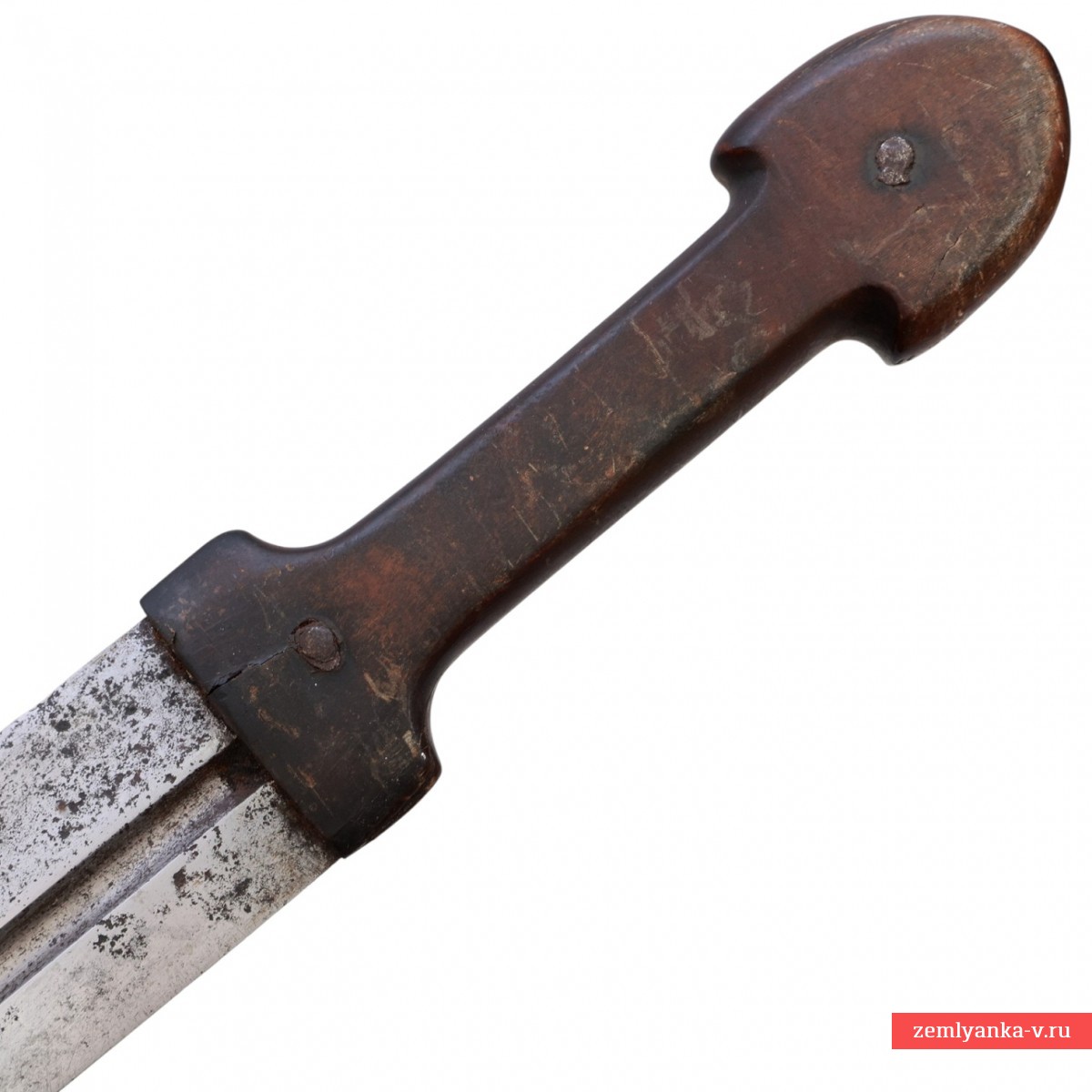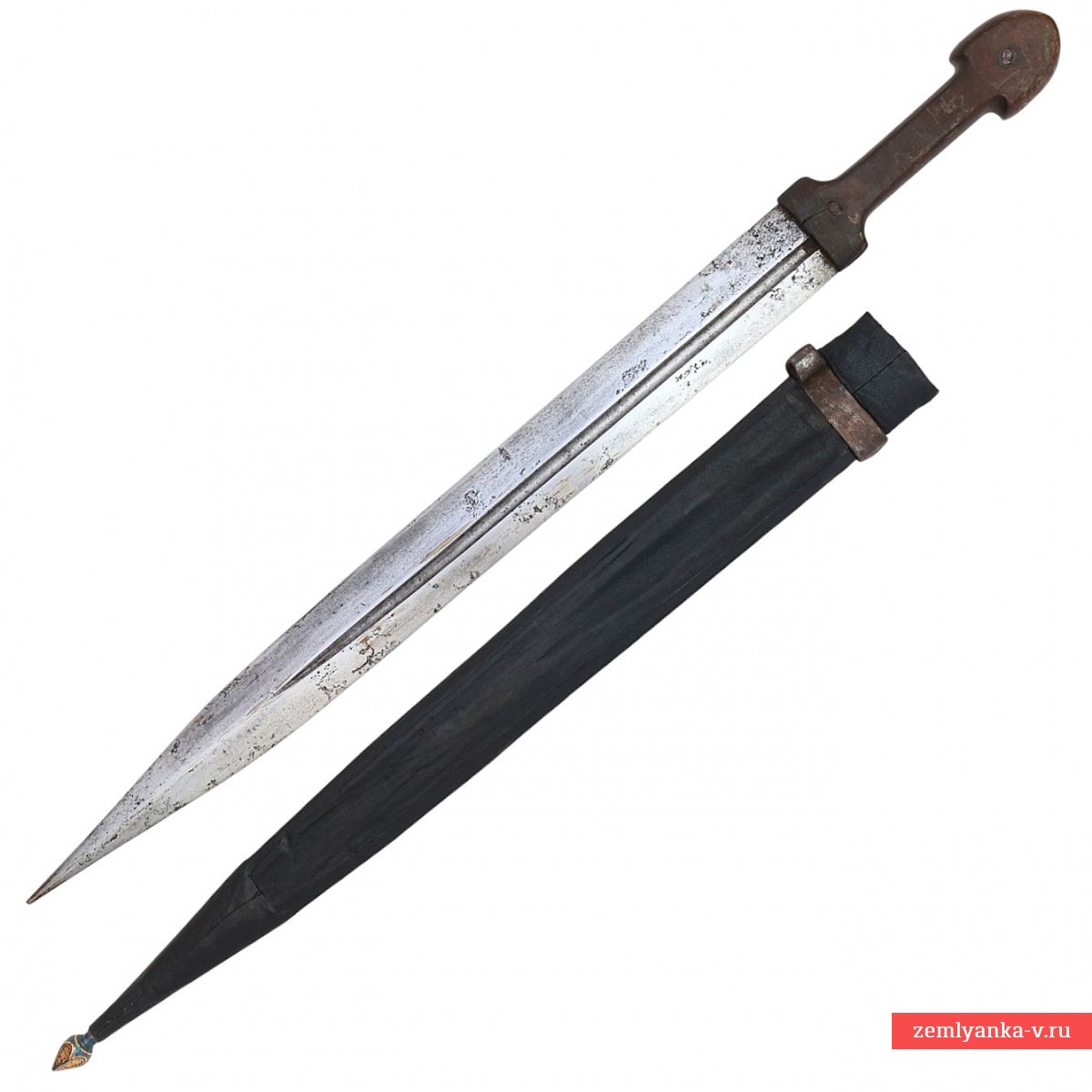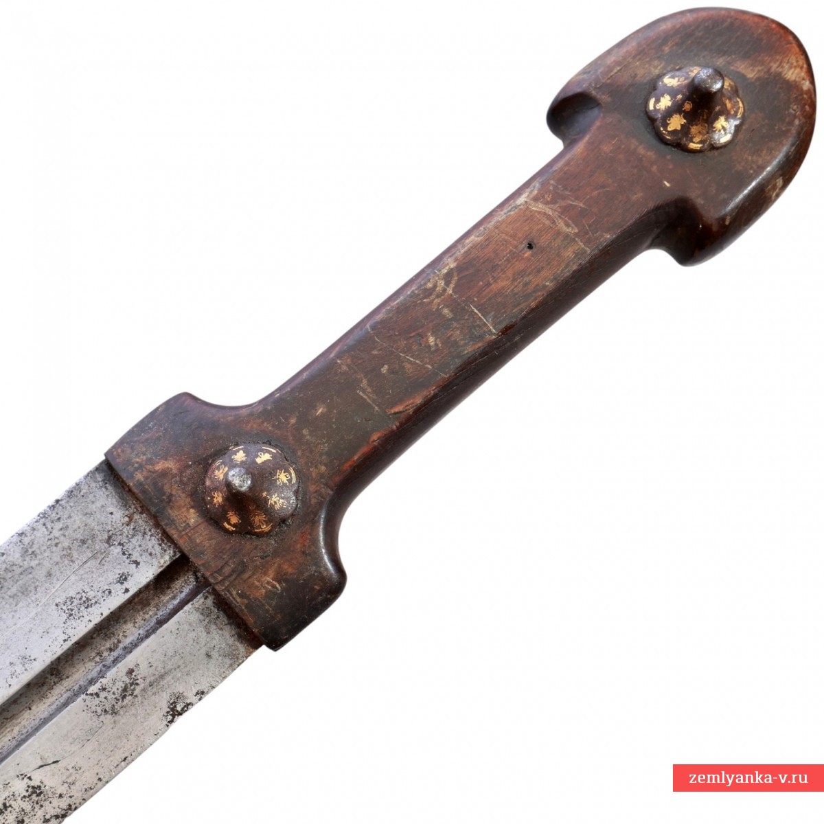Оригинальный кинжал в хорошем коллекционном состоянии. Клинок стальной, прямой, двулезвийный, с одним узким долом, незначительно смещенным от центра. Вдоль дола иглой нанесена арабская надпись. Рукоять роговая (?), состоит из двух щечек, укрепленных на хвостовике клинка при помощи двух заклепок. С наружной стороны заклепки прикрыты фигурными конусовидными накладками, украшенными таушировкой золотом. Аналогичный декор нанесен на скобу и шарик ножен. Ножны деревянные, обтянутые кожей (кожа более поздняя). Гарантия подлинности.