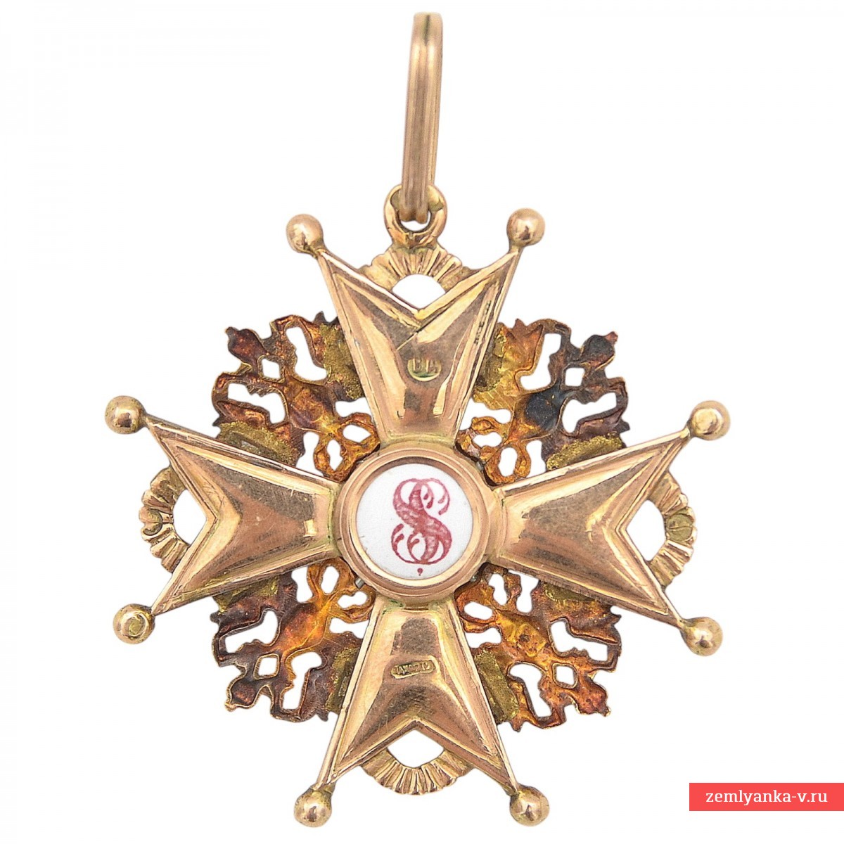 Оригинальный орден в хорошем состоянии. Золото 56 пробы, эмаль, гильоше, штамповка. Вес 12,3 грамм. Размеры 42*40 мм. Клейма на реверсе: «ВА» на верхнем луче, «Эдуардъ» на нижнем луче (изготовитель — художественная мастерская бриллиантовых, золотых и серебряных изделий «Эдуард» (Невский проспект, 10), основанная Эдуардом Фердинандовичем Дитвальдом (1868-1910), затем дело продолжили его жена — Вера Петровна и сын Владимир Дитвальд), «56» (проба золота, на ушке). Незначительные утраты зеленой эмали на листьях. Гарантия подлинности.