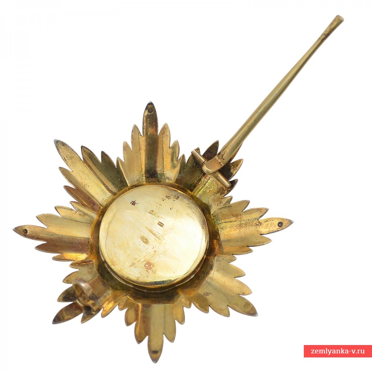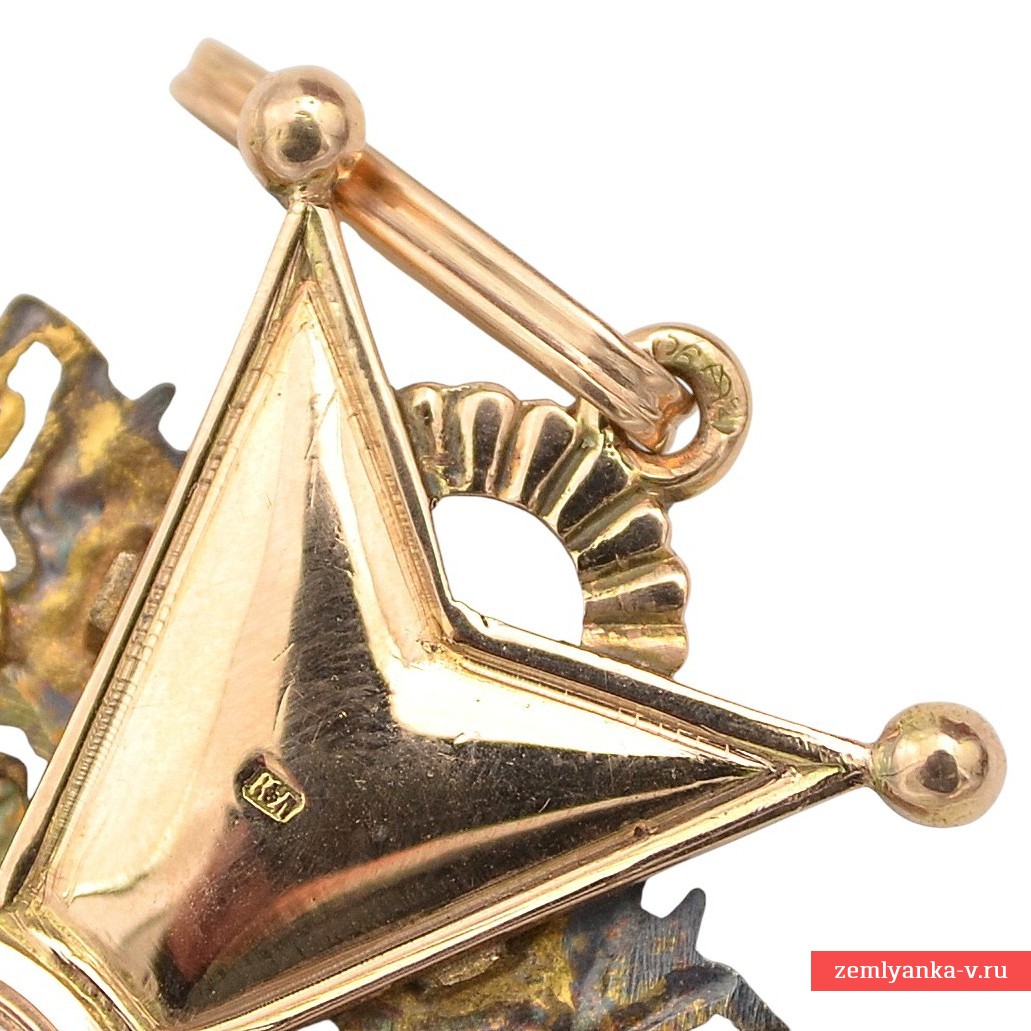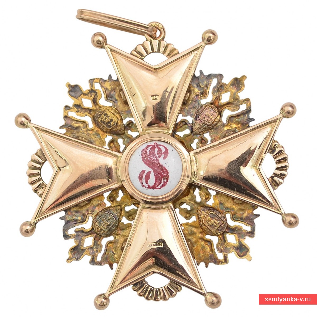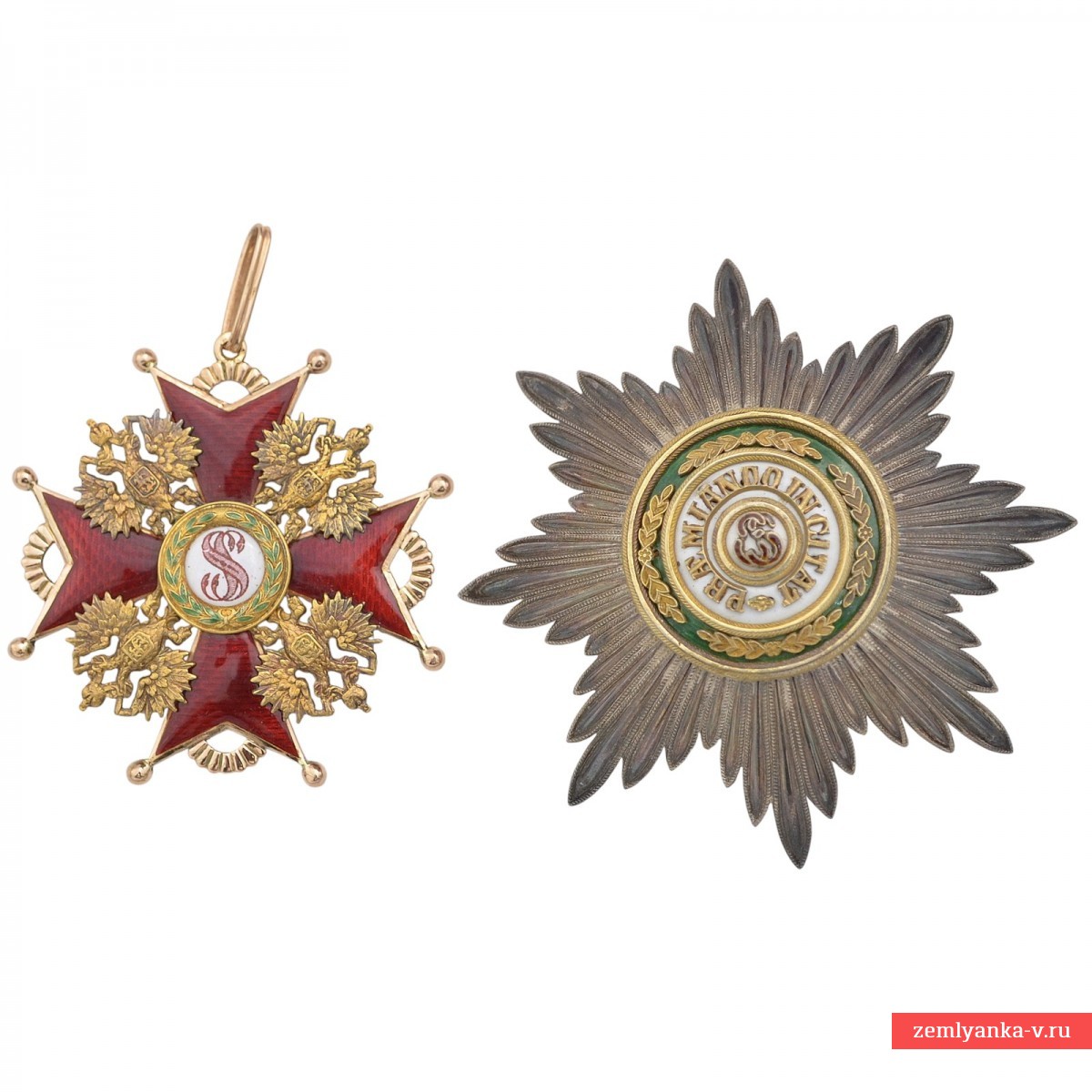 Комплект состоит из знака ордена Св. Станислава 1 ст. и звезды к нему. Оба элемента лота в прекрасном коллекционном состоянии. Звезда — серебро 84 пробы, позолота, эмаль. Орден – золото 56 пробы, эмаль. Вес ордена 29,8 грамм. Размеры 63*65 мм. Вес звезды 60,8 грамм. Размеры 87 мм по лучам. Редкий «выпуклый» тип звезды. Изготовитель художественная мастерская бриллиантовых, золотых и серебряных изделий «Эдуард» (Невский проспект, 10), основанная Эдуардом Фердинандовичем Дитвальдом (1868-1910), затем дело продолжили его жена — Вера Петровна и сын Владимир Дитвальд. Именник «ИА» принадлежал золотых дел мастеру Иоганну Густавовичу Аинстеду. Фирма «Эдуард» с января 1906 г. являлась поставщиком Капитула орденов. С фирмой «Эдуард» также сотрудничал В. Я. Динаков — петербургский серебряного дела цеховой мастер с именным клеймом «ВД».В подобной сохранности редкость. Гарантия подлинности.