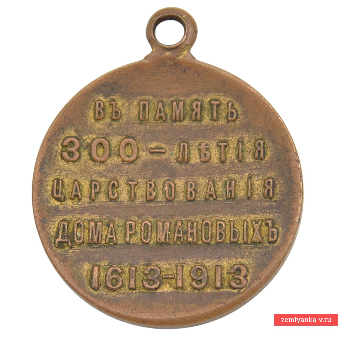 Бронза, золочение; штамповка. Хорошее коллекционное состояние. На лицевой стороне медали — погрудные портреты (в три четверти) императора Николая II в форме 4-го лейб-гвардии императорской фамилии стрелкового полка и царя Михаила Фёдоровича в бармах и шапке Мономаха. По окружности медали — бусы из чередующихся точек и чёрточек. На оборотной стороне медали надпись: «В память | 300-летия | царствования | дома Романовых | 1613—1913». Высокий и очень четкий рельеф букв и изображений. В комплекте оригинальная лента в отличном состоянии. Гарантия подлинности.