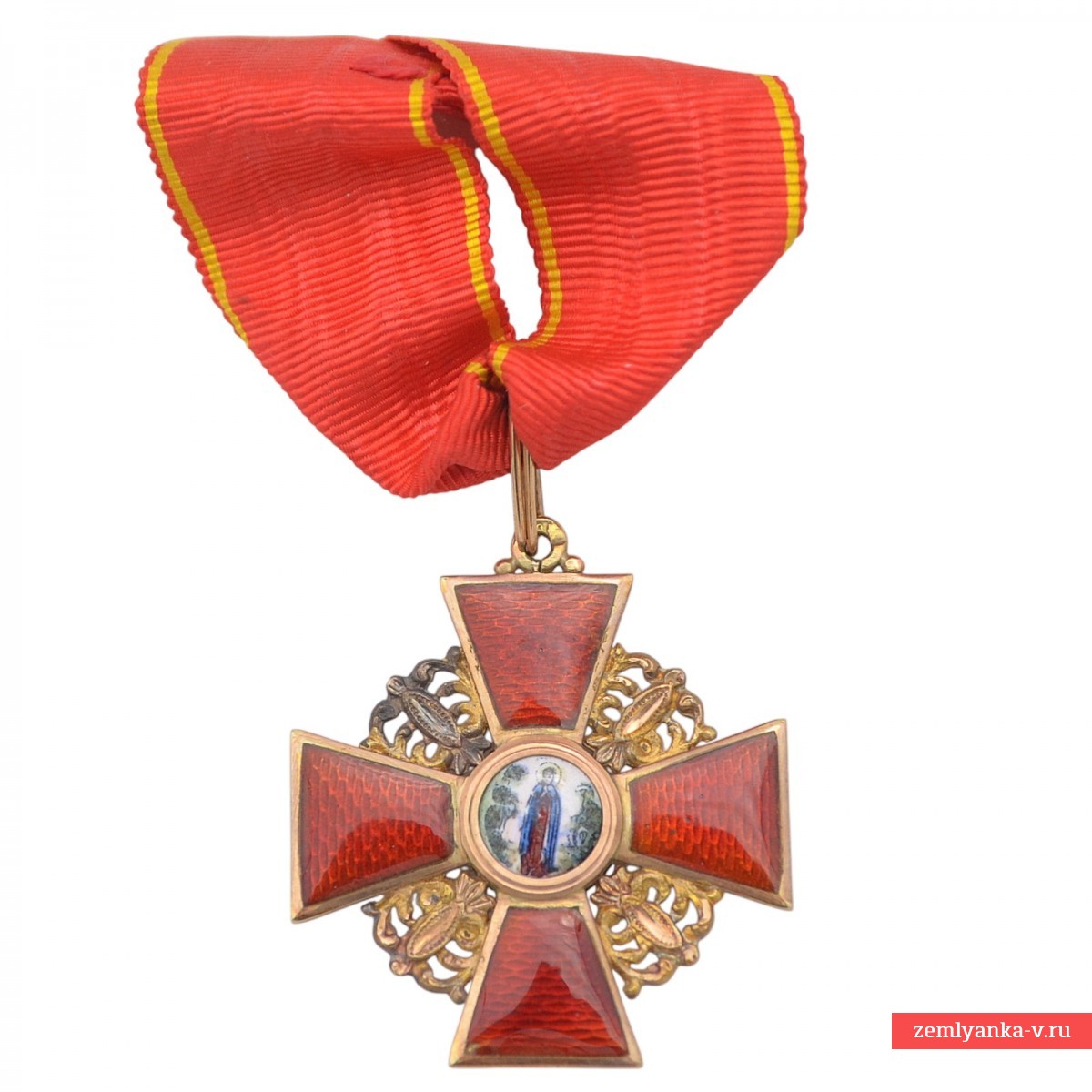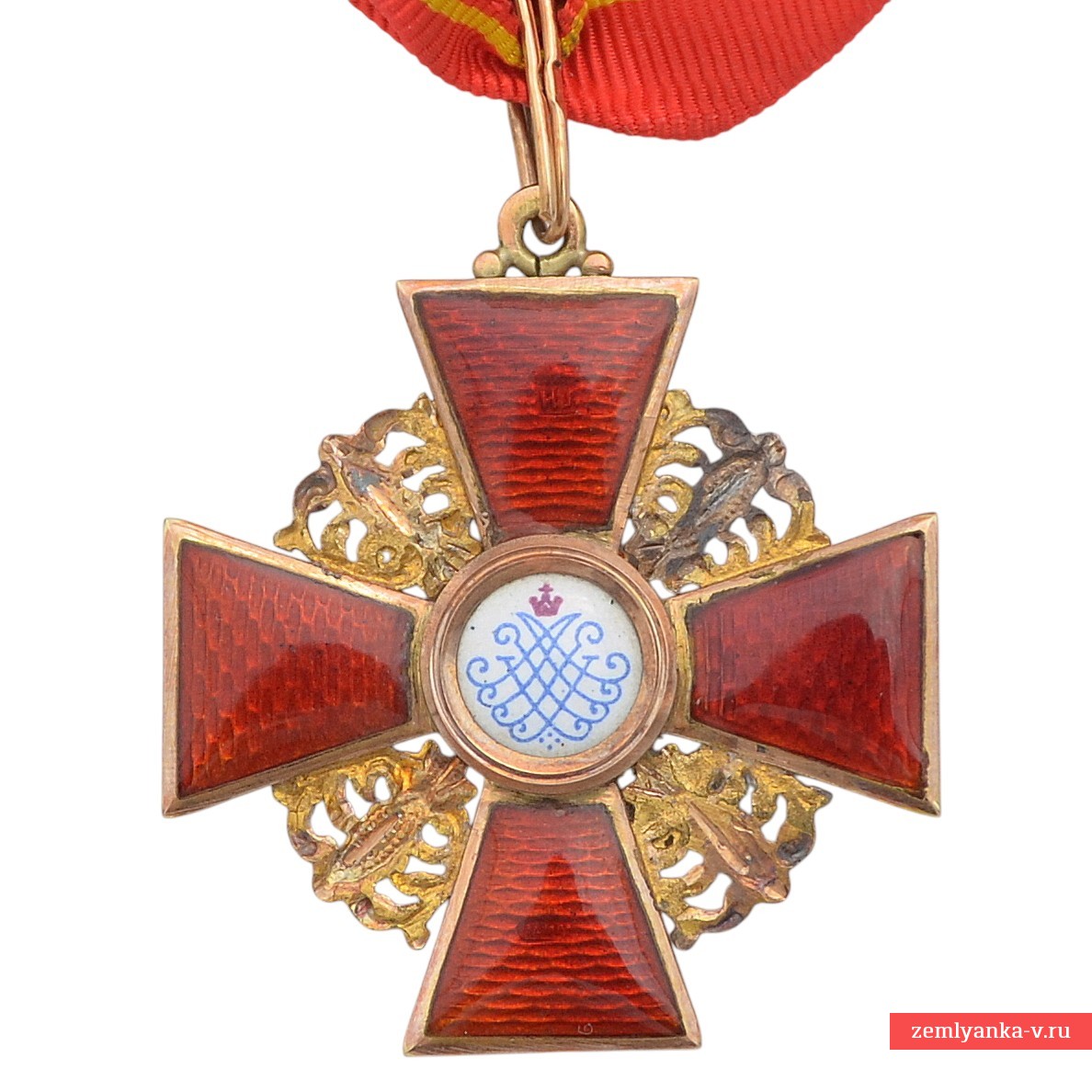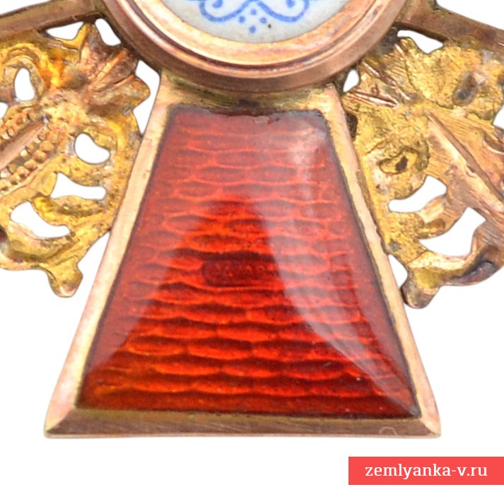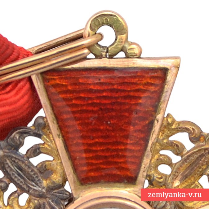 Оригинальный орден в прекрасном коллекционном состоянии. Золото, гильоше, эмаль. Размер 36*40 мм. Вес с лентой 8,7 грамм. Знак представляет собой равноконечный крест, с перекрещенными средневековыми мечами на фоне пластин с ажурной орнаментации и ушка с промежуточным кольцом. По центру аверса в округлом медальоне помещено изображение Святой Анны с нимбом вокруг головы, на фоновом плане в виде двух пальм и двух гор (стилизация Иосафатовой долины). На реверсе по центру в округлом эмалевом медальоне помещено изображение монограммы, состоящей из четырех латинских букв «AFIP» ( «ANNA FILIA IMPERATORIS PETRUS» — «АННА ДОЧЬ ИМПЕРАТОРА ПЕТРА»). Клейма на реверсе: «ИЛ» на верхнем луче (именное клеймо Иоганна Линдстедта — главного ювелира фирмы «Эдуард» до 1911 года), «Эдуардъ» на нижнем луче (изготовитель — художественная мастерская бриллиантовых, золотых и серебряных изделий «Эдуард» (Невский проспект, 10), основанная Эдуардом Фердинандовичем Дитвальдом (1868-1910), затем дело продолжили его жена — Вера Петровна и сын Владимир Дитвальд), «56» (проба золота, на ушке). В комплекте оригинальная лента. Гарантия подлинности.