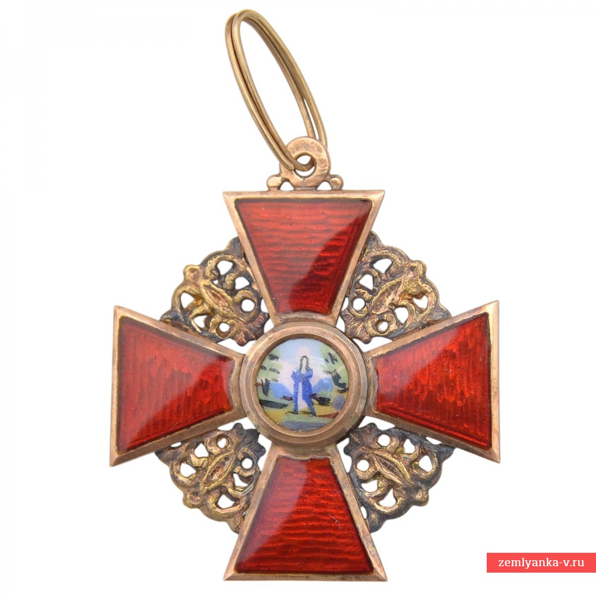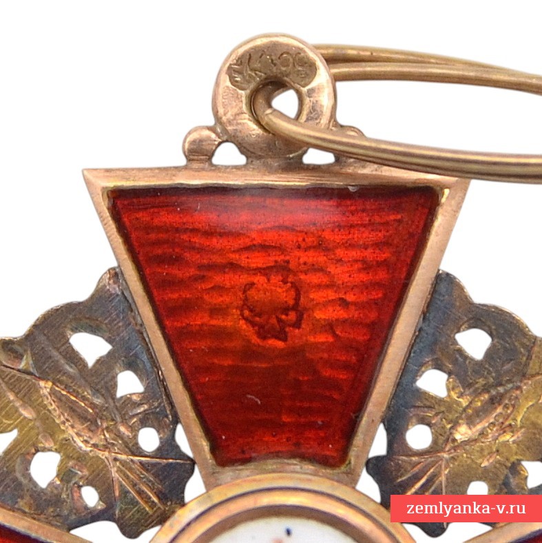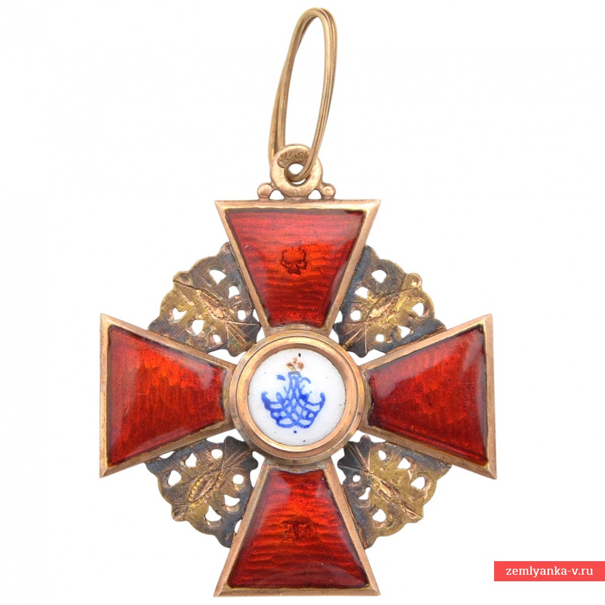 Оригинальный орден в прекрасном коллекционном состоянии. Золото, гильоше, эмаль. Знак представляет собой равноконечный крест, с перекрещенными средневековыми мечами на фоне пластин с ажурной орнаментации и ушка с промежуточным кольцом. По центру аверса в округлом медальоне помещено изображение Святой Анны с нимбом вокруг головы, на фоновом плане в виде двух пальм и двух гор (стилизация Иосафатовой долины). На реверсе по центру в округлом эмалевом медальоне помещено изображение монограммы, состоящей из четырех латинских букв «AFIP» ( «ANNA FILIA IMPERATORIS PETRUS» — «АННА ДОЧЬ ИМПЕРАТОРА ПЕТРА»). Клеймо на нижнем луче «АК», на верхнем – российский двуглавый орел. Клейма на ушке пробирное 56. Изготовитель – фирма «Keibel» — официальный поставщик Капитула с 1836 по 1905 г. С 1836 по 1862 г. (до 1854 г. совместно с Генрихом Вильгельмом Кеммерером) ею владел Иоганн Вильгельм Кейбель (1788 — 1862). После смерти И.В. Кейбеля поставщиком стал его сын, Юлиус Кейбель (1852 — 1882), а в 1882 — 1905 гг. им был внук И.В. Кейбеля, Альберт Кейбель (1854 — 1910). Сохранность отличная. В комплекте оригинальная лента и футляр. Гарантия подлинности.
