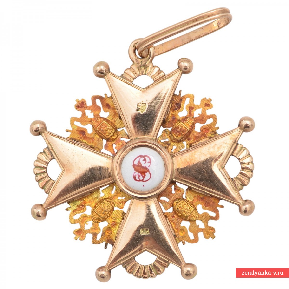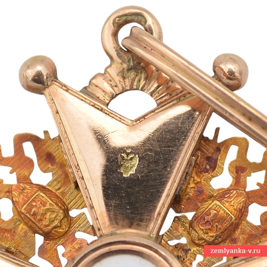 Золото 56 пробы, эмаль, гильоше, штамповка. Клеймо на нижнем луче «АК», на верхнем – российский двуглавый орел. Клейма на ушке пробирное 56. Изготовитель – фирма «Keibel» — официальный поставщик Капитула с 1836 по 1905 г. С 1836 по 1862 г. (до 1854 г. совместно с Генрихом Вильгельмом Кеммерером) ею владел Иоганн Вильгельм Кейбель (1788 — 1862). После смерти И.В. Кейбеля поставщиком стал его сын, Юлиус Кейбель (1852 — 1882), а в 1882 — 1905 гг. им был внук И.В. Кейбеля, Альберт Кейбель (1854 — 1910). Вес 19,5 грамм. Размер 47*50 мм. Сохранность отличная. Гарантия подлинности.