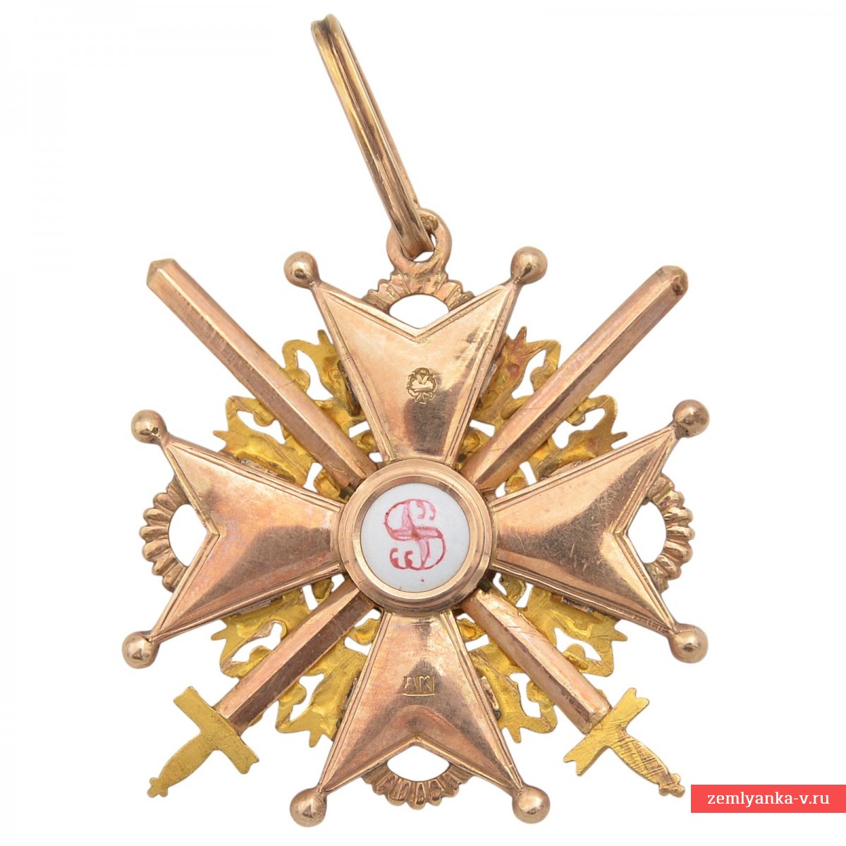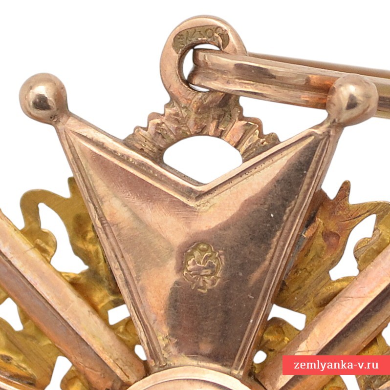 Оригинальный и очень редкий орден. Золото 56 пробы, эмаль, гильоше, штамповка. Вес 25,6 грамм. Размеры 48*50 мм. Клеймо на нижнем луче «АК», на верхнем – российский двуглавый орел. Клейма на ушке пробирное 56. Изготовитель – фирма «Keibel» — официальный поставщик Капитула с 1836 по 1905 г. С 1836 по 1862 г. (до 1854 г. совместно с Генрихом Вильгельмом Кеммерером) ею владел Иоганн Вильгельм Кейбель (1788 — 1862). После смерти И.В. Кейбеля поставщиком стал его сын, Юлиус Кейбель (1852 — 1882), а в 1882 — 1905 гг. им был внук И.В. Кейбеля, Альберт Кейбель (1854 — 1910). Сохранность отличная. Гарантия подлинности.