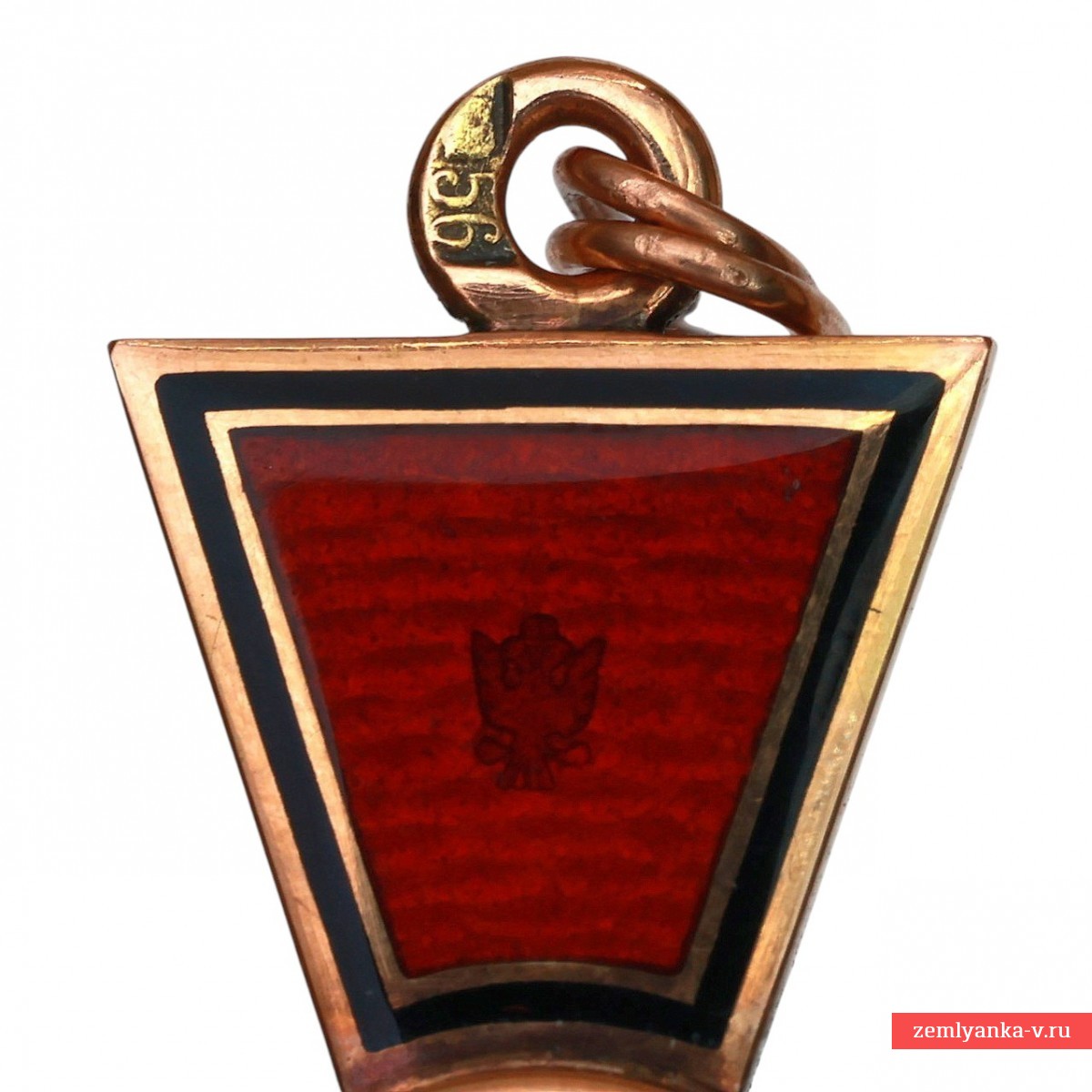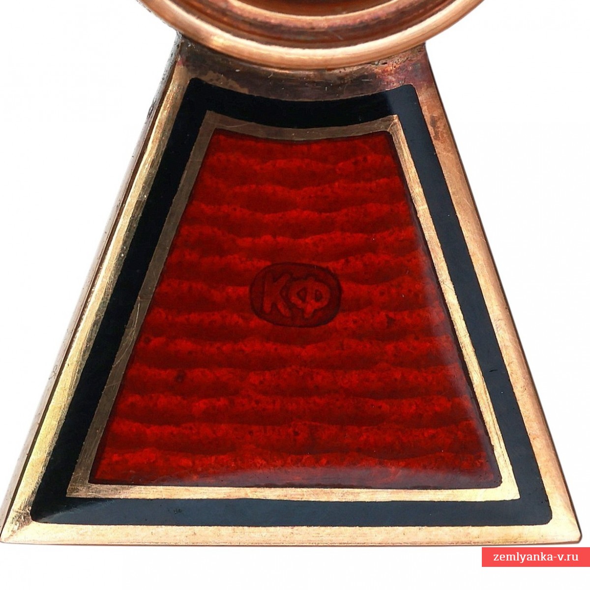 Оригинальный и крайне редкий орден в отличном состоянии. Золото 56 пробы, гильоше, эмаль. Вес 9,55 гр. Размер 35*40 мм. Знак выполнен в форме равноконечного креста, с ушком и промежуточным кольцом. На аверсе и реверсе по центру помещены изображения российского двуглавого орла. В нижней лопасти креста под эмалевым наслоением нанесена аббревиатура «КФ» в овале (Карл Фаберже). Гарантия подлинности.