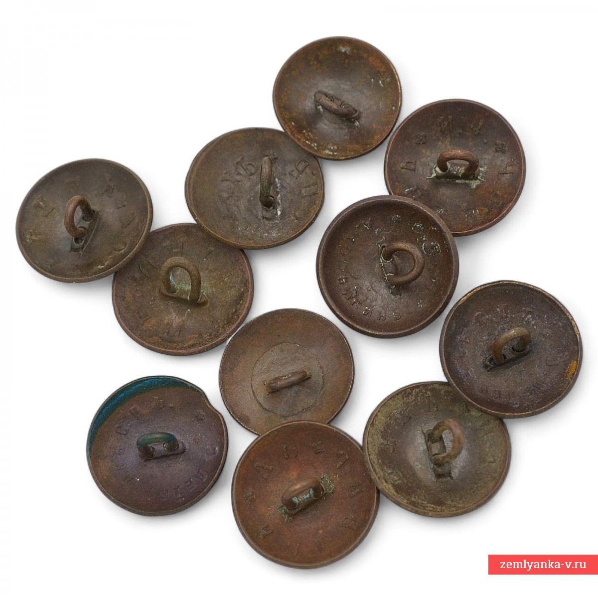Лот включает в себя 11 пуговиц. Клейма «БУХ» и «КОПЕЙКИНЪ». Латунь, штамповка. Сохранность очень хорошая. Гарантия подлинности.