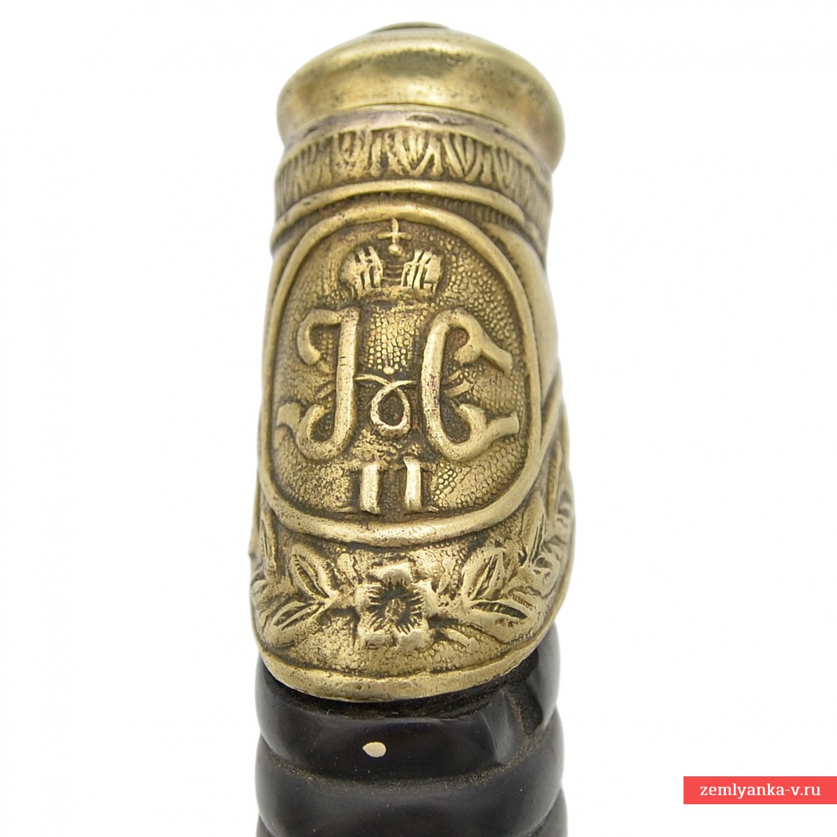 Эфес состоит из рукояти и гарды. Рукоять бакелитовая, с поперечными желобками. Внизу на рукояти расположена гладкая фигурная латунная втулка. Навершие рукояти латунное, стаканчиком, с оттянутым вдоль спинки язычком и овальным выпуклым завершением в виде навинчивающейся на хвостовик крышечки. Навершие декорировано литой высоко-рельефной композицией, включающей в себя: в центральной части – овальный медальон со вписанной монограммой «Н II» под короной на псевдоканфаренном фоне (вензель императора России Николая II (1894-1917 гг.), в царствование которого владелец шашки получил свой первый офицерский чин); вдоль верхнего края – узкий поясок растительно-геометрического орнамента; вдоль нижнего края – изображение цветка с исходящими от него в обе стороны (влево и вправо) лавровыми ветвями. Гарда образована одной передней дужкой, исходящей от навершия и, плавно изгибаясь, переходящей в узкую крестовину, конец которой загнут в сторону клинка и имеет круглое сквозное отверстие для крепления темляка. В центральной части с обеих сторон передняя дужка декорирована высокорельефными литыми изображениями широкого пояска и лавровых ветвей в линейной окантовке, исходящих от него в обе стороны (вверх и вниз). На крестовине снизу имеется клеймо фабрики «Слава Москва». Металлическая фабрика офицерских принадлежностей и бронзовых изделий. Основана николаевским купцом Яковом Абрамовичем Бирштейном в 1907 году. Находилась в Москве по адресу: Лефортовская часть, Ирининская улица, № 51, дом Гребе. На фабрике изготавливались кокарды, мундирные пуговицы, различные надписи, изделия художественной бронзы. Также штамповались поясные бляхи для армии, казенных и частных железных дорог, учебных заведений. Продукция маркировалась клеймом «Слава-Москва». Фирма имела фабрично-торговые склады по адресу: Верхние ряды, 28-50.