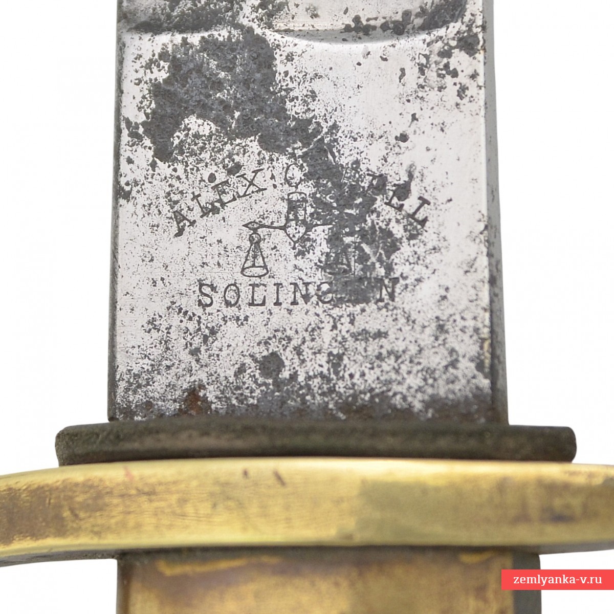 Клинок стальной, незначительной кривизны, однолезвийный, с одним широким долом с обеих сторон. Боевой конец двулезвийный. Клинок украшен травлёными орнаментами в виде ленты с надписью «Solingen» и растительных орнаментов. На пяте клинка слева нанесено изображение весов и надпись «ALEX. COPPEL SOLINGEN» — клеймо немецкой фирмы «Алекс Коппель», Золинген. Фирма основана в 1821 году, зарегистрирована в 1862 году, прекратила существование в 1956 году. До начала 1870-х гг. производила в основном столовые приборы, затем начала массовое производство холодного оружия и штыком. Украшенное оружие этой фирмы неоднократно удостаивалось медалей на международных выставках. С 1890-х гг. фирма занималась также производством велосипедов. Во время 1-й мировой войны снова выполняла большие заказы на производство холодного оружия. Во время 2-й мировой войны кроме шпаг и кинжалов изготавливала также штыки обр. 1884/98 гг. Холодное оружие этой фирмы использовались в разных странах мира. Буквенный код фирмы — fnj. S-код фирмы — S/173 — Coppel Gmbh — Alex Coppel GmbH, Solingen.