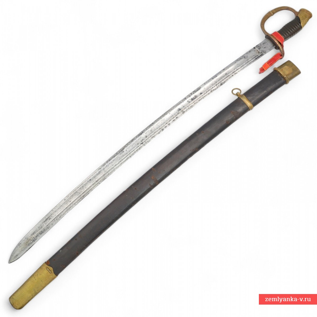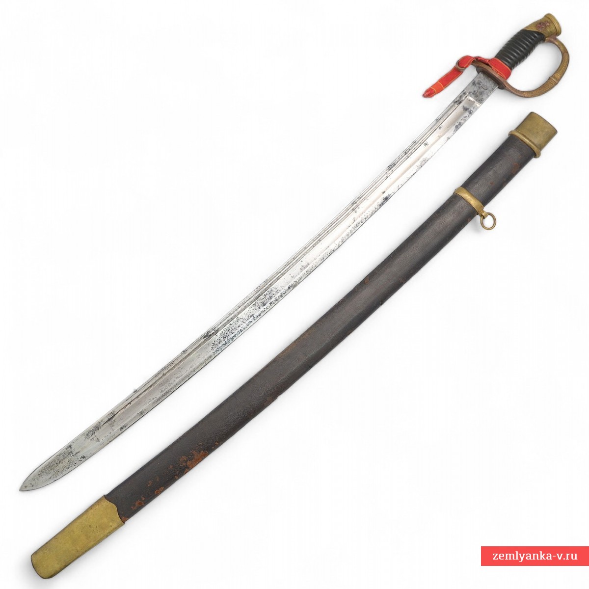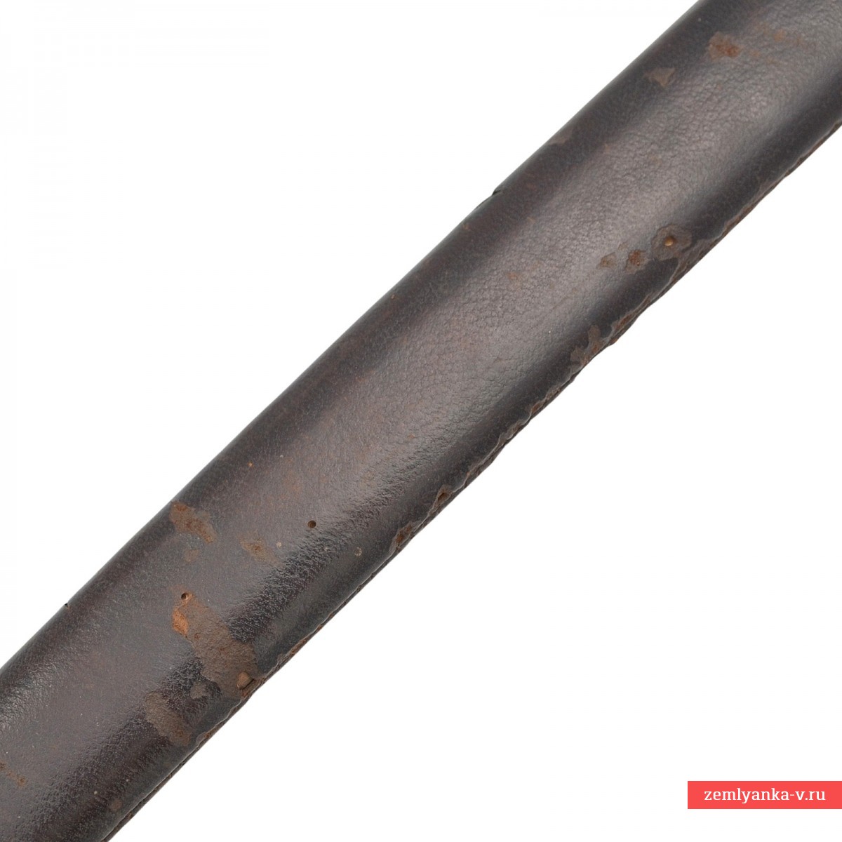 Ножны деревянные, обтянутые кожей; прибор ножен латунный, состоит из устья со скобой, обоймицы с подвижно закрепленным кольцом и наконечника в виде удлиненного стаканчика. Шашка комплектуется оборванной лентой темляка.