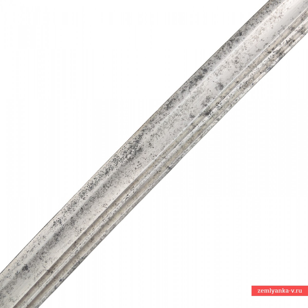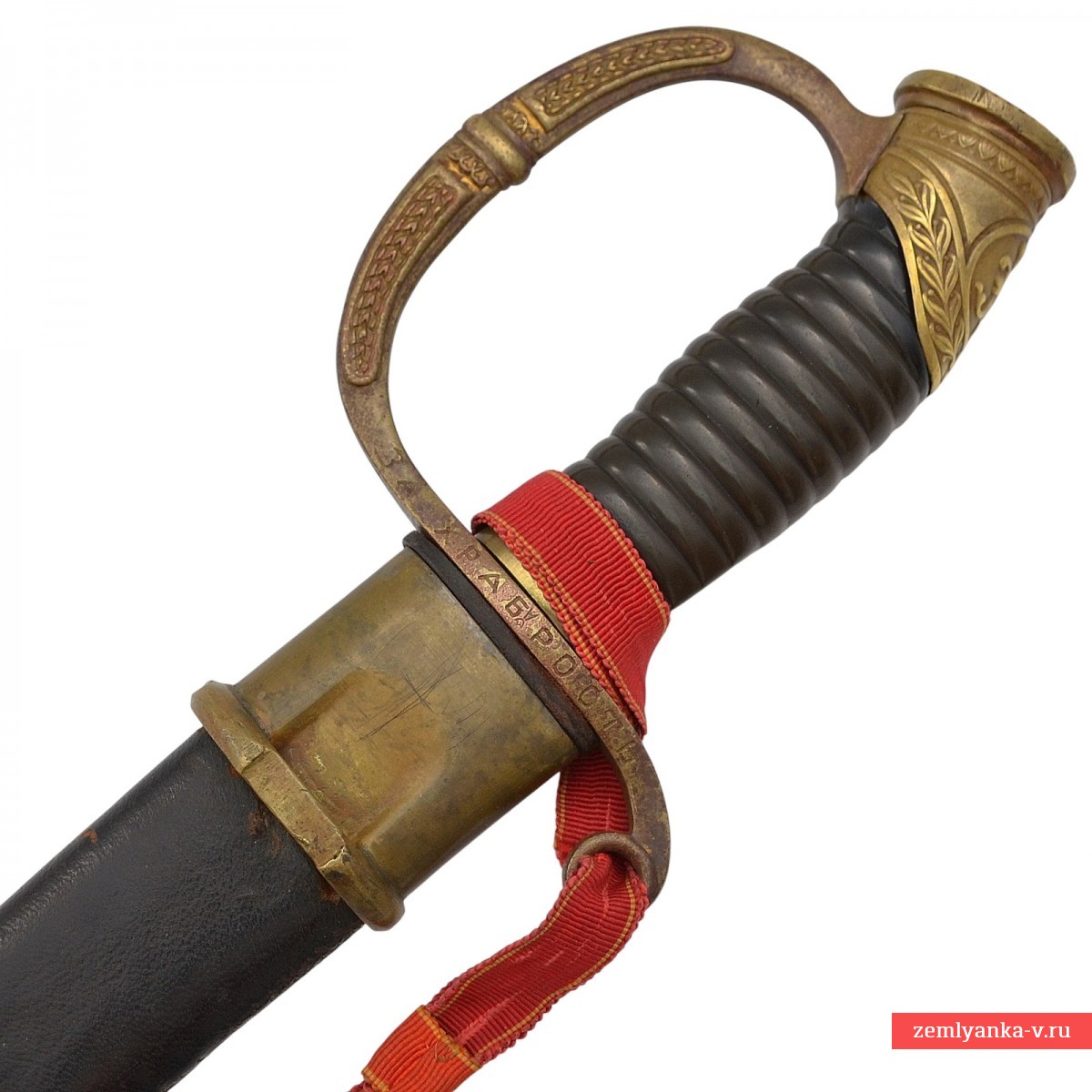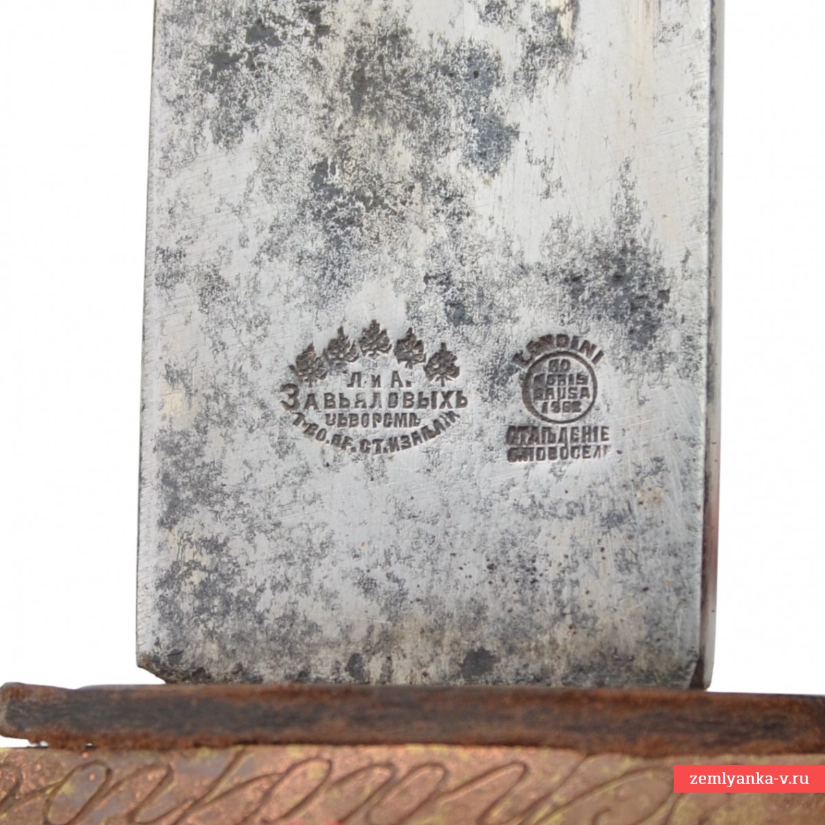 Достаточно интересная шашка с массивным клинком 1916 года, опубликованная в книге «Наградное оружие на фотопортретах русских офицеров». Клинок стальной, изогнутый, однолезвийный, с одним широким и двумя узкими долами с обеих сторон. Боевой конец двулезвийный.
