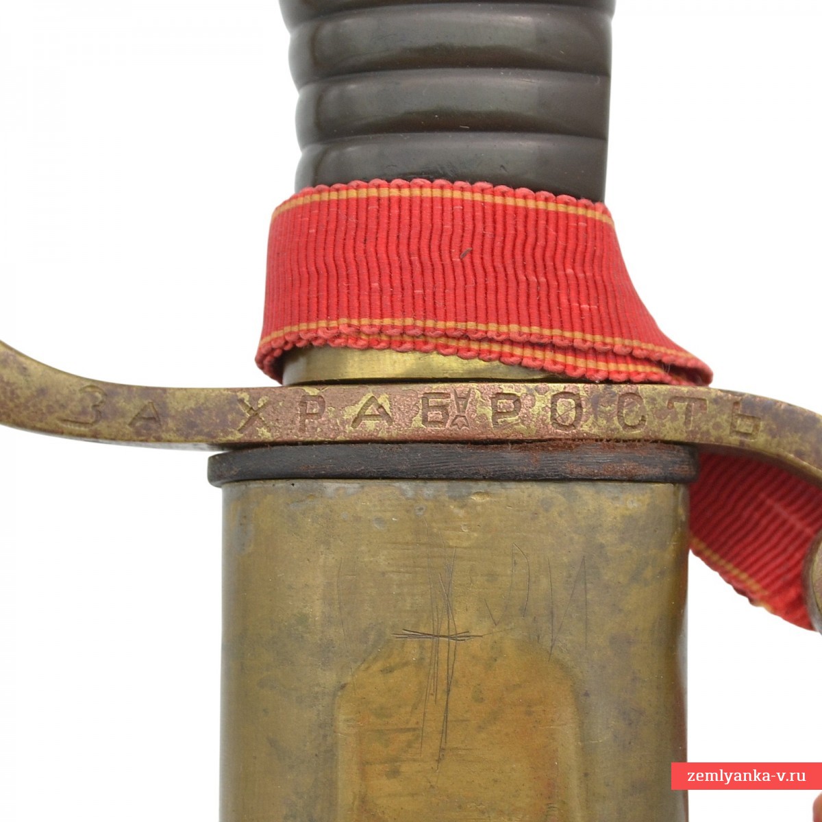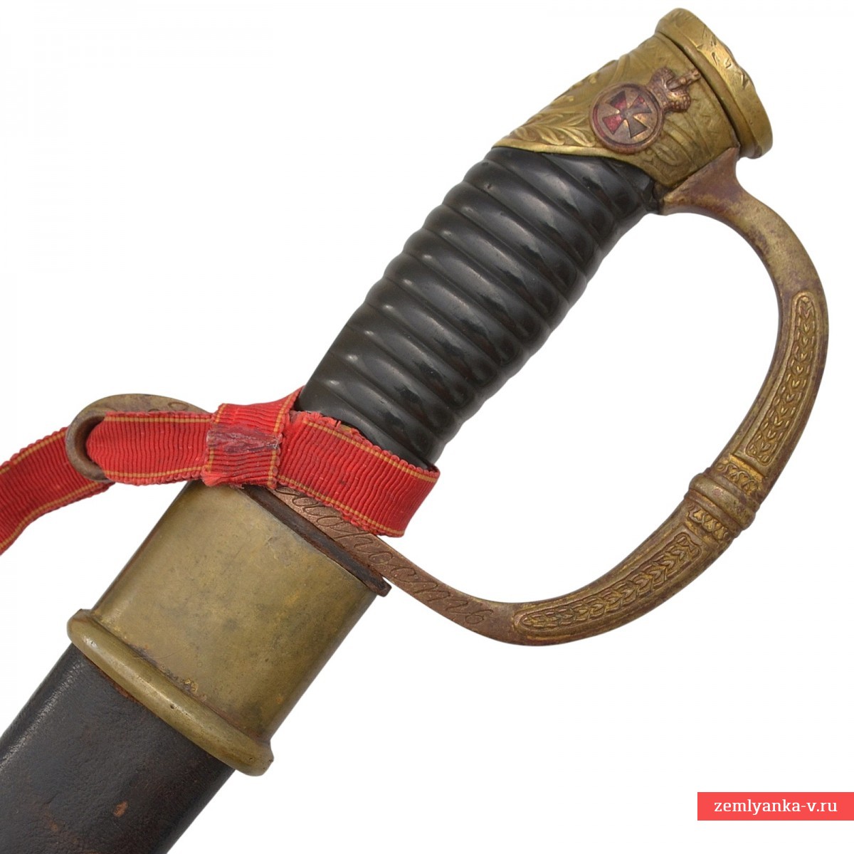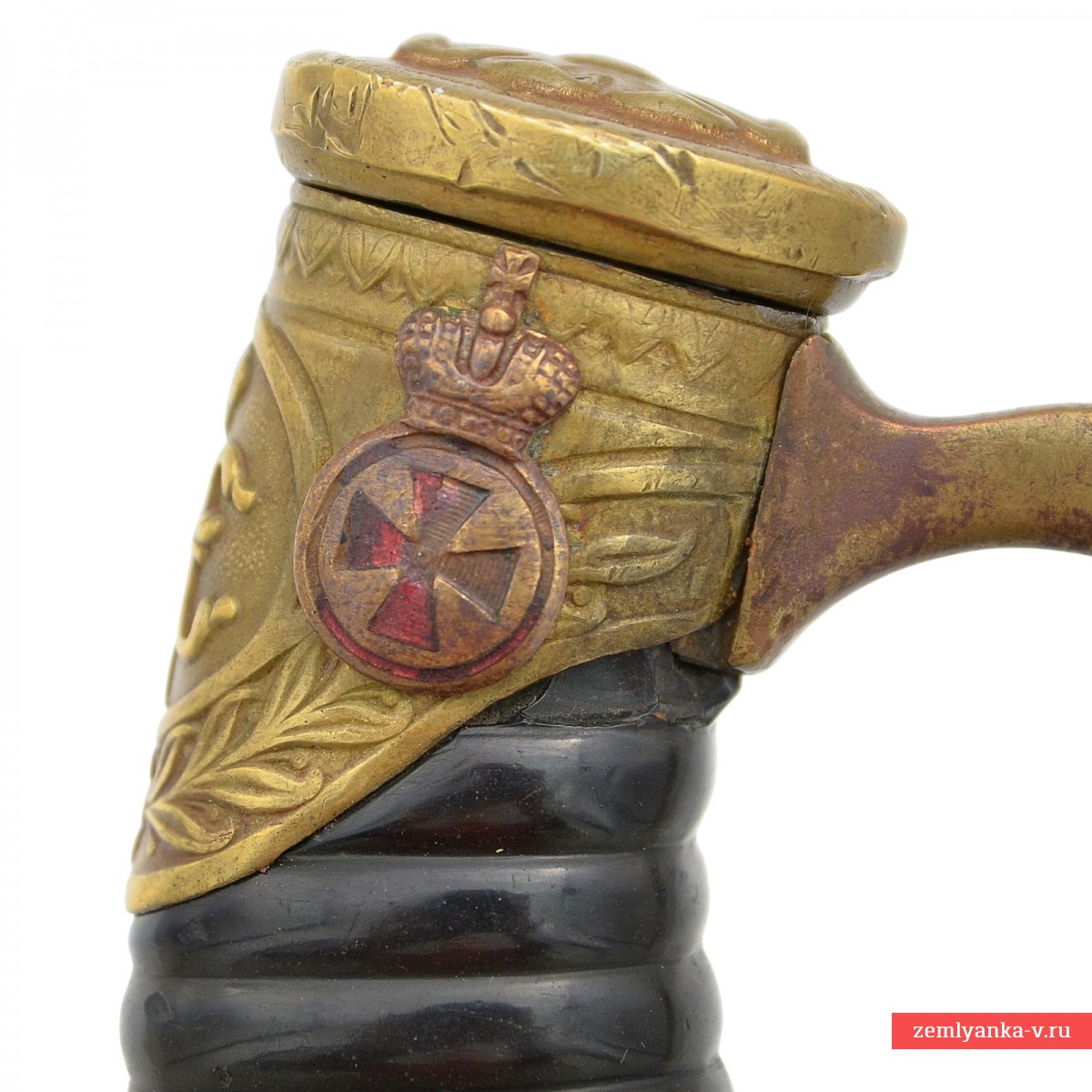Эфес состоит из рукояти и латунной гарды. Рукоять бакелитовая, овального сечения, с глубокими поперечными желобками, с небольшим расширением в средней части; верхняя часть черена отогнута в сторону клинка. Внизу на рукояти расположена гладкая фигурная латунная втулка. Навершие рукояти латунное, стаканчиком, с оттянутым вдоль спинки язычком и овальным выпуклым завершением в виде навинчивающейся на хвостовик крышечки. Навершие декорировано литой низкорельефной композицией, включающей в себя: в центральной части – овальный медальон с монограммой «Н II» под короной (вензель императора Российской империи Николая II, в годы правления которого владелец шашки получил свой первый офицерский чин); вдоль верхнего края – узкий поясок растительно-геометрического орнамента; вдоль нижнего края – изображение цветка с исходящими от него в обе стороны (влево и вправо) лавровыми ветвями. Фиксирует эфес и клинок латунная закрутка. На навершии сбоку слева установлен знак ордена Святой Анны 4-й степени. Гарда образована одной передней дужкой, исходящей от навершия и, плавно изгибаясь, переходящей в узкую крестовину, конец которой загнут в сторону клинка и имеет круглое сквозное отверстие для крепления темляка. В центральной части с обеих сторон передняя дужка декорирована высокорельефными литыми изображениями широкого пояска и лавровых ветвей в линейной окантовке, исходящих от него в обе стороны (вверх и вниз). На крестовине с обеих сторон нанесена надпись «За храбрость» разным шрифтом.