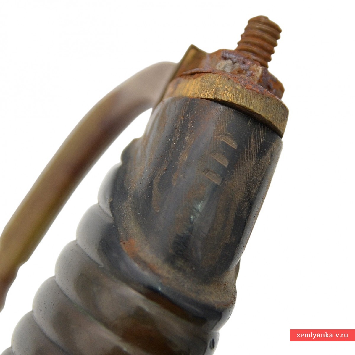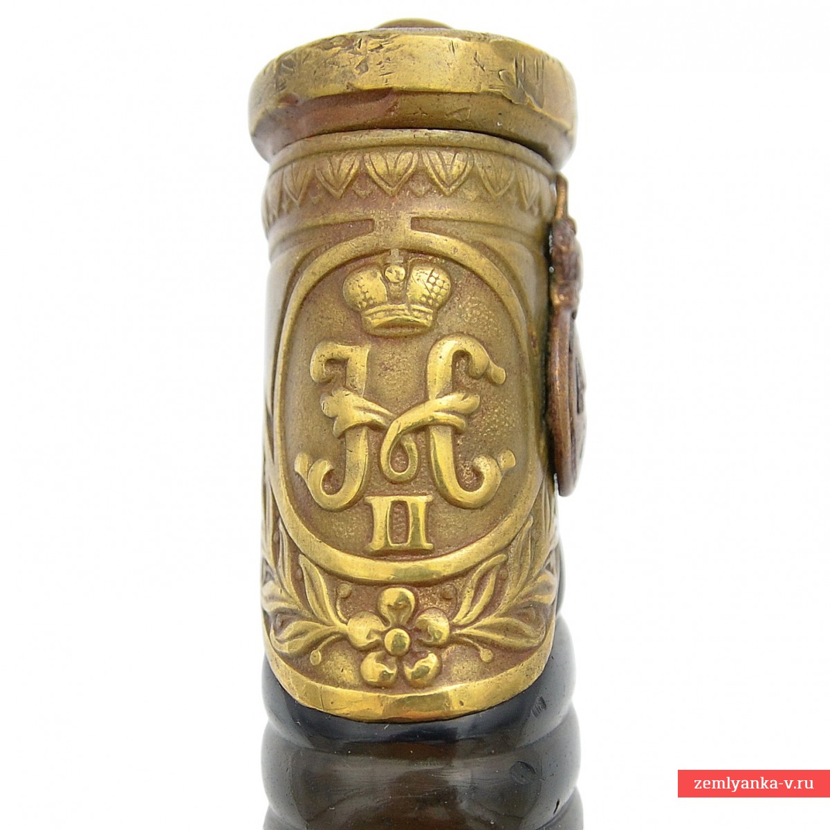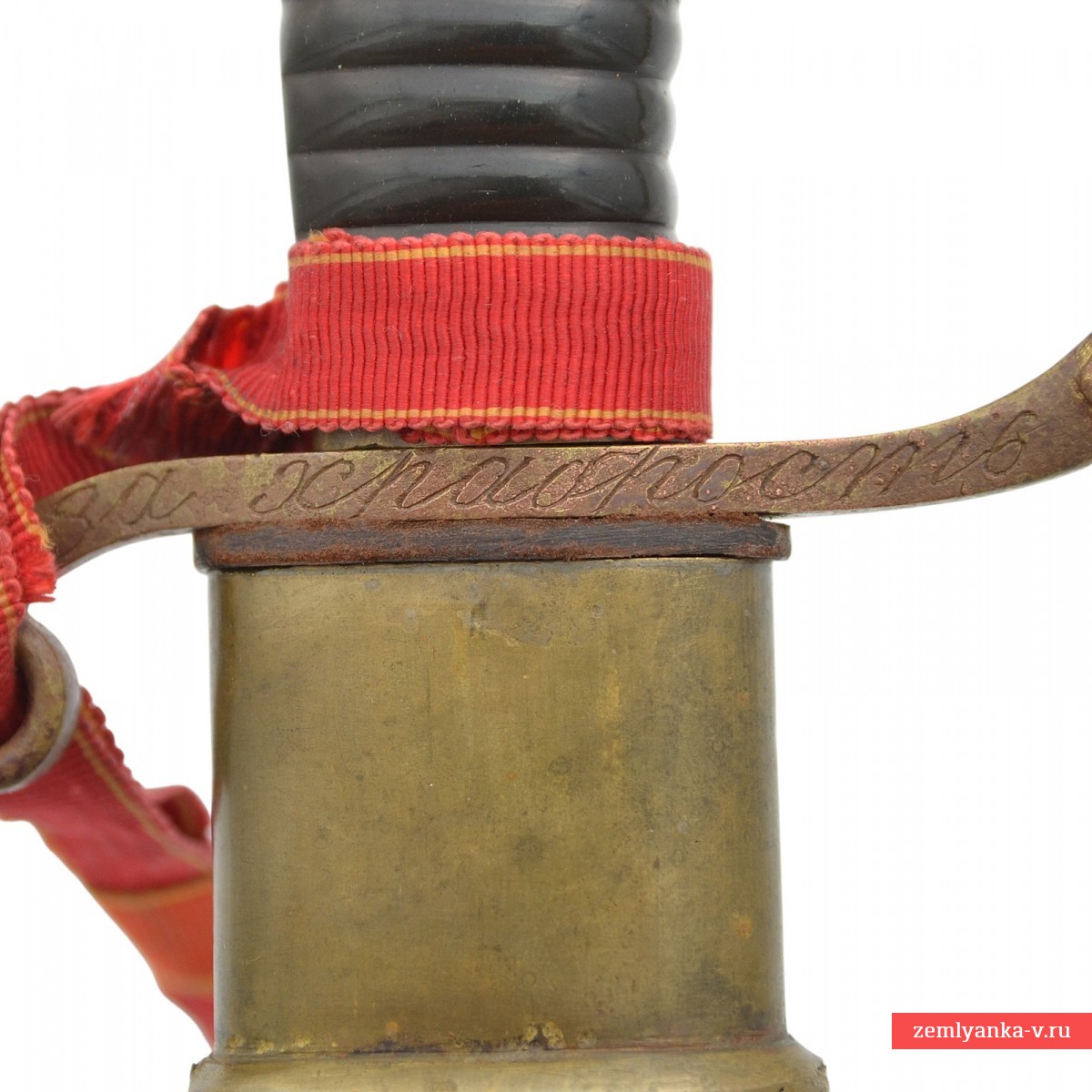 Эфес состоит из рукояти и латунной гарды. Рукоять бакелитовая, овального сечения, с глубокими поперечными желобками, с небольшим расширением в средней части; верхняя часть черена отогнута в сторону клинка. Внизу на рукояти расположена гладкая фигурная латунная втулка. Навершие рукояти латунное, стаканчиком, с оттянутым вдоль спинки язычком и овальным выпуклым завершением в виде навинчивающейся на хвостовик крышечки. Навершие декорировано литой низкорельефной композицией, включающей в себя: в центральной части – овальный медальон с монограммой «Н II» под короной (вензель императора Российской империи Николая II, в годы правления которого владелец шашки получил свой первый офицерский чин); вдоль верхнего края – узкий поясок растительно-геометрического орнамента; вдоль нижнего края – изображение цветка с исходящими от него в обе стороны (влево и вправо) лавровыми ветвями. Фиксирует эфес и клинок латунная закрутка. На навершии сбоку слева установлен знак ордена Святой Анны 4-й степени. Гарда образована одной передней дужкой, исходящей от навершия и, плавно изгибаясь, переходящей в узкую крестовину, конец которой загнут в сторону клинка и имеет круглое сквозное отверстие для крепления темляка. В центральной части с обеих сторон передняя дужка декорирована высокорельефными литыми изображениями широкого пояска и лавровых ветвей в линейной окантовке, исходящих от него в обе стороны (вверх и вниз). На крестовине с обеих сторон нанесена надпись «За храбрость» разным шрифтом.