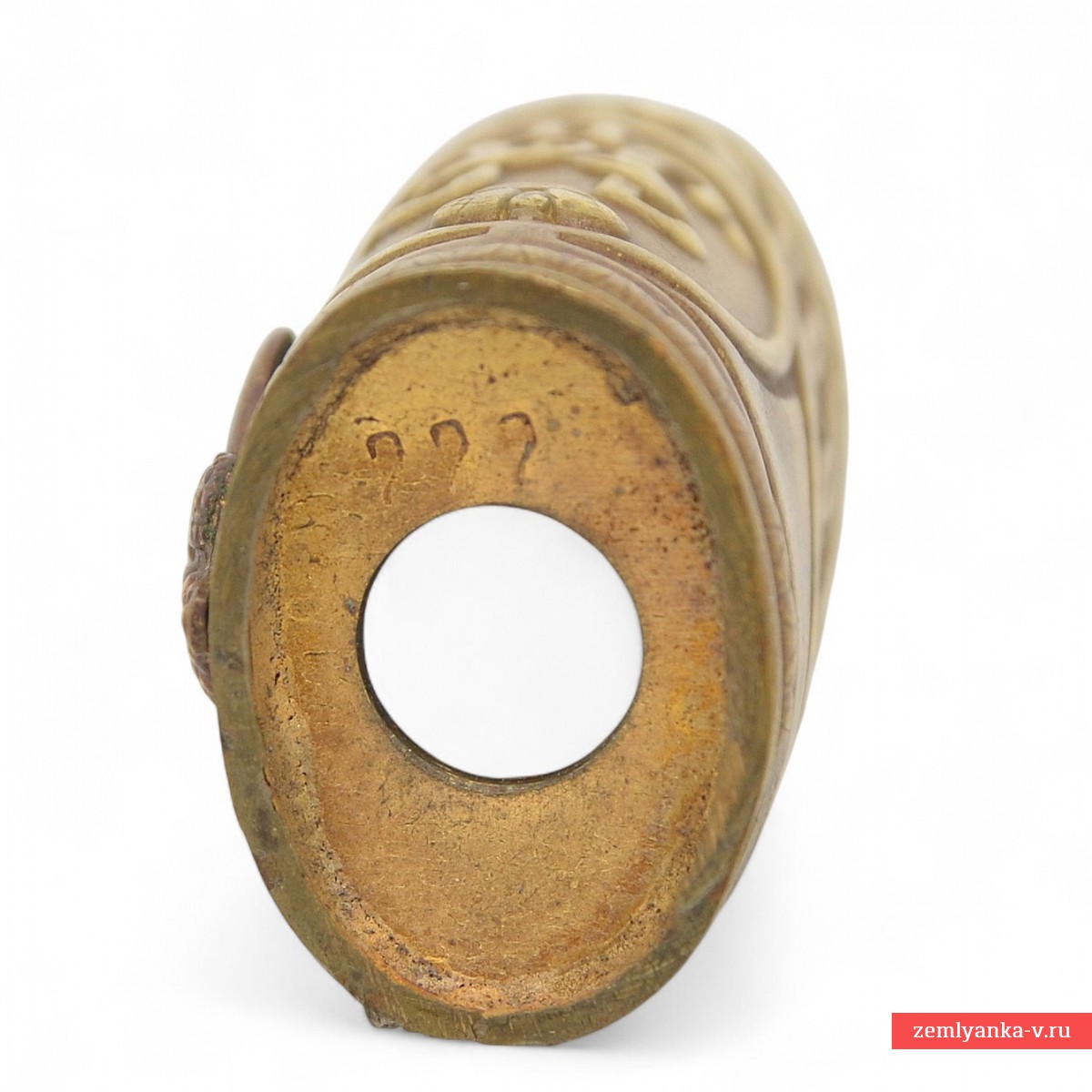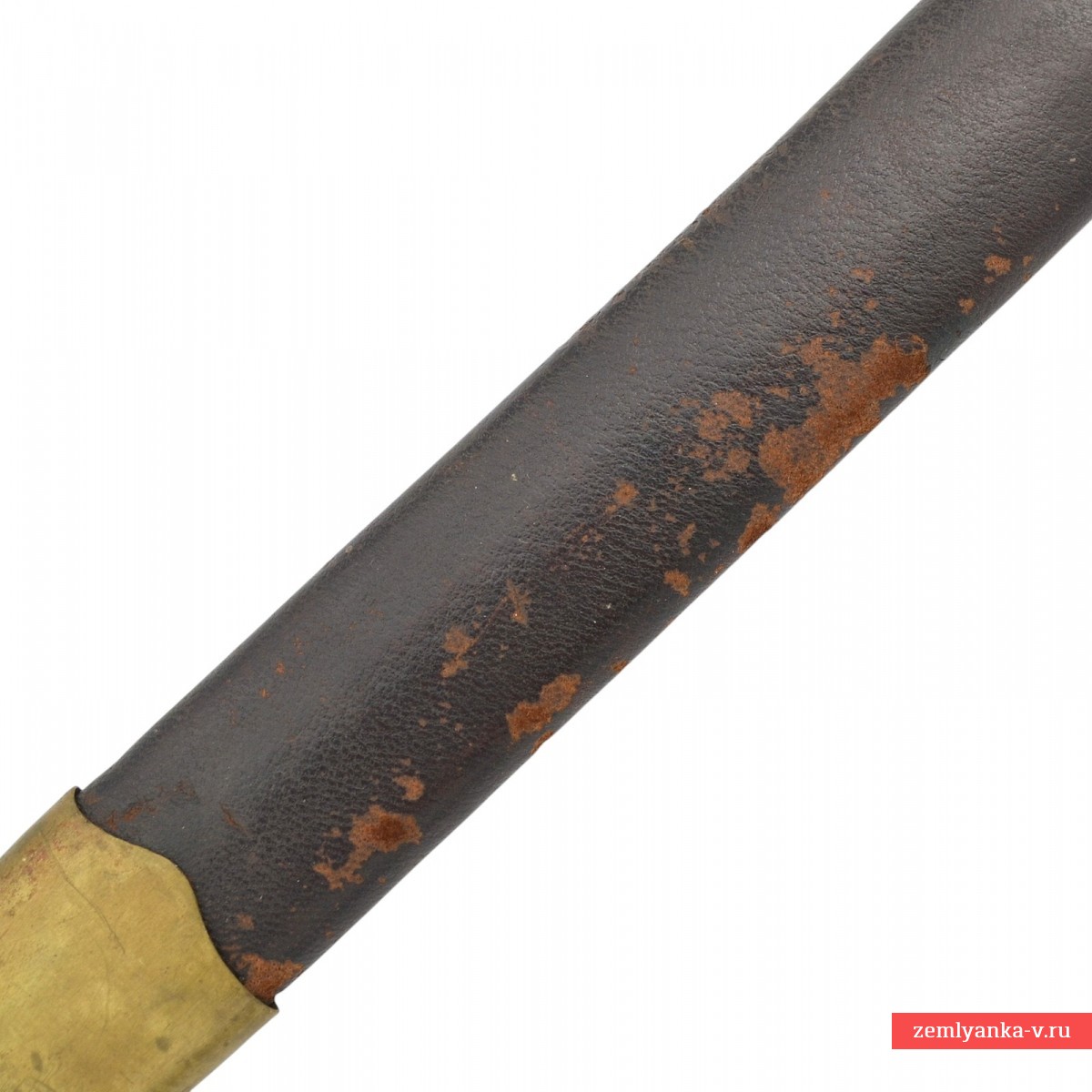 Предмет находится в неплохом коллекционном состоянии. Следы коррозии на клинке. Потёртости, следы бытования и коррозия на латунных деталях эфеса. Временная патина и следы бытования на приборе ножен. Царапины и утраты на коже ножен.