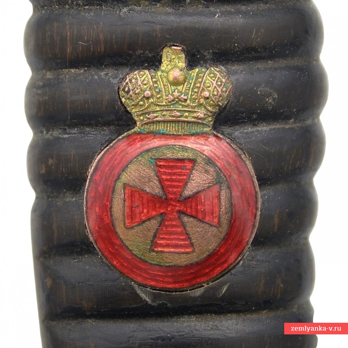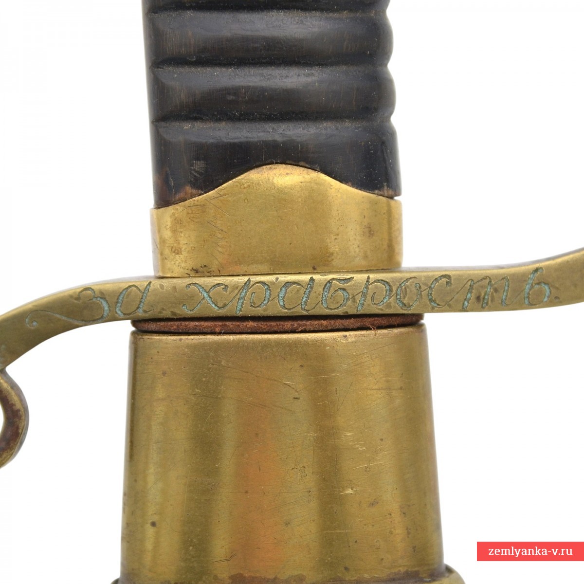 Эфес состоит из рукояти и латунной гарды. Рукоять изготовлена из массива рога, овального сечения, с глубокими поперечными желобками, с небольшим расширением в средней части; верхняя часть черена отогнута в сторону клинка. В центре рукояти установлен знак ордена Св. Анны 4 ст., изготовленный фирмой «Кейбель». Внизу на рукояти расположена гладкая фигурная латунная втулка. Навершие рукояти латунное, стаканчиком, с оттянутым вдоль спинки язычком и овальным выпуклым завершением в виде навинчивающейся на хвостовик крышечки. Навершие декорировано литой низкорельефной композицией, включающей в себя: в центральной части – овальный медальон с монограммой «Н II» под короной (вензель императора Российской империи Николая II, в годы правления которого владелец шашки получил свой первый офицерский чин); вдоль верхнего края – узкий поясок растительно-геометрического орнамента; вдоль нижнего края – изображение цветка с исходящими от него в обе стороны (влево и вправо) лавровыми ветвями. Фиксирует эфес и клинок латунная закрутка. Гарда образована одной передней дужкой, исходящей от навершия и, плавно изгибаясь, переходящей в узкую крестовину, конец которой загнут в сторону клинка и имеет круглое сквозное отверстие для крепления темляка. В центральной части с обеих сторон передняя дужка декорирована высокорельефными литыми изображениями широкого пояска и лавровых ветвей в линейной окантовке, исходящих от него в обе стороны (вверх и вниз). На крестовине с лицевой стороны нанесена надпись «За храбрость».