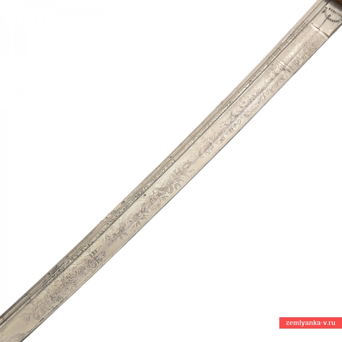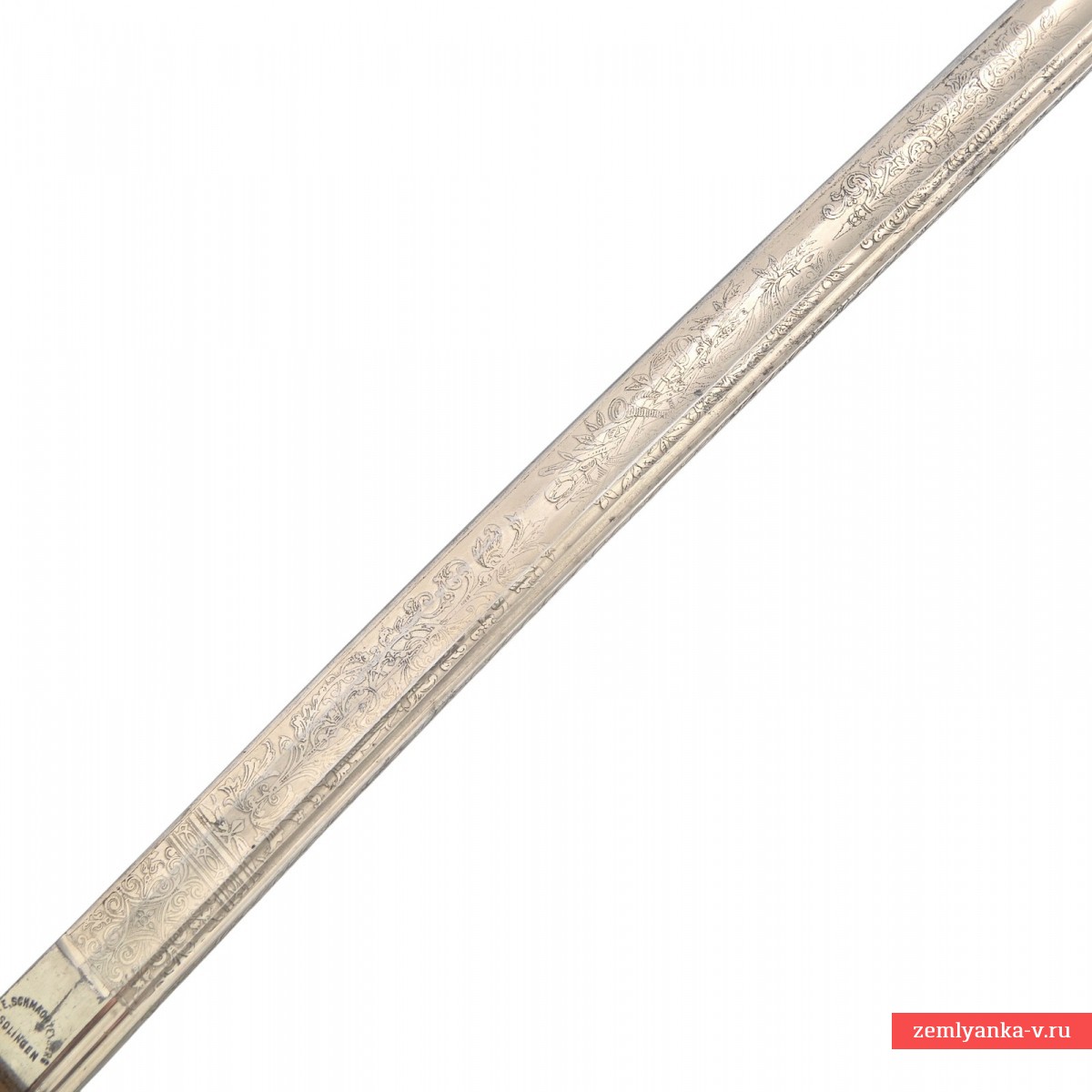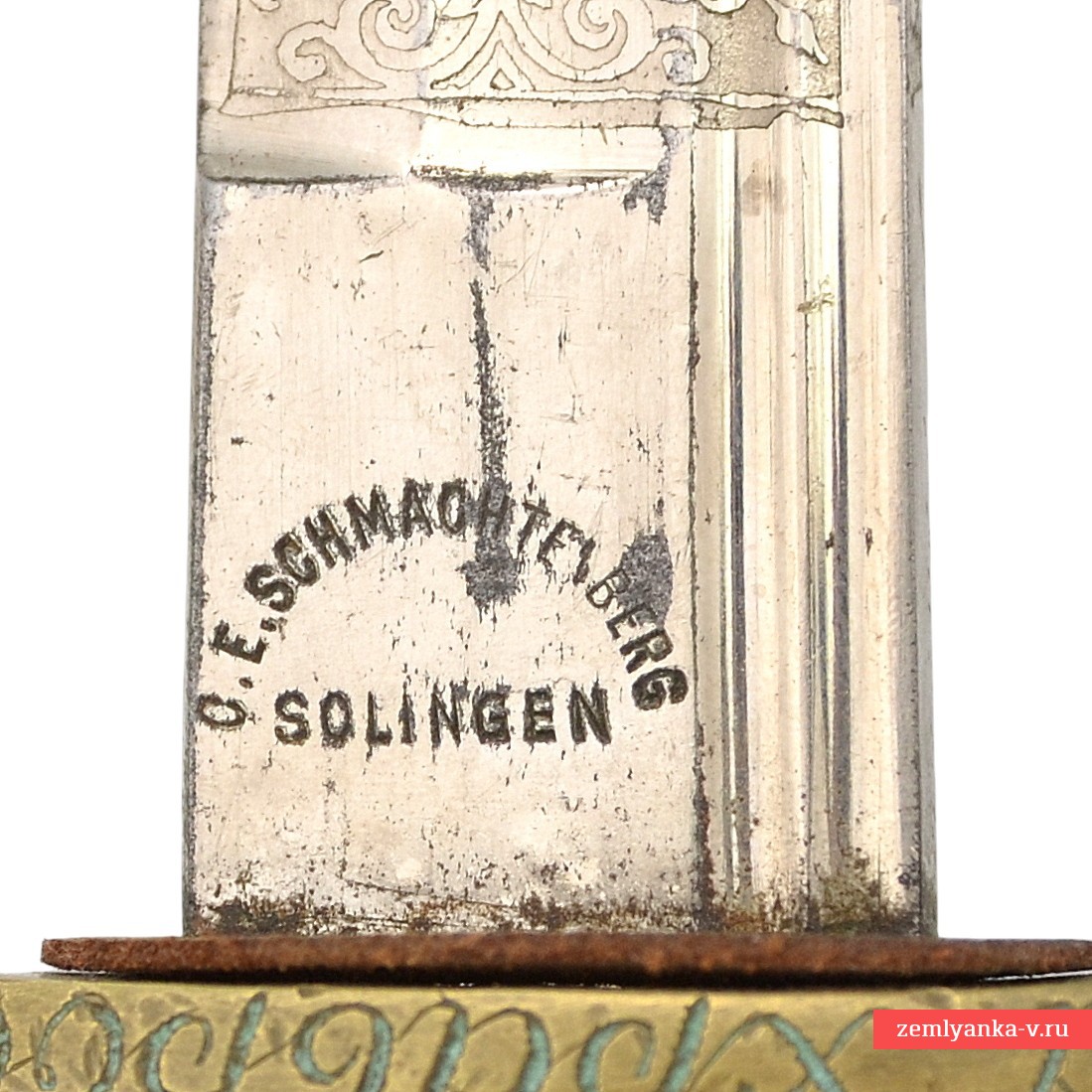 На пяте клинка пробито клеймо производителя, выполненное в виде надписи «O.E. Schmachtenberg Solingen». Компания «O.E. Schmachtenberg» была основана в Золингене — сердце ножевой промышленности Германии. Точная дата основания семейных мастерских часто уходит корнями в XIX век, когда промышленная революция позволила небольшим кустарным производствам масштабироваться и начать экспорт своей продукции по всему миру. Золинген в то время был строго регулируемым цеховым сообществом, где право ставить клеймо города на лезвие было высшим знаком качества. Фамилия Schmachtenberg (Шмахтенберг) довольно глубоко укоренена в истории региона Бергишес-Ланд. Семья занималась производством режущих инструментов на протяжении десятилетий. Приставка «O.E.» обычно расшифровывается как инициалы основателя или владельца (вероятно, Otto Ernst). Производитель O. E. Schmachtenberg был известен, прежде всего, как мануфактура по производству специализированных инструментов и ножевых изделий. В отличие от компаний, ориентированных исключительно на столовые приборы, Schmachtenberg часто фокусировался на следующих категориях: профессиональные инструменты (портновские ножницы, парикмахерские инструменты и инструменты для выделки кожи), опасные бритвы, ножи для ремесленного использования, а также клинки для различных видов холодного оружия, в том числе для русских шашек, для которых наличие немецкого клинка, как правило, говорит о монтировке изделия до августа 1914 года (с началом Первой Мировой войны все немецкие фирмы и предприятия либо покинули Россию, либо были национализированы),
