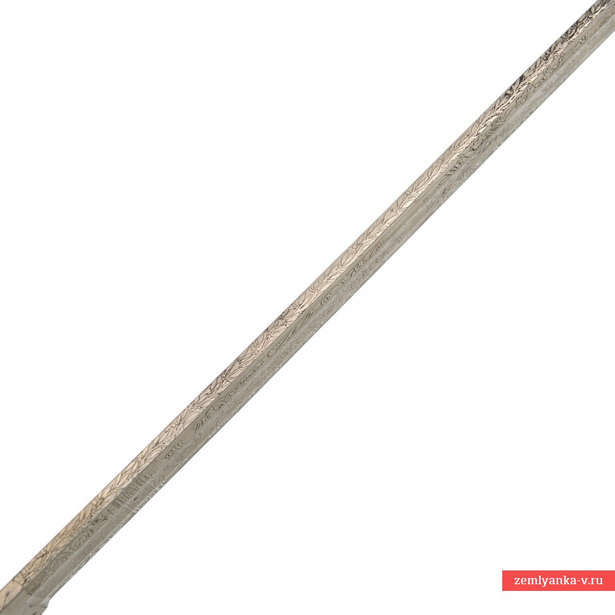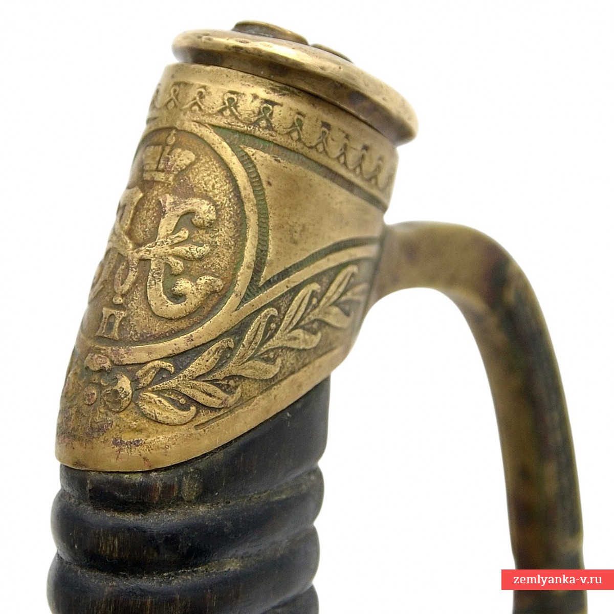Оригинальная азбучная аннинская шашка в очень хорошем коллекционном состоянии. Клинок стальной, незначительно изогнутый, однолезвийный, с тремя долами. Клинок на ⅔ по обеим голоменям украшен нанесенными травлением изображениями растительных композиций и военной арматуры (сабли, трубы, знамена). Обух клинка украшен пояском из листьев лавра, нанесенным травлением. Клинок никелированный.
