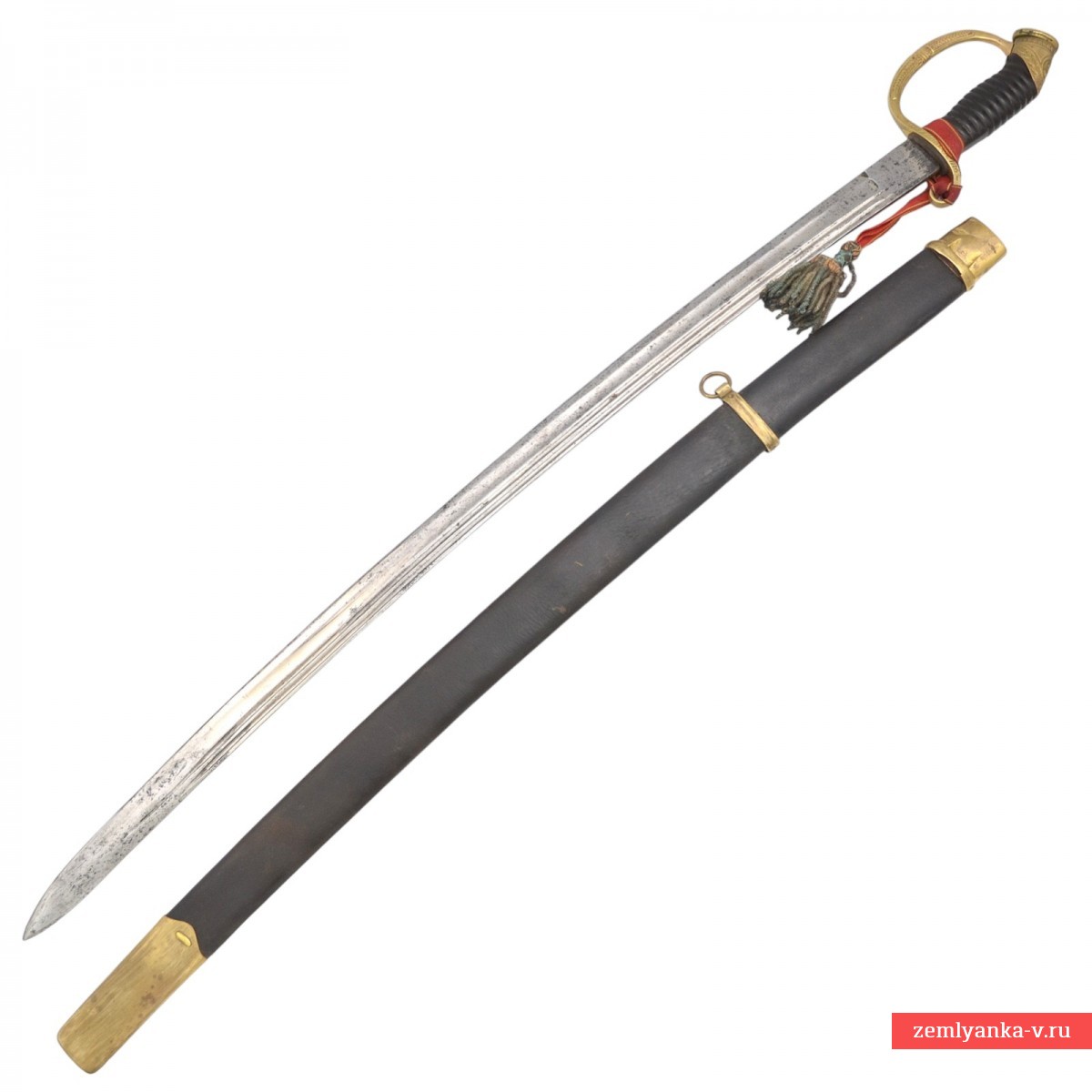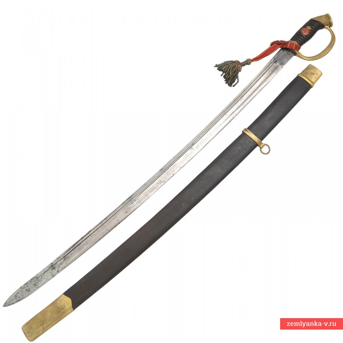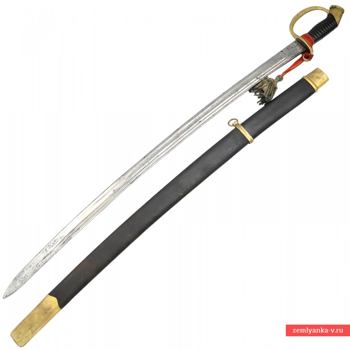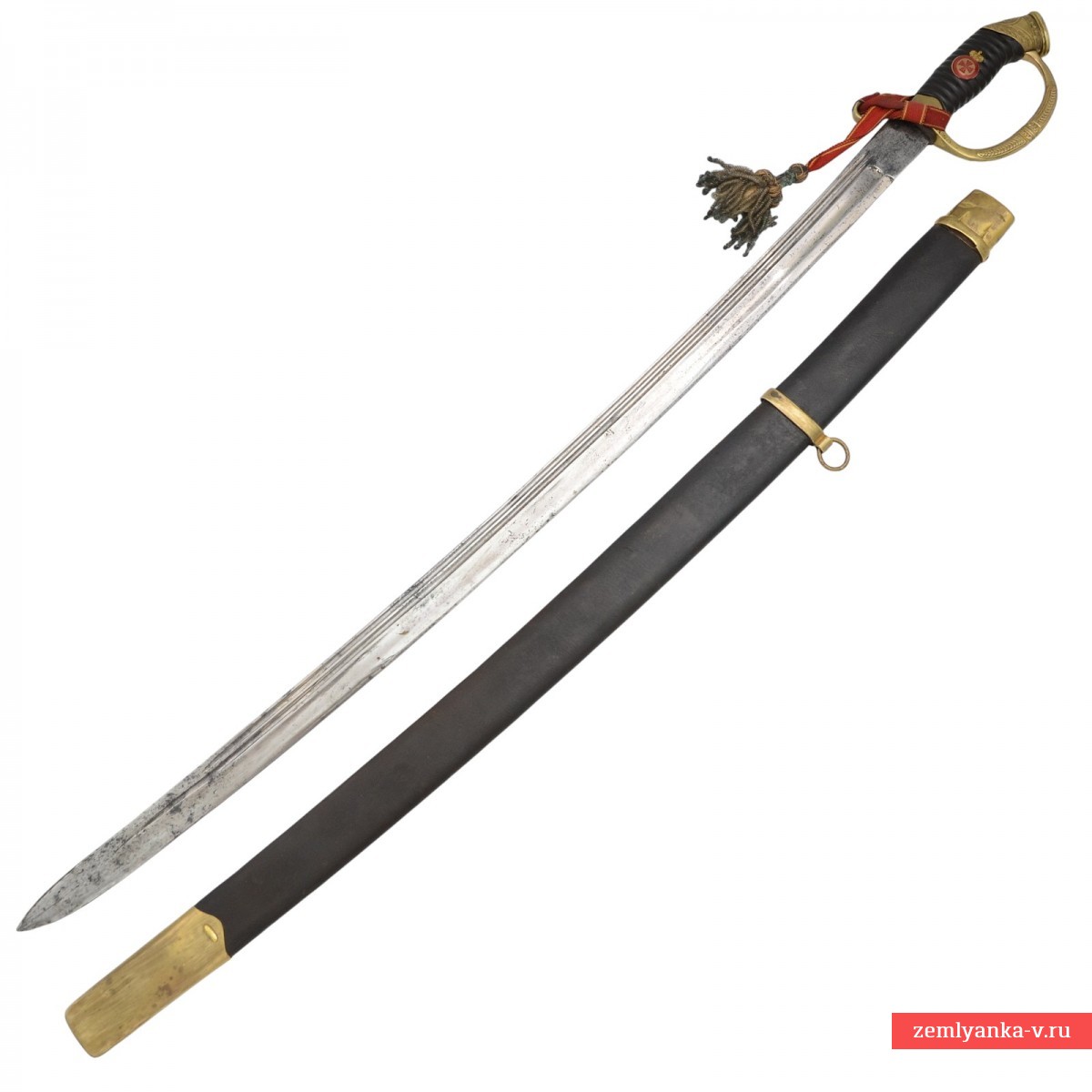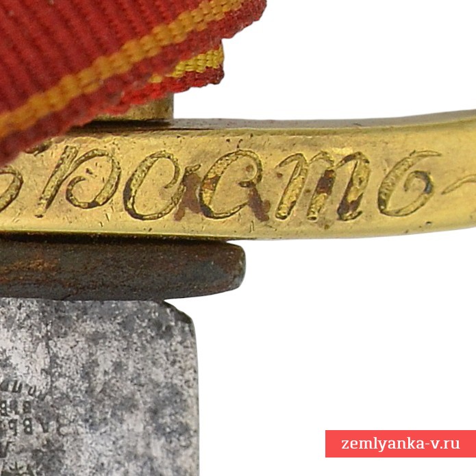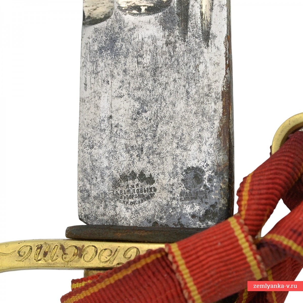 Оригинальная азбучная аннинская шашка в неплохом коллекционном состоянии. Клинок стальной, незначительно изогнутый, однолезвийный, с тремя долами. На пяте клинка пробито двойное клеймо «Товарищества Завьялова» в Ворсме: плохо читаемая надпись «Л. и А. Завьяловы в Ворсме» — клеймо производителя; нанесена надпись в круге «HONORIS CAUSA 1882» (?) под надписью «LONDINI» — клеймо производителя, обозначающее высокое качество изделия от лат. «Honoris causa» — «Ради почёта», сокращённо. Подобной фразой обозначались изделия, получившее широкое признание за выдающиеся качества стали, свойств и т.д. на европейских выставках. В данном случае имеется ввиду выставка в Лондоне 1882 года, обозначенная надписью «Londini». Приз фирма Завьяловых тогда получила «За отличные образцы ножевого товара». Часто данный лейбл заменял медали выставок, ставившиеся русскими мастерами на своих изделиях. На хвостовике клинка пробита дата изготовления изделия – 1916 год.