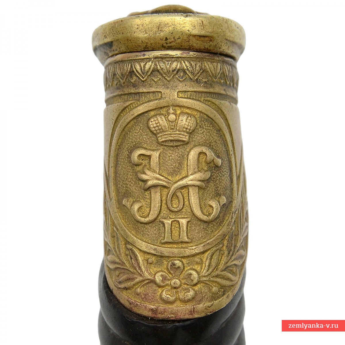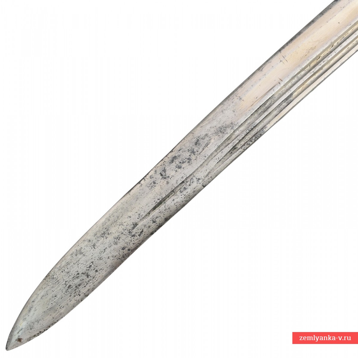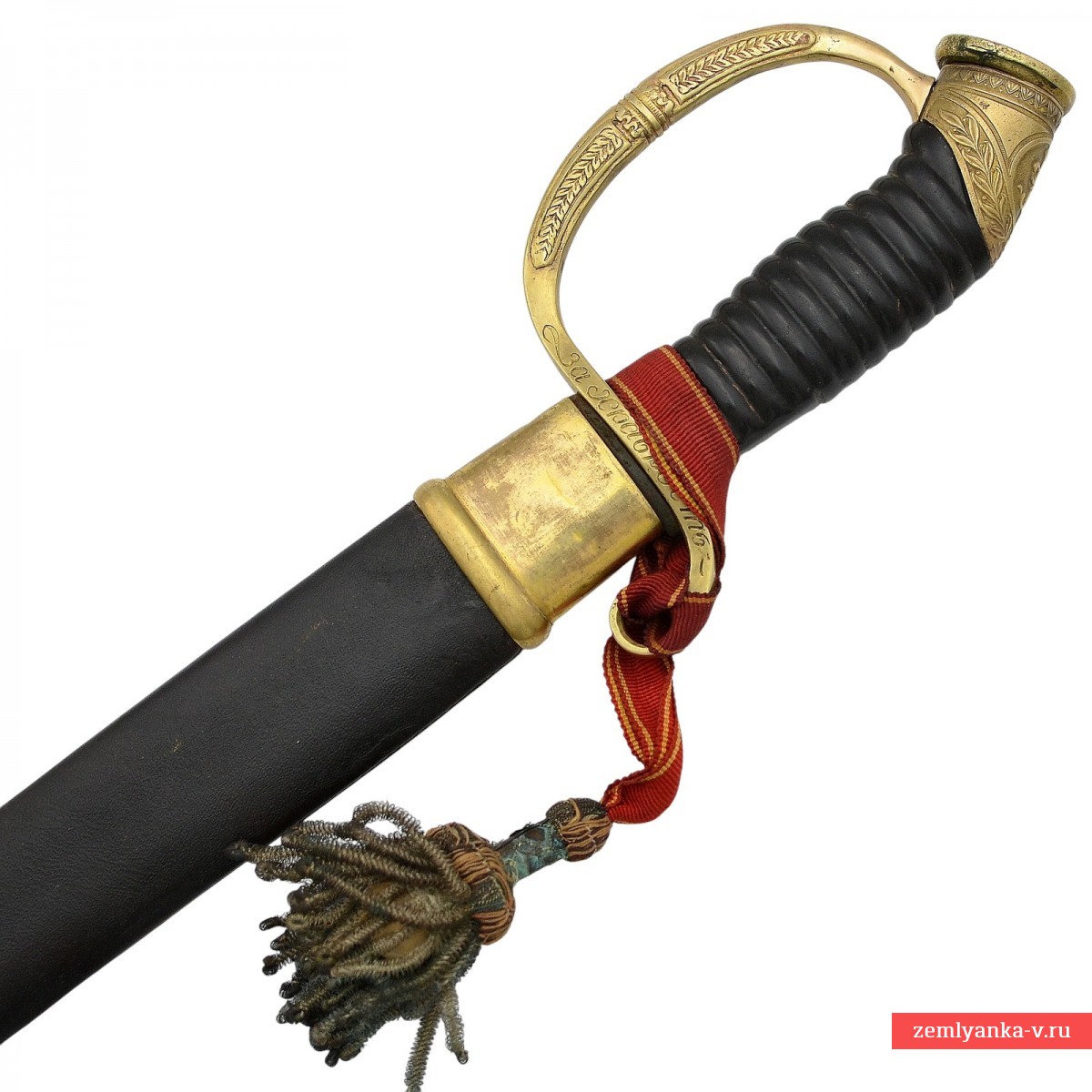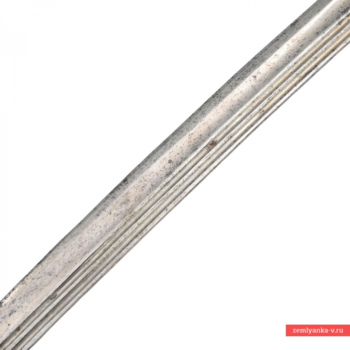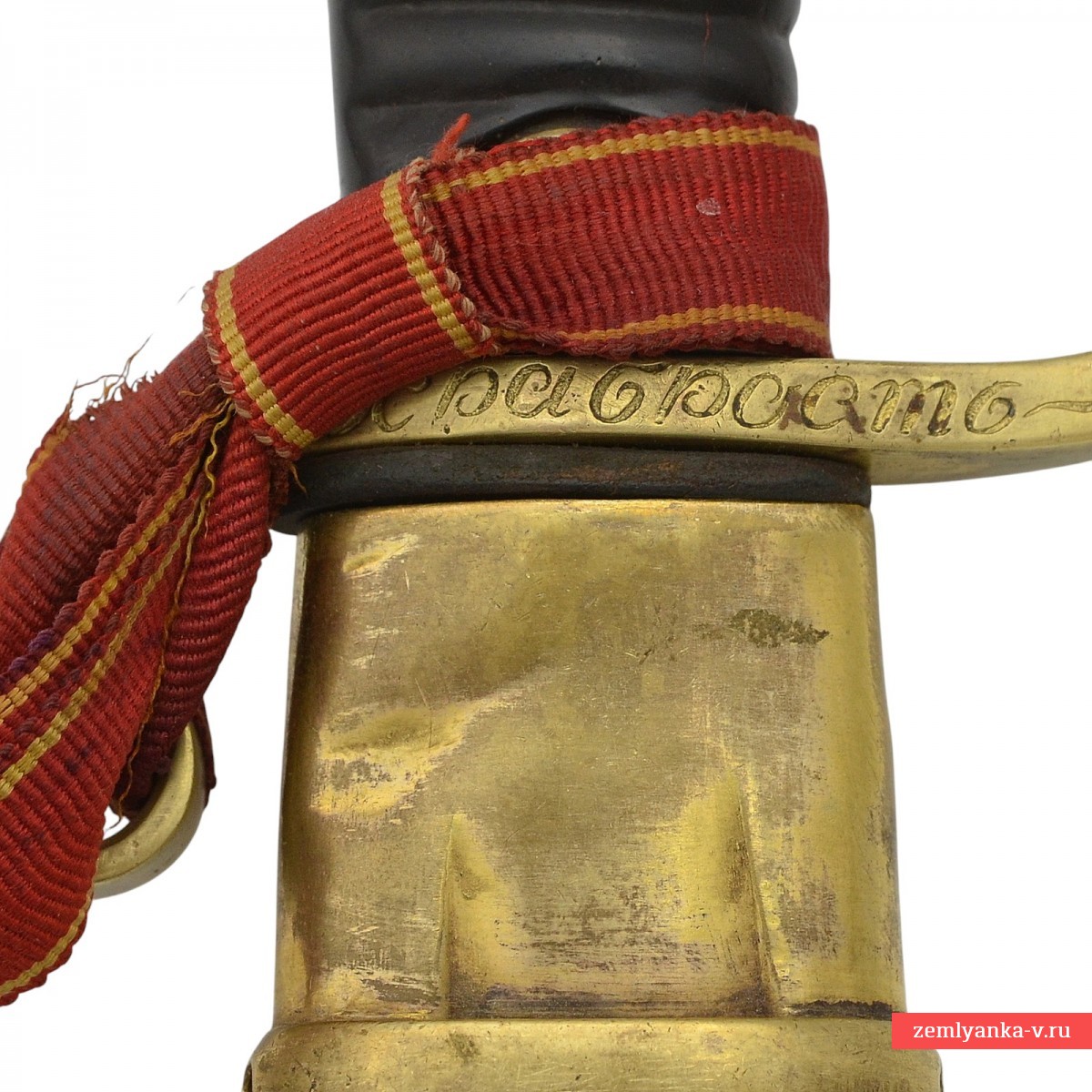Оригинальная азбучная аннинская шашка в неплохом коллекционном состоянии. Клинок стальной, незначительно изогнутый, однолезвийный, с тремя долами. На пяте клинка пробито двойное клеймо «Товарищества Завьялова» в Ворсме: плохо читаемая надпись «Л. и А. Завьяловы в Ворсме» — клеймо производителя; нанесена надпись в круге «HONORIS CAUSA 1882» (?) под надписью «LONDINI» — клеймо производителя, обозначающее высокое качество изделия от лат. «Honoris causa» — «Ради почёта», сокращённо. Подобной фразой обозначались изделия, получившее широкое признание за выдающиеся качества стали, свойств и т.д. на европейских выставках. В данном случае имеется ввиду выставка в Лондоне 1882 года, обозначенная надписью «Londini». Приз фирма Завьяловых тогда получила «За отличные образцы ножевого товара». Часто данный лейбл заменял медали выставок, ставившиеся русскими мастерами на своих изделиях. На хвостовике клинка пробита дата изготовления изделия – 1916 год.