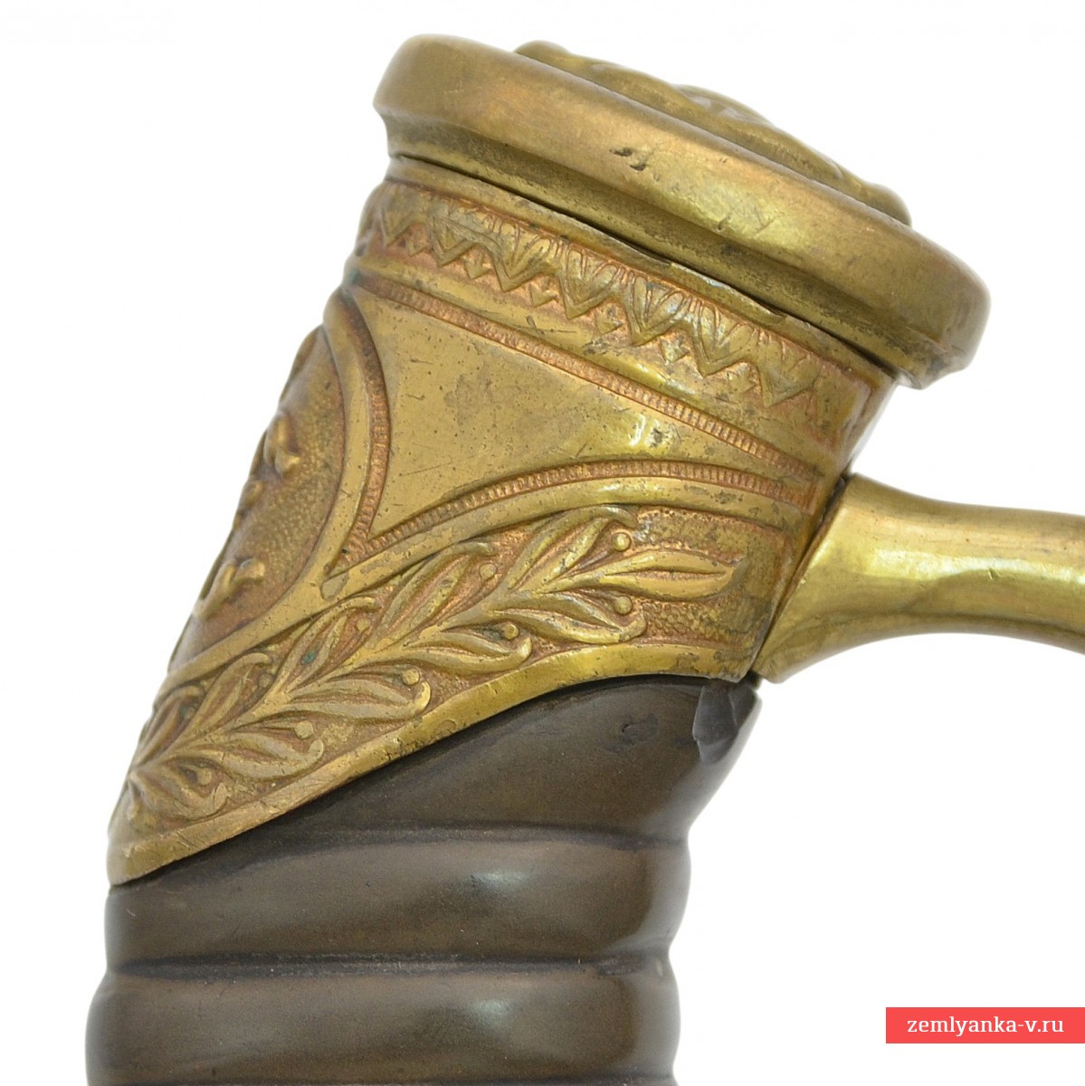 Эфес состоит из рукояти и гарды. Рукоять бакелитовая, с поперечными желобками. Внизу на рукояти расположена гладкая фигурная латунная втулка. Навершие рукояти латунное, стаканчиком, с оттянутым вдоль спинки язычком и овальным выпуклым завершением в виде навинчивающейся на хвостовик крышечки. Навершие декорировано литой высоко-рельефной композицией, включающей в себя: в центральной части – овальный медальон со вписанной монограммой «Н II» под короной на псевдоканфаренном фоне (вензель императора России Николая II (1894-1917 гг.), в царствование которого владелец шашки получил свой первый офицерский чин); вдоль верхнего края – узкий поясок растительно-геометрического орнамента; вдоль нижнего края – изображение цветка с исходящими от него в обе стороны (влево и вправо) лавровыми ветвями. Гарда образована одной передней дужкой, исходящей от навершия и, плавно изгибаясь, переходящей в узкую крестовину, конец которой загнут в сторону клинка и имеет круглое сквозное отверстие для крепления темляка. В центральной части с обеих сторон передняя дужка декорирована высокорельефными литыми изображениями широкого пояска и лавровых ветвей в линейной окантовке, исходящих от него в обе стороны (вверх и вниз).