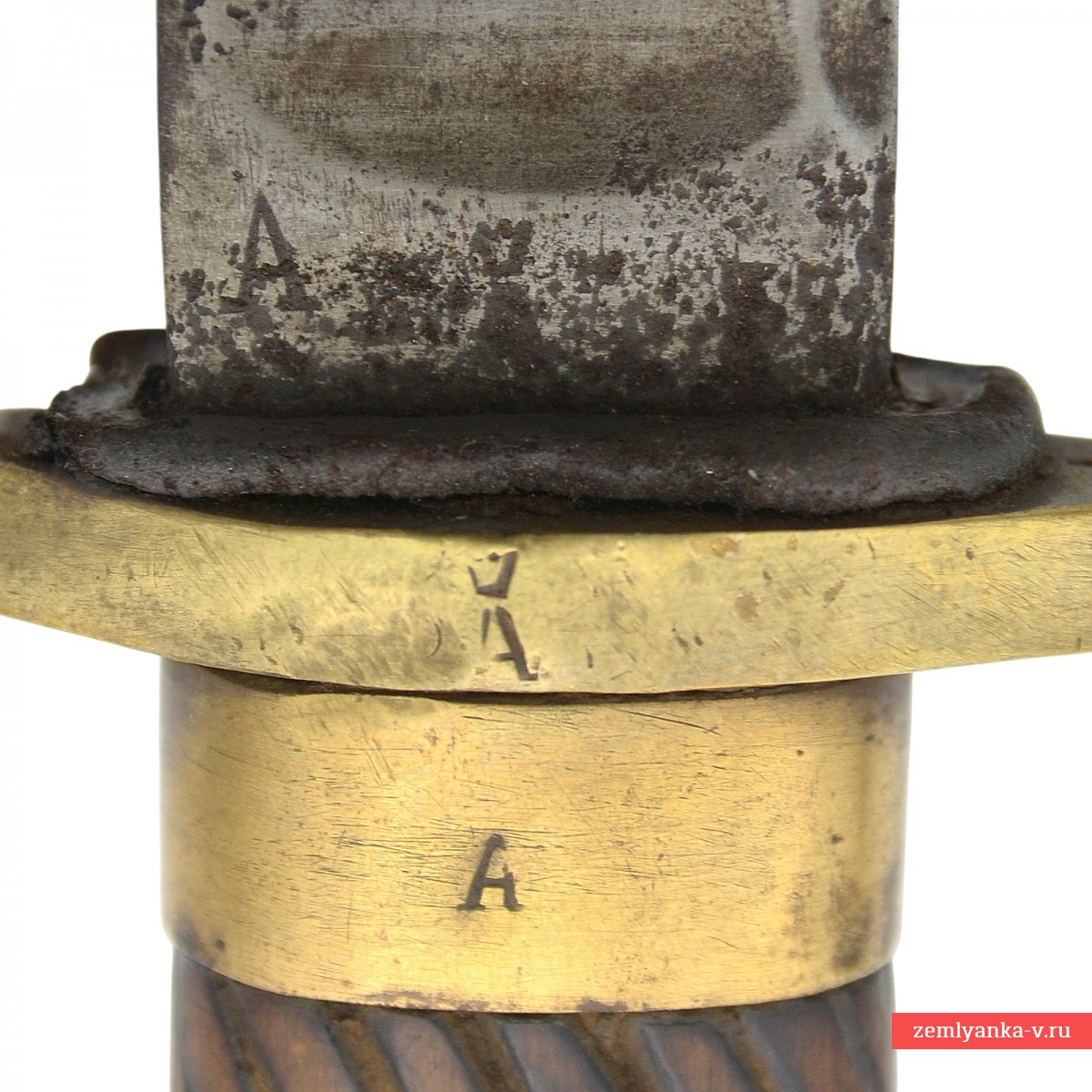 Предмет находится в удовлетворительном коллекционном состоянии. Следы коррозии на клинке. Следы чистки на эфесе и ножнах. Потёртости и временная патина на приборе ножен и латунных деталях эфеса.