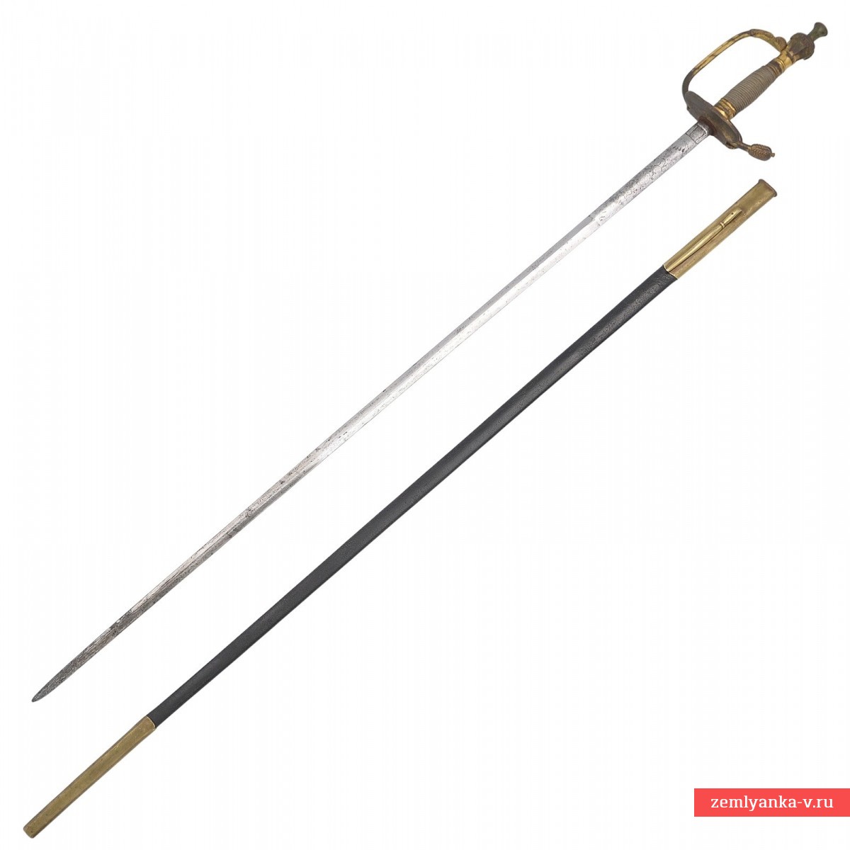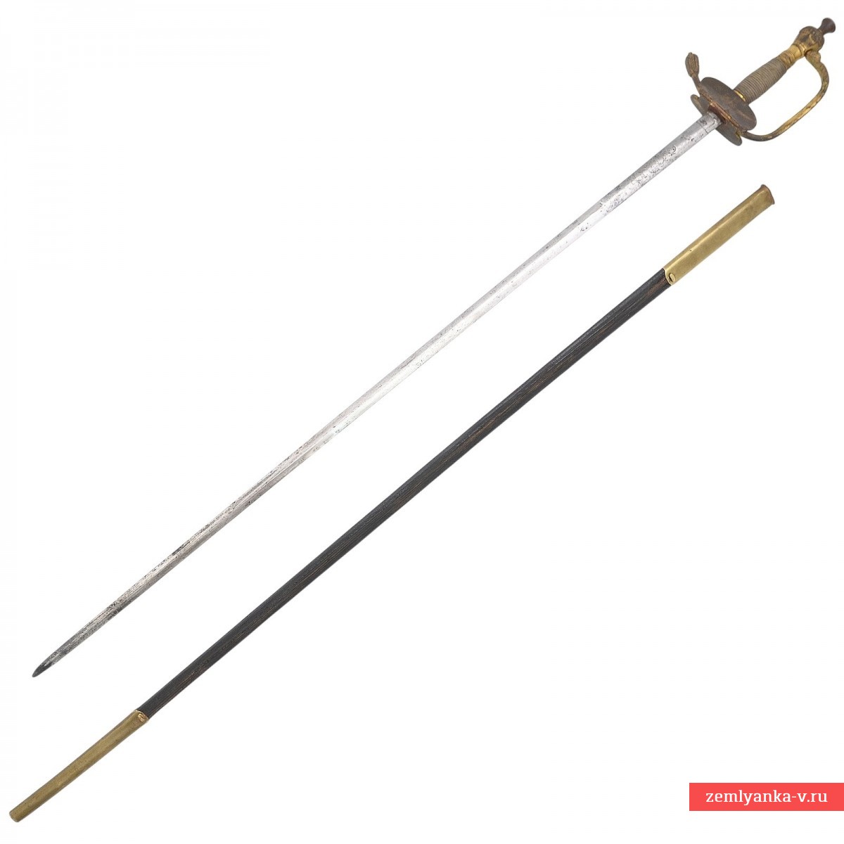 Эфес состоит из рукояти и латунной гарды. Рукоять, крепящаяся на хвостовик клинка всадным способом, – прямая, бочкообразная, в сечении – круглая, по всему периметру обмотана витой латунной проволокой. Снизу на рукояти расположена коническая латунная втулка. Навершие рукояти – в виде массивной конической головки на длинной ножке; ножка, украшенная в своей нижней части кольцевыми желобками, выполняет роль верхней втулки рукояти. Головка граненая, расширяющаяся кверху, в своей верхней части декорирована литыми высокорельефными стилизованными изображениями листьев аканта. Головку венчает округлая латунная пуговка на высокой ножке, являющаяся стяжным винтом. Гарда образована одной гладкой узкой передней дужкой, имеющей выраженную центральную грань, исходящей от головки и, плавно изгибаясь, переходящей в крестовину с прямым утолщенным концом. Конец крестовины украшен стилизованными изображениями листьев аканта и завершается очень маленькой выступающей точкой-бусинкой. На крестовине с обеих сторон расположены гладкие полуовальные щитики симметричные, формирующие чашку гарды. С внутренней стороны щитик откидной. Ножны кожаные с латунным прибором, состоящим из устья с длинным шпеньком и наконечника.