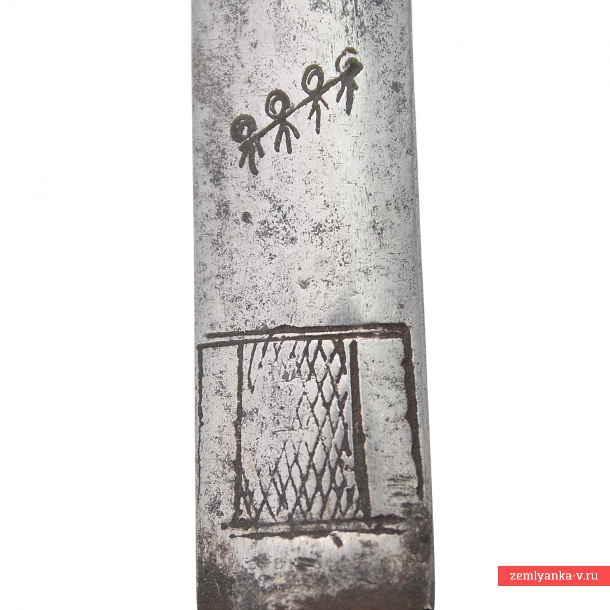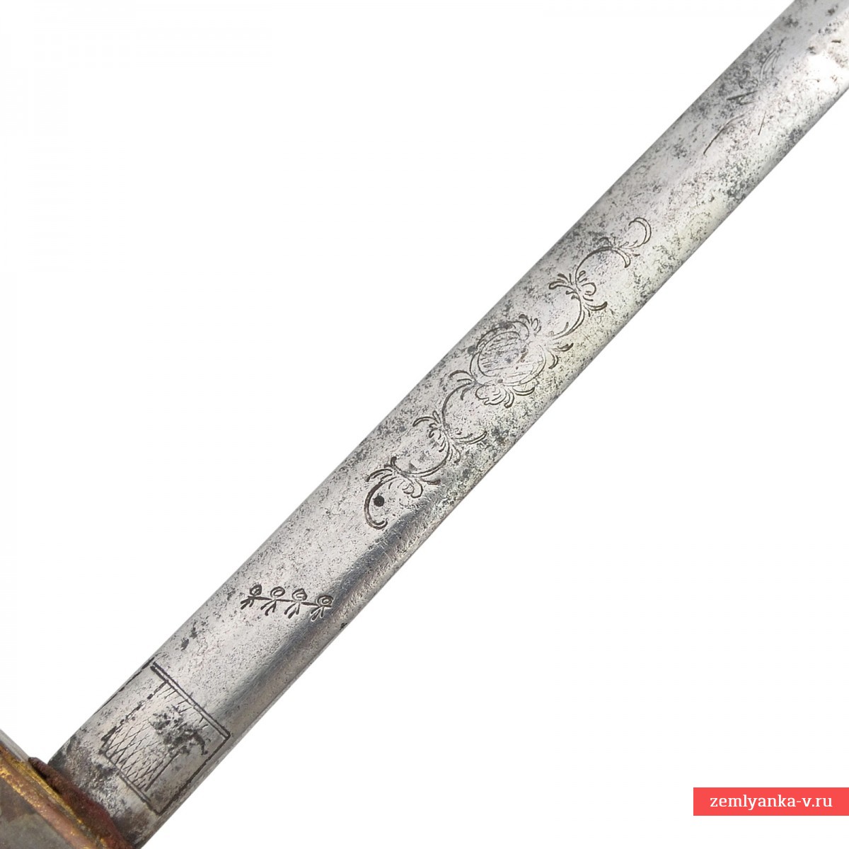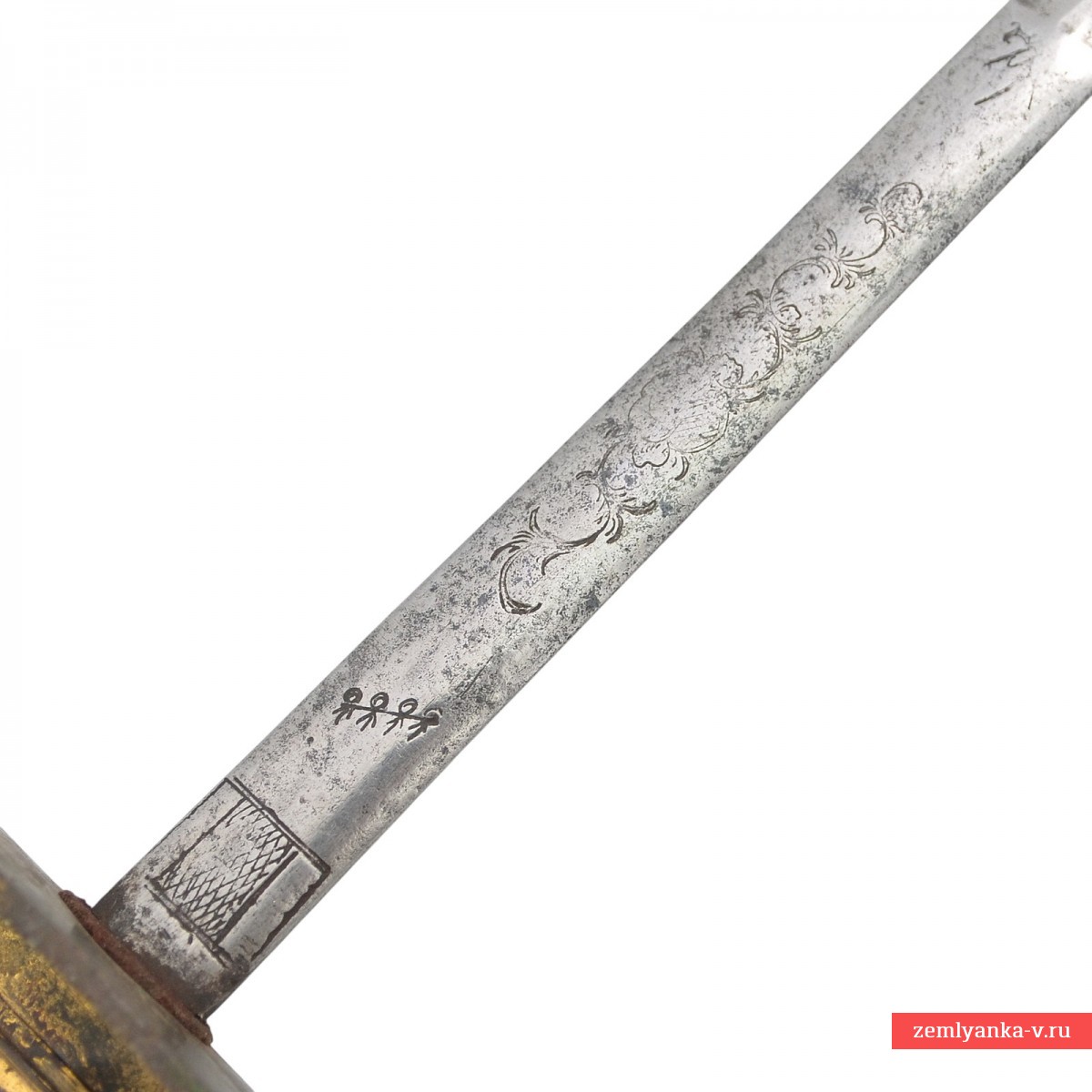 Оригинальная шпага в неплохом коллекционном состоянии. На шпаге установлен шпажный европейский XVIII века, что являлось частой практикой того времени и позволяет датировать шпагу началом XIX века. Клинок стальной, прямой, двулезвийный, у основания линзовидного сечения, на 4/5 длины ромбического сечения. Клинок украшен нанесенными иглой орнаментами в виде растительных завитков, военной арматуры/трофеев, а также изображением 4-х перечёркнутых человечков.