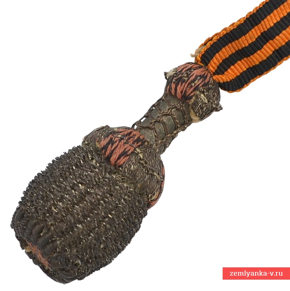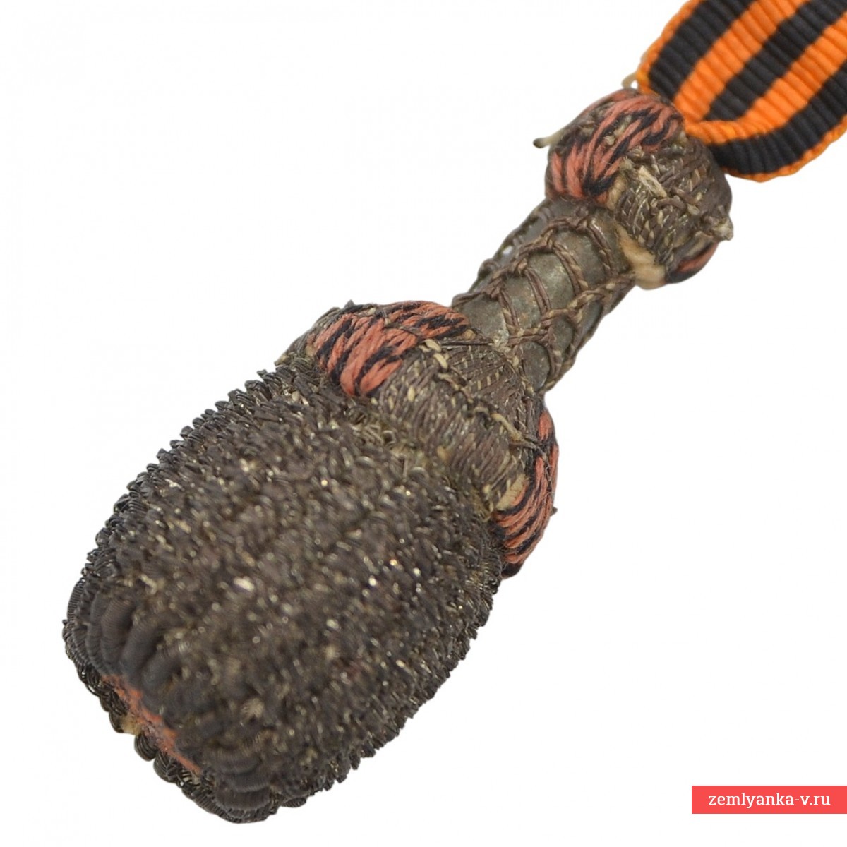 Чрезвычайно редкий темляк к Золотому оружию в очень хорошем коллекционном состоянии. Вероятно, предназначался для ношения с облегченной версией Золотого оружия, т.н. «крысоколкой», либо на миниатюре. Лента имеет следы штомпки в двух местах, кисть без повреждений. Общая длина 177 мм, ширина ленты 11 мм. Гарантированный оригинал из старой отечественной коллекции.