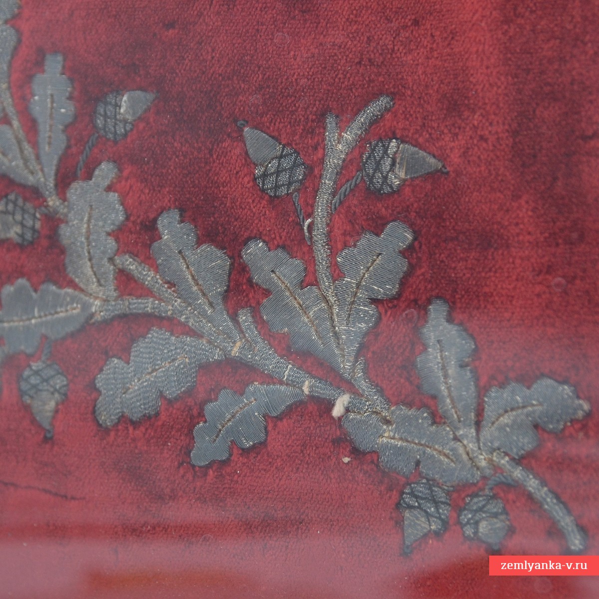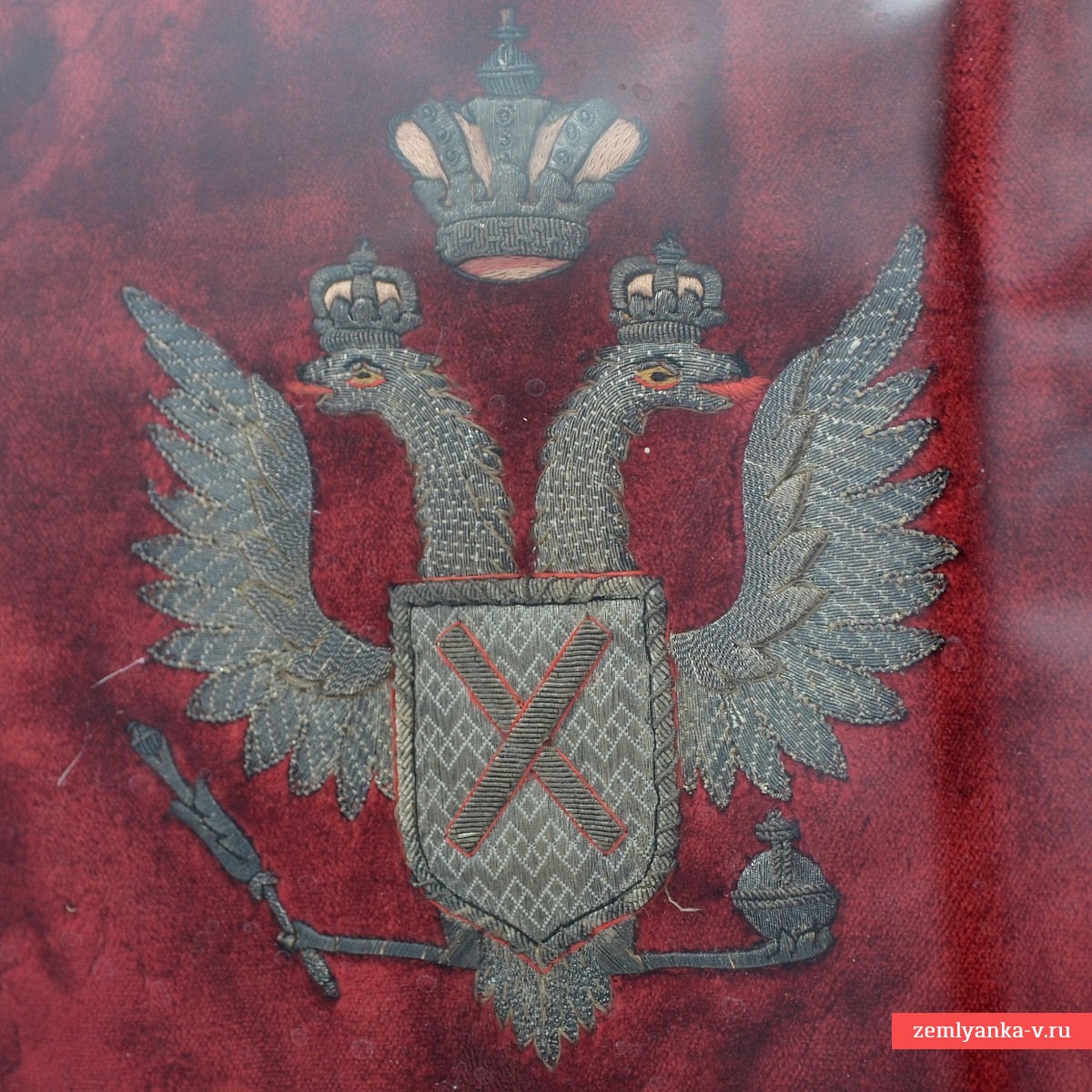 Очень интересная и редкая находка нашего магазина – фрагмент вышивки, вероятно, изначально являвшийся частью обшивки кареты или интерьера Офицерского собрания или казарм Лейб-Гвардии Измайловского полка. О принадлежности вышивки к Гвардии говорит изображение герба Российской империи с Андреевским крестом— сальтиром, который вышит горизонтальной штриховкой, т.е. показывающей в системе шрафировки синий цвет, а также наличие лавровой и дубовой ветвей под ним. Данные символы использовались в старейших полках Гвардии с петровских времен, а красный цвет фона указывает на принадлежность к Измайловскому полку, что определяется по фурьерским значкам XVIII века). Размер 440*460 мм. В современной декоративной раме. Гарантия подлинности.
