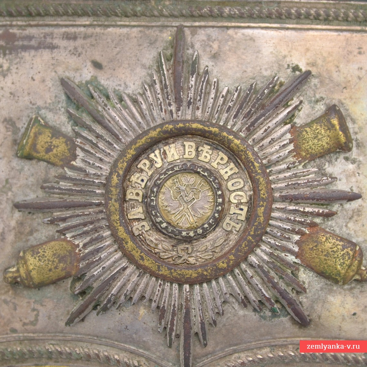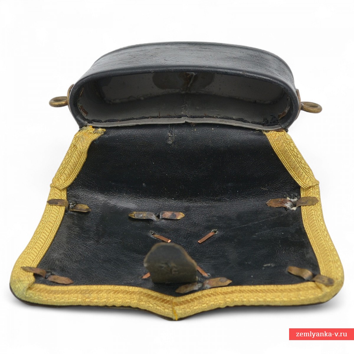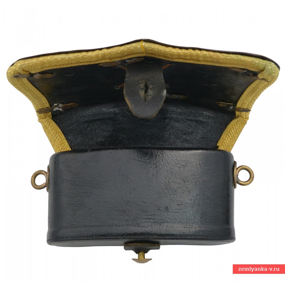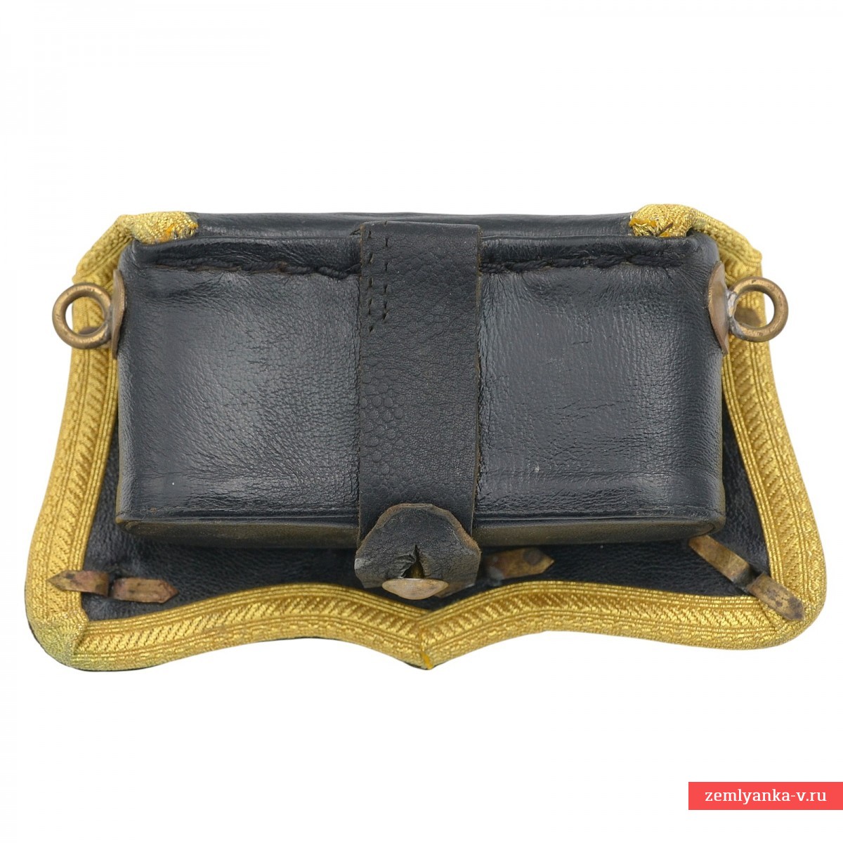 В 1859 г. для всех офицеров кавалерии и конной артиллерии, как гвардейской, так и армейской, были введены лядунки с серебряной крышкой единого образца: фигурной, отделанной по краю штампованным витым кантом, с закругленными углами и мыском в нижней части. В качестве арматуры на крышке крепились: в армейской кавалерии – государственный герб по цвету металлического прибора, в гвардейской – посеребренная звезда ордена Св. Андрея Первозванного, один из символов русской гвардии. В конной артиллерии герб или звезда дополнялись изображением позолоченных скрещенных пушек. В 1889 г. прямоугольный корпус лядунки старого образца, к днищу которого пристегивались концы перевязи, был заменен новым овальным, с кольцами на боковых стенках, к которым крепились фасонные крючки на концах перевязи. Корпус обтягивался черной тонкой кожей. Поскольку огнестрельным оружием офицерам давно служили револьверы под металлический унитарный патрон, из корпуса исчезли гнезда под бумажные патроны, а с перевязи – протравники (иглы для прочистки запального отверстия пистолета). В таком виде офицерские лядунки просуществовали вплоть до 1917 г. В начале ХХ в. в целях удешевления крышки и арматура нередко делались из недрагоценных металлов, с серебрением и золочением. Наиболее редко встречаются лядунки гвардейской конной артиллерии, в которой по состоянию на 1909 г. числилось всего 62 офицера. Лядунка прошла реставрацию – была заменена кожа и галун, крышка и основа при этом использовались подлинные.