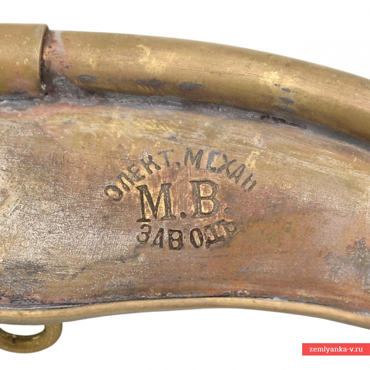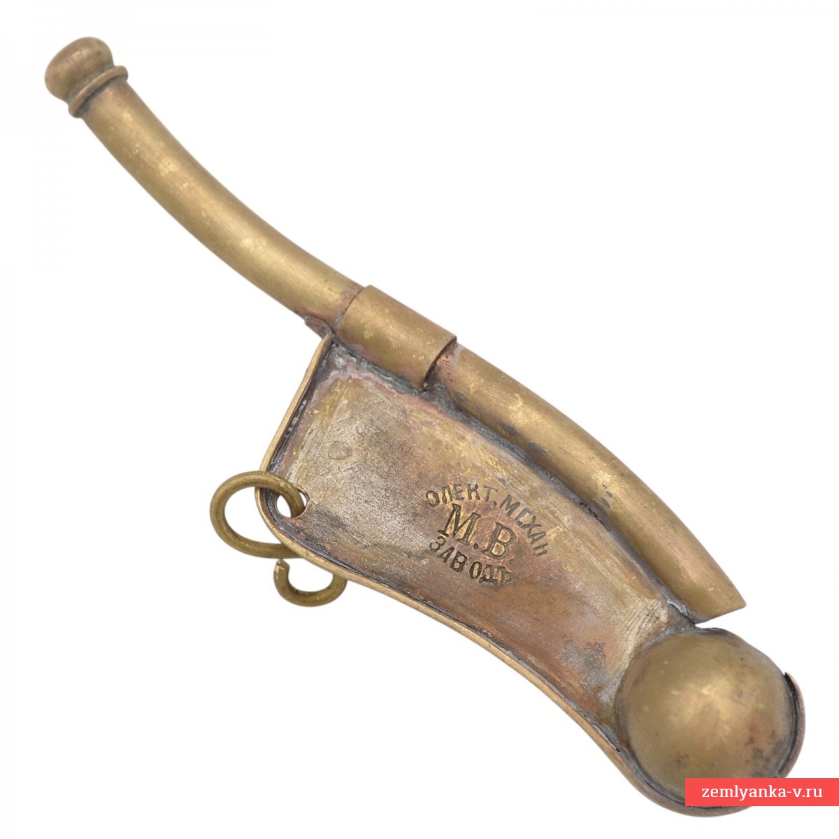 Латунь, штамповка. Крайне редкий аксессуар боцмана русского флота в отличном рабочем состоянии. В продаже практически не встречается. Звуковыми сигналами дудки предварялись устные распоряжения вахтенных и дежурных на корабле. На киле пробито клеймо производителя — «Элект. Механ. МВ. заводъ». Гарантия подлинности.