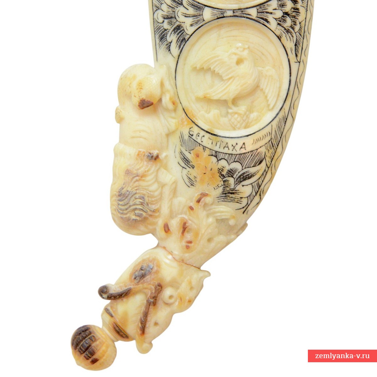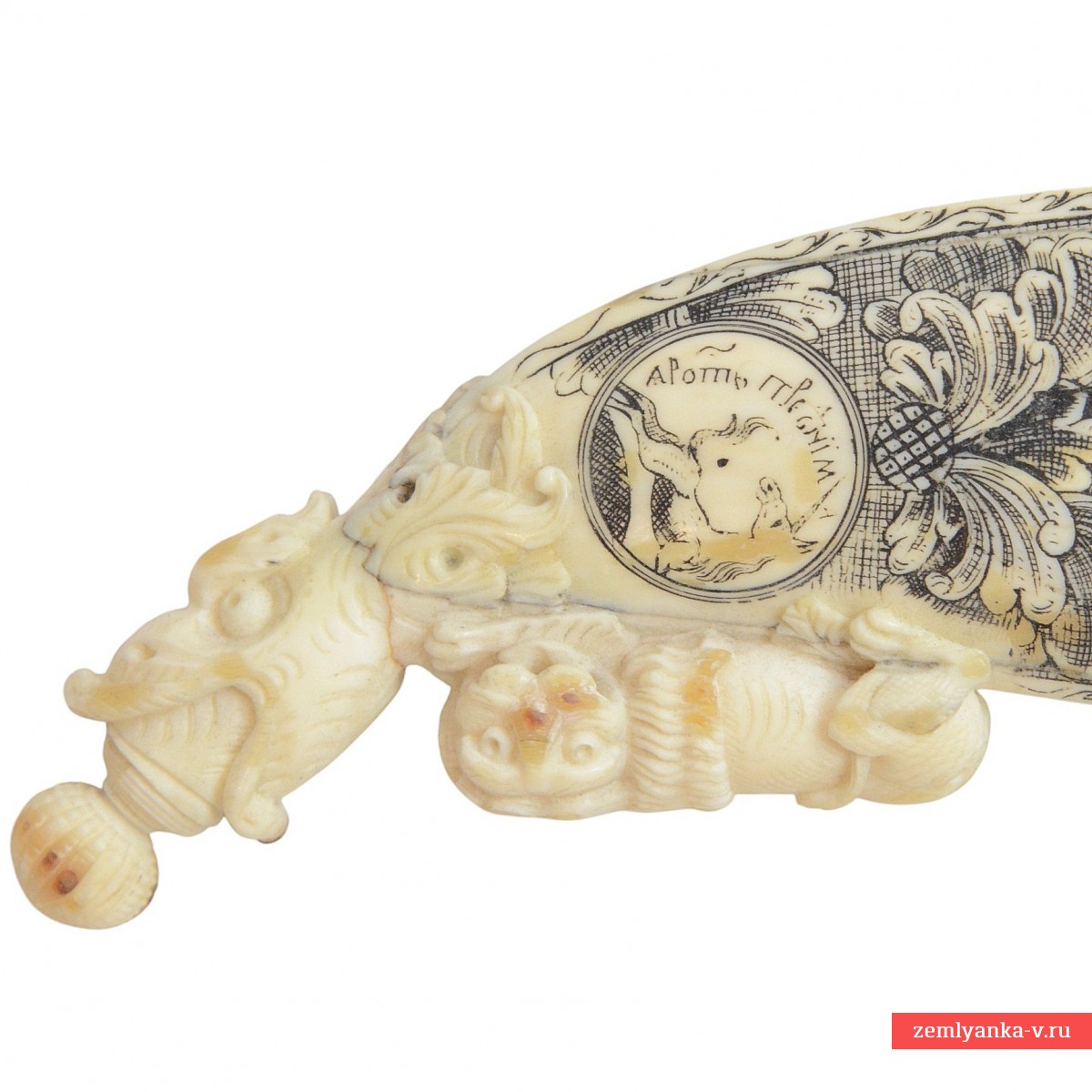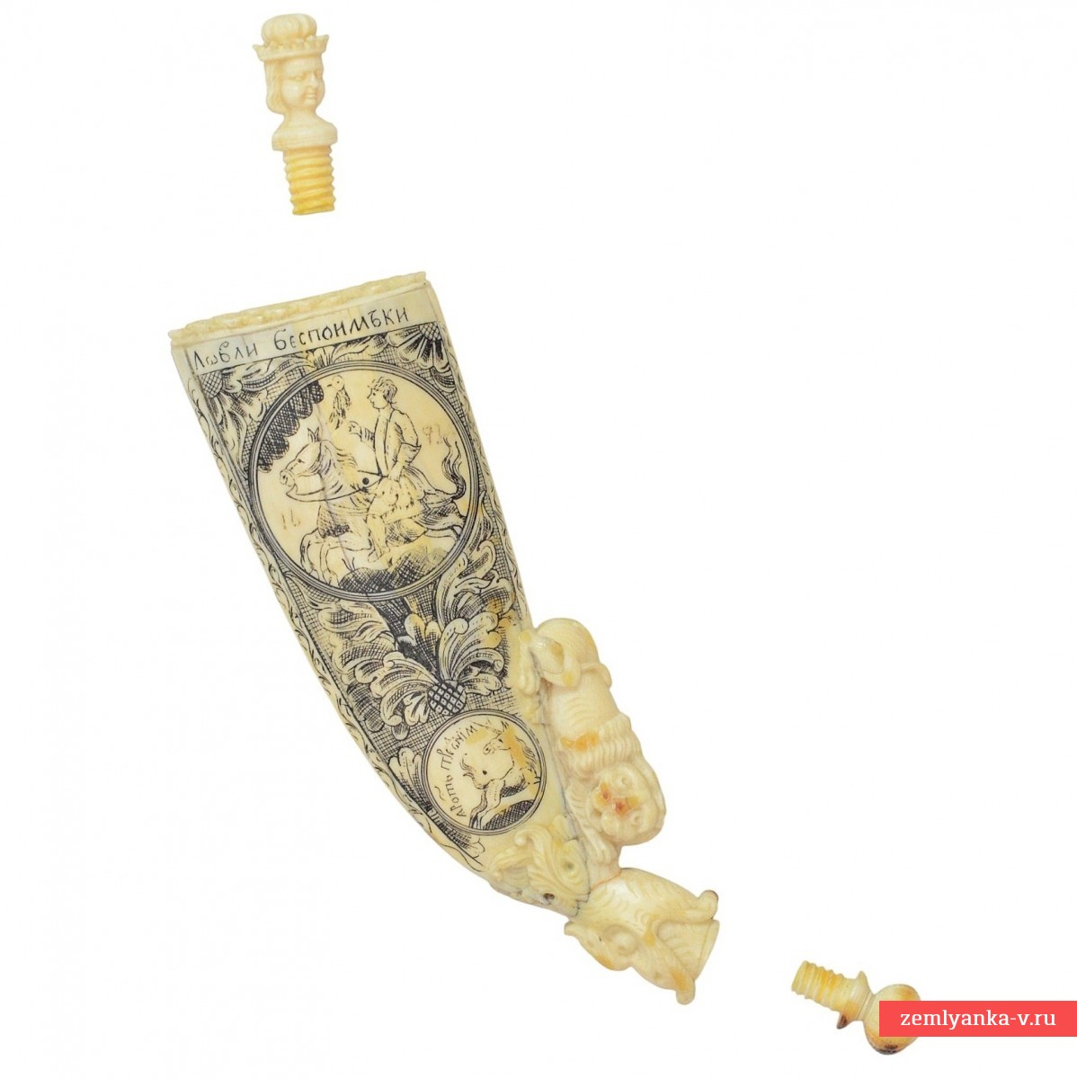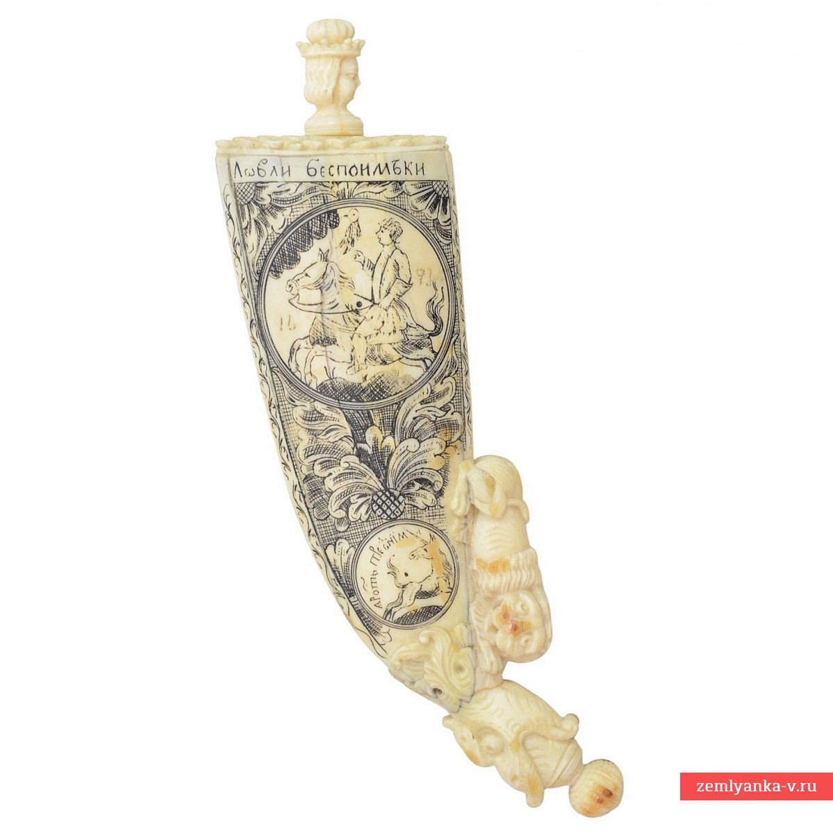 Уникально редкая костяная пороховница эрмитажного уровня работы и редкости в отличном состоянии. Длина общая 190 мм. Пороховница состоит из 3 частей: тулова, винта-закупорки и пробки. Закупорка выполнена в форме головы царя Петра Алексеевича в венце. Пробка на резьбовом соединении, округлой формы, стыкуется с окончанием тулова, выполненным в виде головы дракона. Тулово украшено сценами из охотничьей жизни, нанесенных резцом, а также надписями на старо-славянском языке: «Ловли беспоимеки», «Адамово прелщение ворого», «А рот прежним», «Без страха». В центральном медальоне с изображением охотника на коне с соколом видна частично затертая дата «1693». Чрезвычайно редкий предмет музейного уровня. Гарантия подлинности.