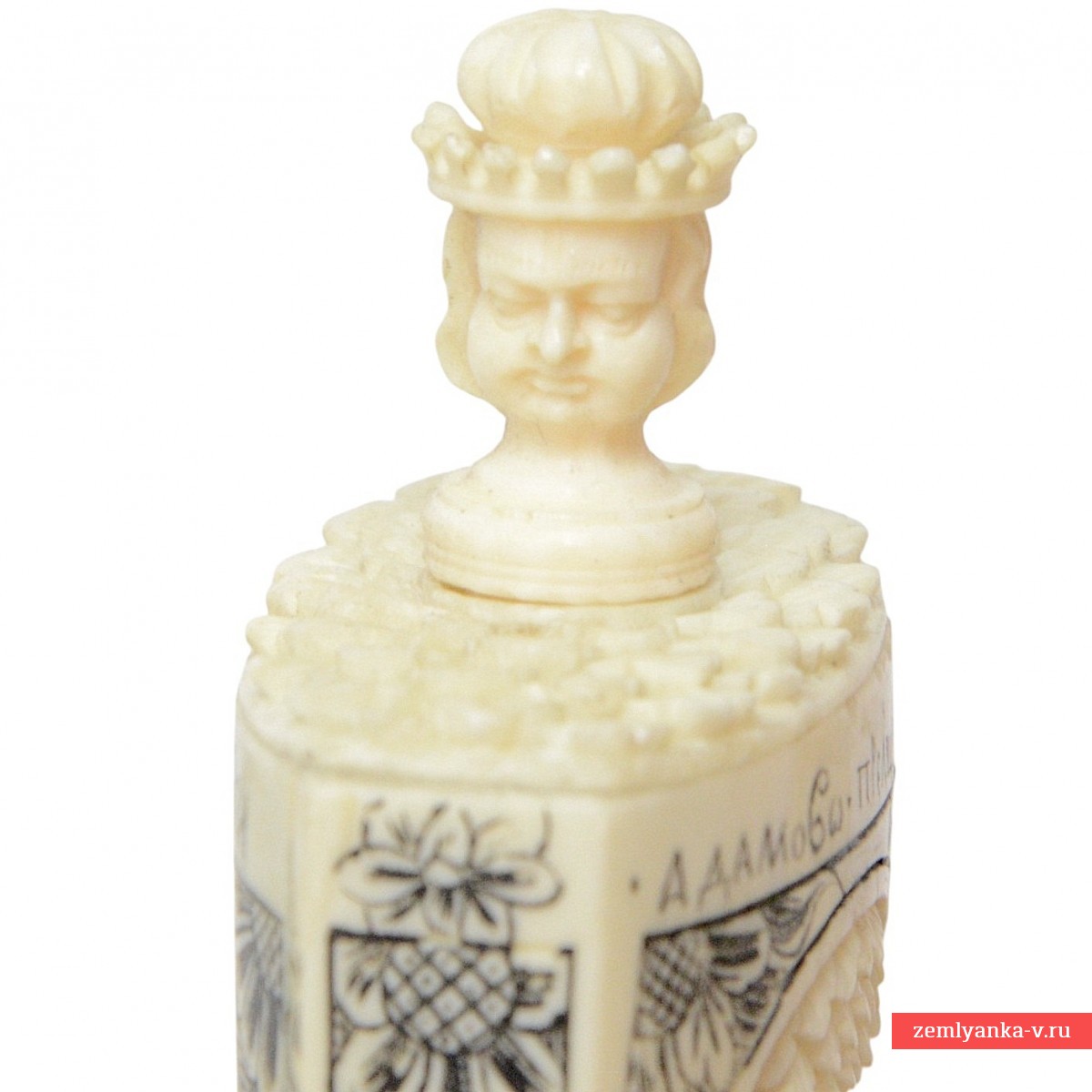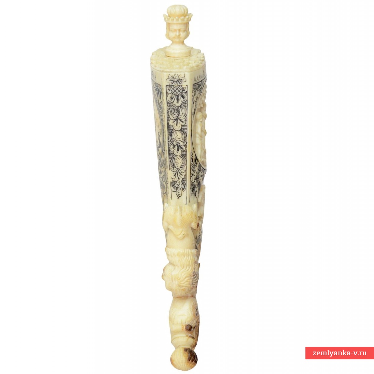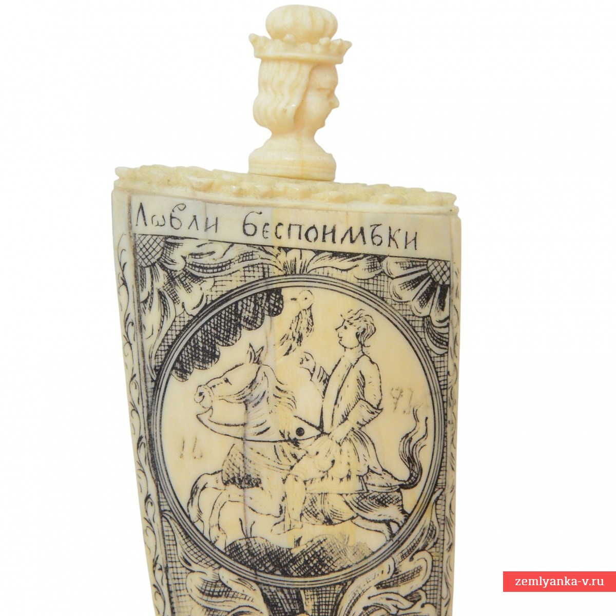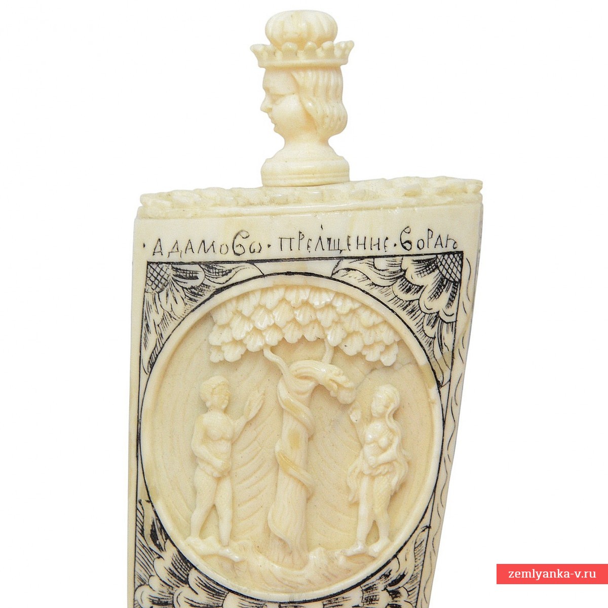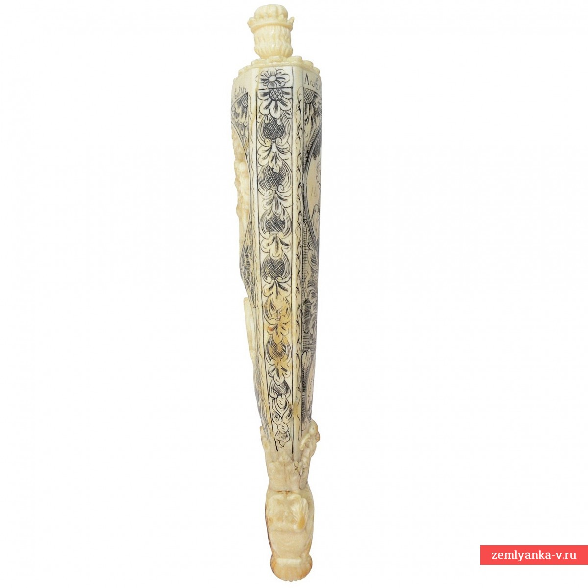 Уникально редкая костяная пороховница эрмитажного уровня работы и редкости в отличном состоянии. Длина общая 190 мм. Пороховница состоит из 3 частей: тулова, винта-закупорки и пробки. Закупорка выполнена в форме головы царя Петра Алексеевича в венце. Пробка на резьбовом соединении, округлой формы, стыкуется с окончанием тулова, выполненным в виде головы дракона. Тулово украшено сценами из охотничьей жизни, нанесенных резцом, а также надписями на старо-славянском языке: «Ловли беспоимеки», «Адамово прелщение ворого», «А рот прежним», «Без страха». В центральном медальоне с изображением охотника на коне с соколом видна частично затертая дата «1693». Чрезвычайно редкий предмет музейного уровня. Гарантия подлинности.
