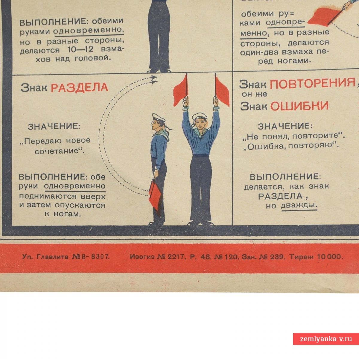 Бумага. Плакат находится в хорошем коллекционном состоянии. ОГИЗ-ИЗОГИЗ, 1931 г. Тираж 10000 шт. В центральной части плаката показаны все буквы алфавита, каждой из которых соответствует определенное положение рук сигнальщика с красными флажками. Также на плакате присутствуют служебные знаки и знаки перемены места. Плакат служит учебным пособием для сигнальщиков и моряков, наглядно показывая жесты с флажками, соответствующие буквам русского алфавита. Современная русская семафорная азбука была разработана в 1895 году вице-адмиралом Степаном Осиповичем Макаровым. Размер 102*70 см. Гарантия подлинности.