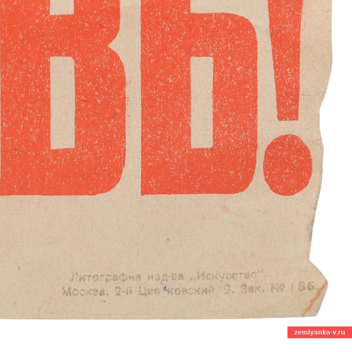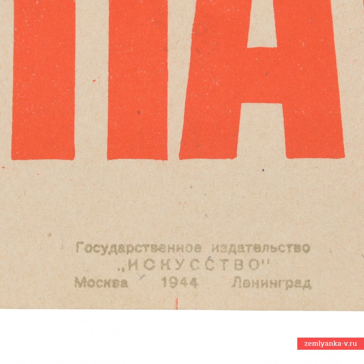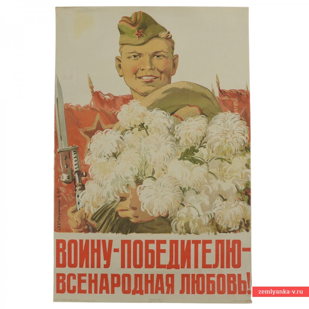 Оригинальный плакат в хорошем коллекционном состоянии. Художник Алексей Алексеевич Кокорекин (1906–1959), выдающийся советский график и заслуженный деятель искусств РСФСР. На плакате изображен улыбающийся советский солдат в военной форме, держащий огромный букет белых цветов (хризантем) на фоне красных знамен. Размер 570*860 мм. Утрачен небольшой фрагмент в правой нижней части плаката. Тираж 10000 шт. Гарантия подлинности.
