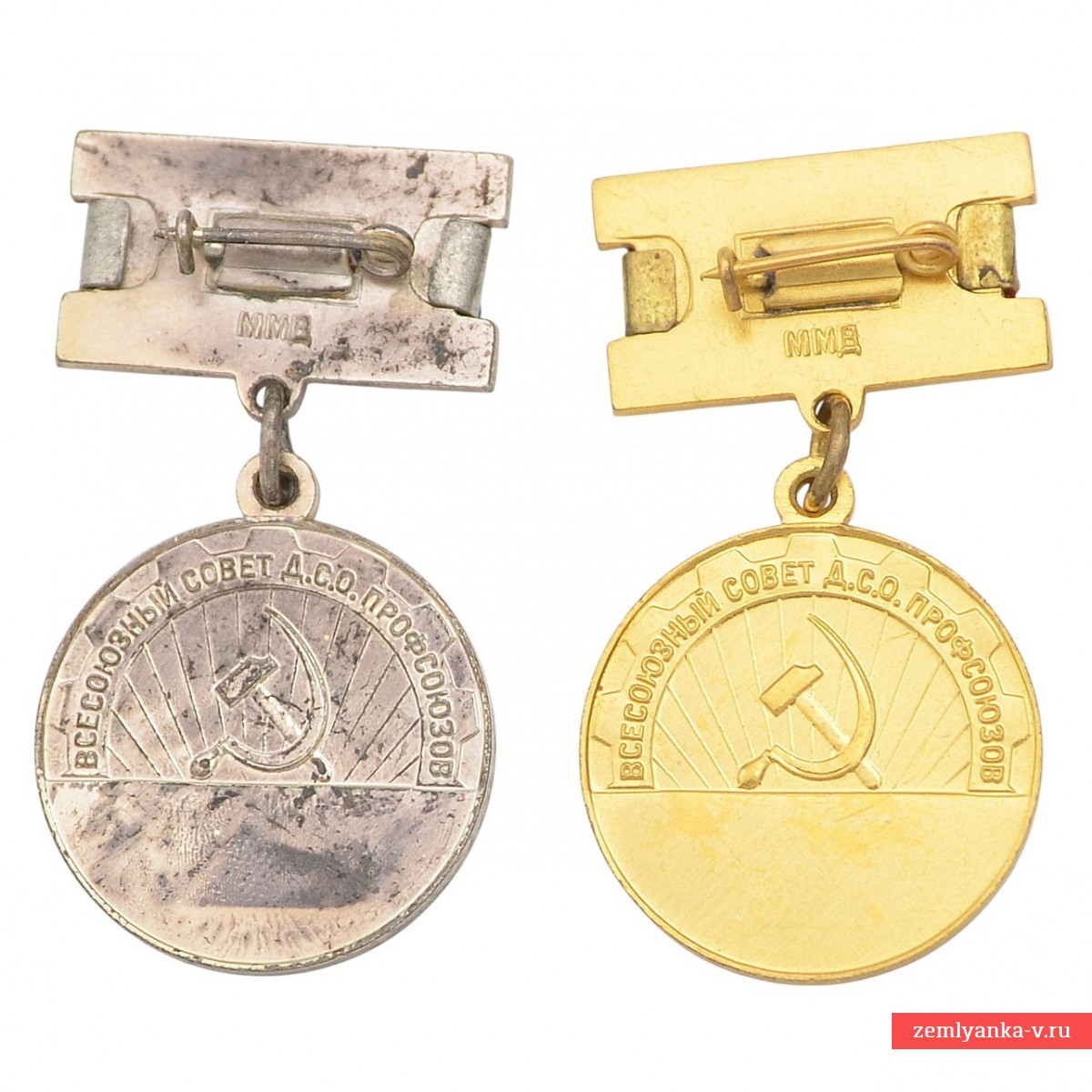 Оригинальные медали в хорошем коллекционном состоянии. Бронза, золочение, серебрение. Медали вручалась Всесоюзным центральным советом профессиональных союзов (ВЦСПС) спортсменам занявшим 1 и 2 место на спортивных соревнованиях, проводившихся среди членов профсоюзов в Советском Союзе. На аверсе медалей изображен спортсмен с развевающимся флагом, обрамленный лавровыми ветвями и надписями «ПЕРВЕНСТВО ПРОФСОЮЗОВ СССР» и «2 место» и «ЧЕМПИОН». Медали имели различные вариации крепления (на винте или на колодке, как в данном случае) в период с конца 1940-х до 1980-х годов. Гарантия подлинности.