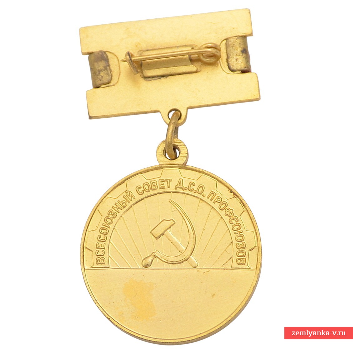 Оригинальная медаль в отличном коллекционном состоянии. Бронза, золочение. Медаль вручалась Всесоюзным центральным советом профессиональных союзов (ВЦСПС) победителям спортивных соревнований, проводившихся среди членов профсоюзов в Советском Союзе. На аверсе медали изображен спортсмен с развевающимся флагом, обрамленный лавровыми ветвями и надписями «ПЕРВЕНСТВО ПРОФСОЮЗОВ СССР» и «ЧЕМПИОН». Медали могли изготавливаться из различных материалов (например, томпак с серебрением, золото 583 или 375 пробы в разные годы) и имели различные вариации крепления (на винте или на колодке, как в данном случае) в период с конца 1940-х до 1980-х годов. Гарантия подлинности.