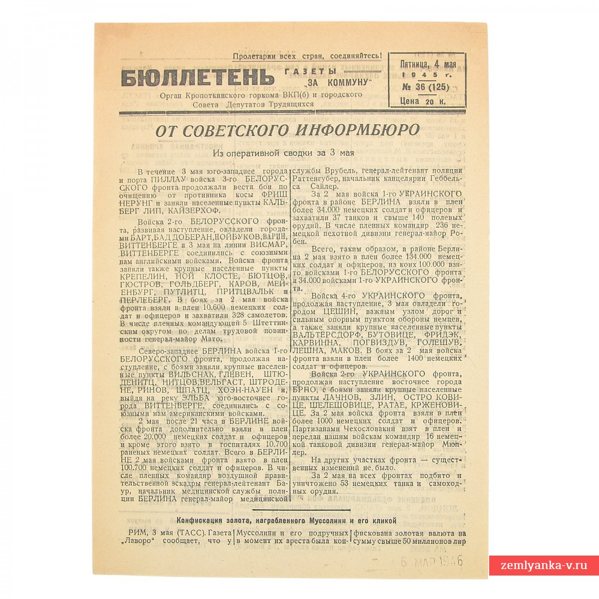 «Бюллетенями» в контексте газет времен войны назывались небольшие, оперативно выпущенные информационные листки или специальные выпуски, которые дополняли основную прессу. Хотя термин "бюллетень" не является широко распространенным, он описывает формат информационных выпусков, которые выпускались в дополнение к крупным газетам во времена Великой Отечественной войны. Бюллетени могли содержать краткие, но важные сообщения о ходе боевых действий, чтобы информировать солдат и гражданское население в условиях ограниченного доступа к основной печати. Они выходили в дополнение к крупным газетам, которые издавались в большом количестве и охватывали различные аспекты жизни страны во время войны. Кроме новостей, бюллетени могли использоваться для распространения агитационных материалов, призыва к патриотизму и мобилизации сил на фронте и в тылу. Во время Великой Отечественной войны выпускалось множество различных изданий, включая партизанские газеты, фронтовые и армейские газеты, а также листки, распространявшиеся в тылу врага, и все они могли иметь свои "бюллетени".