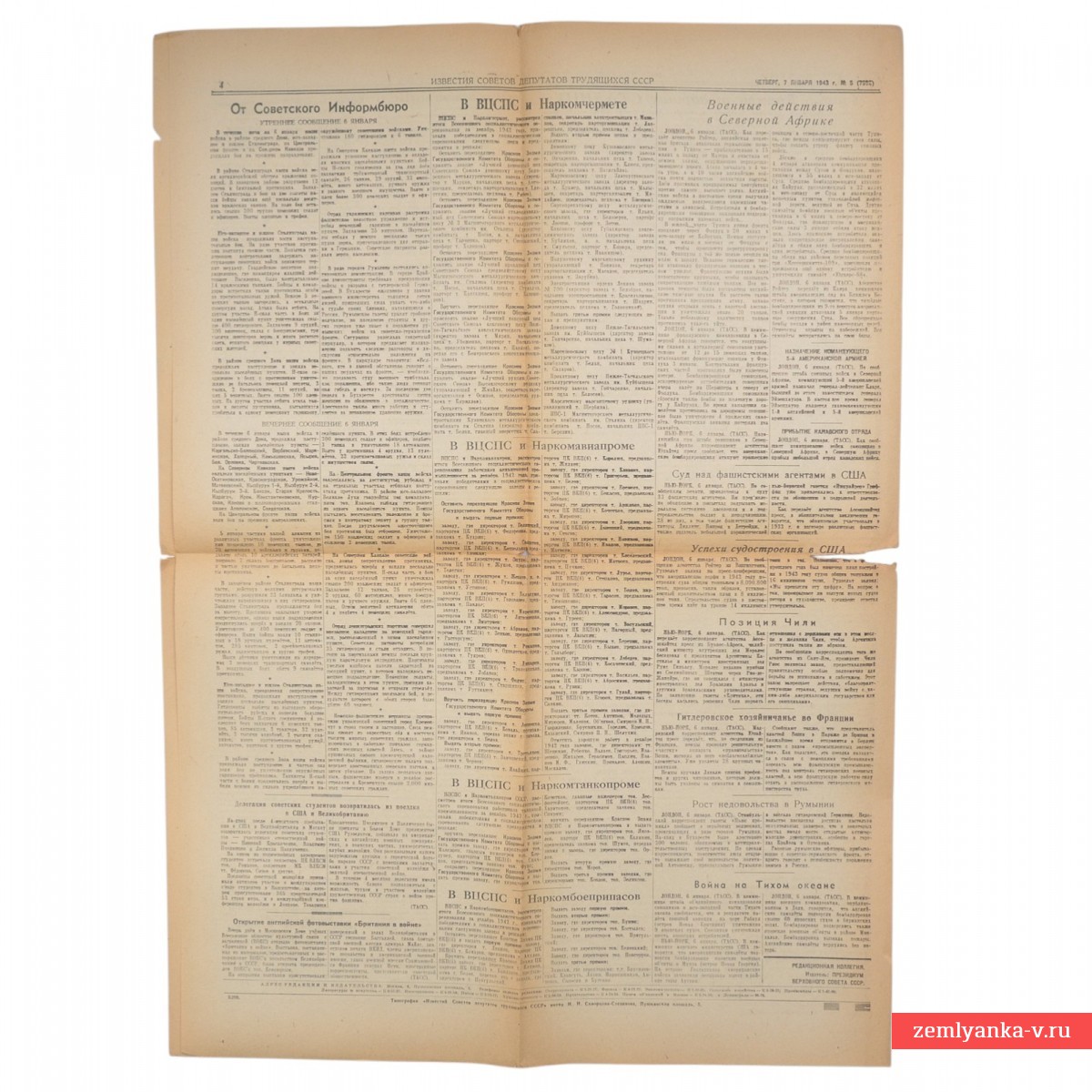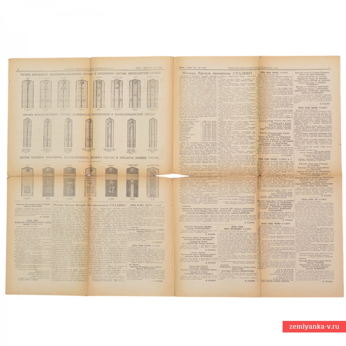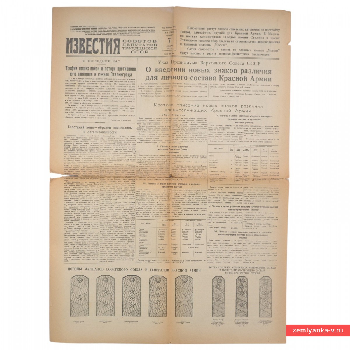Редкая подлинная газета в хорошем коллекционном состоянии, надрывы, лисьи пятна, незначительные утраты. Размер 60x42 см. На первой полосе опубликован эпохальный Указ Президиума Верховного Совета СССР «О введении новых знаков различия для личного состава Красной Армии». Именно этот документ вернул в армию погоны, которые ранее (после 1917 года) считались символом «старого режима». В колонке «В последний час» приведены данные Совинформбюро о колоссальных трофеях и потерях врага юго-западнее и южнее Сталинграда за период с 1 по 5 января 1943 года. Указано, что взято в плен 6 500 солдат, а всего с начала наступления (19 ноября 1942) — более 144 тысяч пленных. Гарантия подлинности.