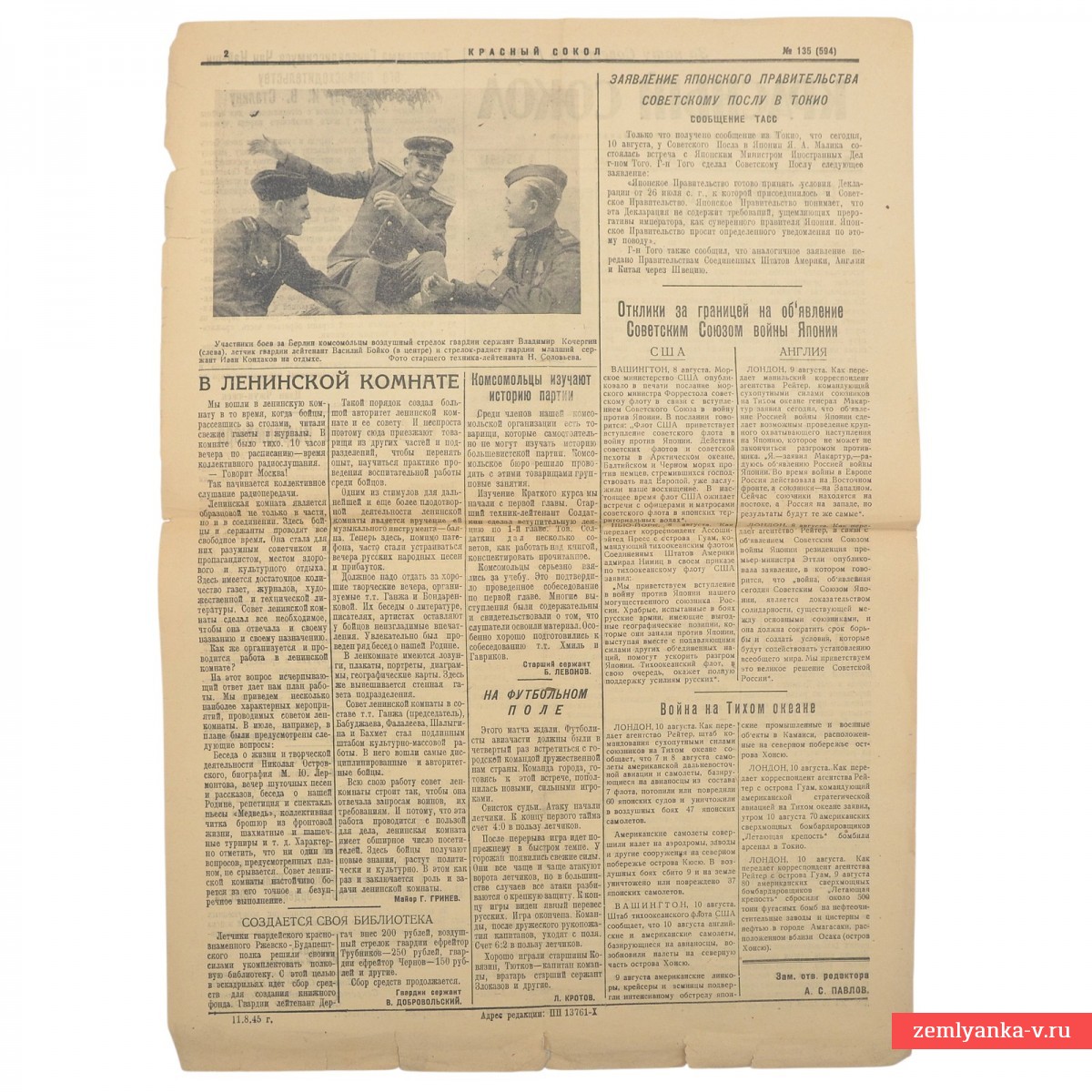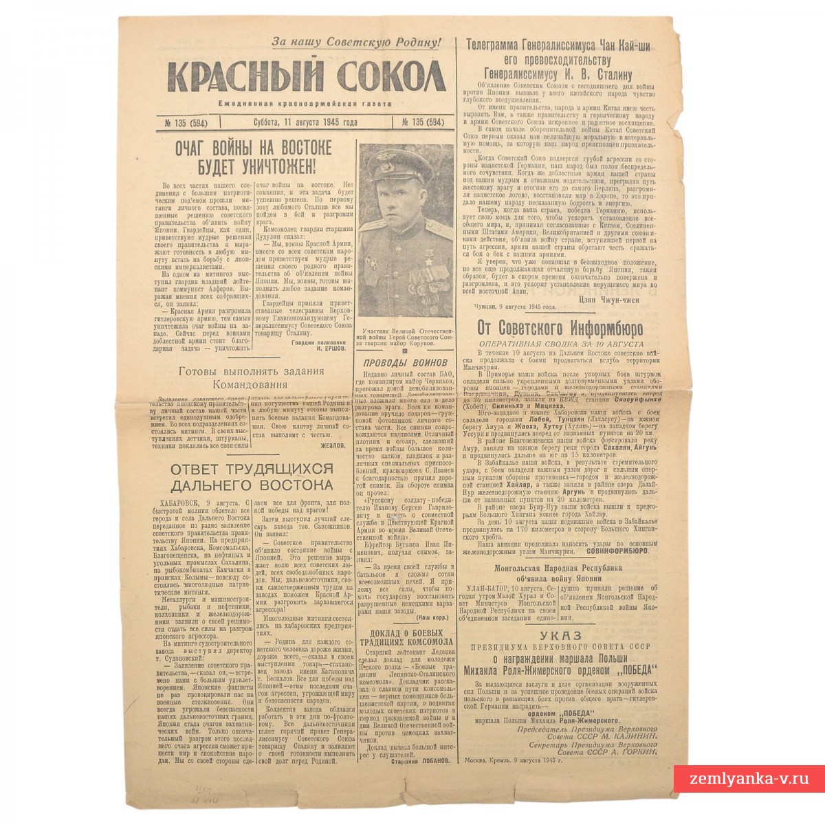 Представленная газета была официальным печатным органом Народного комиссариата обороны СССР и предназначалась для частей авиации дальнего действия. Главный заголовок гласит: «Очаг войны на востоке будет уничтожен!» Статьи посвящены вступлению СССР в войну с Японией, что произошло 8 августа 1945 года, с целью ликвидации последнего очага Второй мировой войны и выполнения союзнических обязательств. Формат А3. 2 полосы. Темы номера: