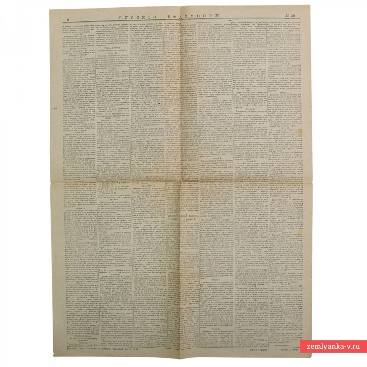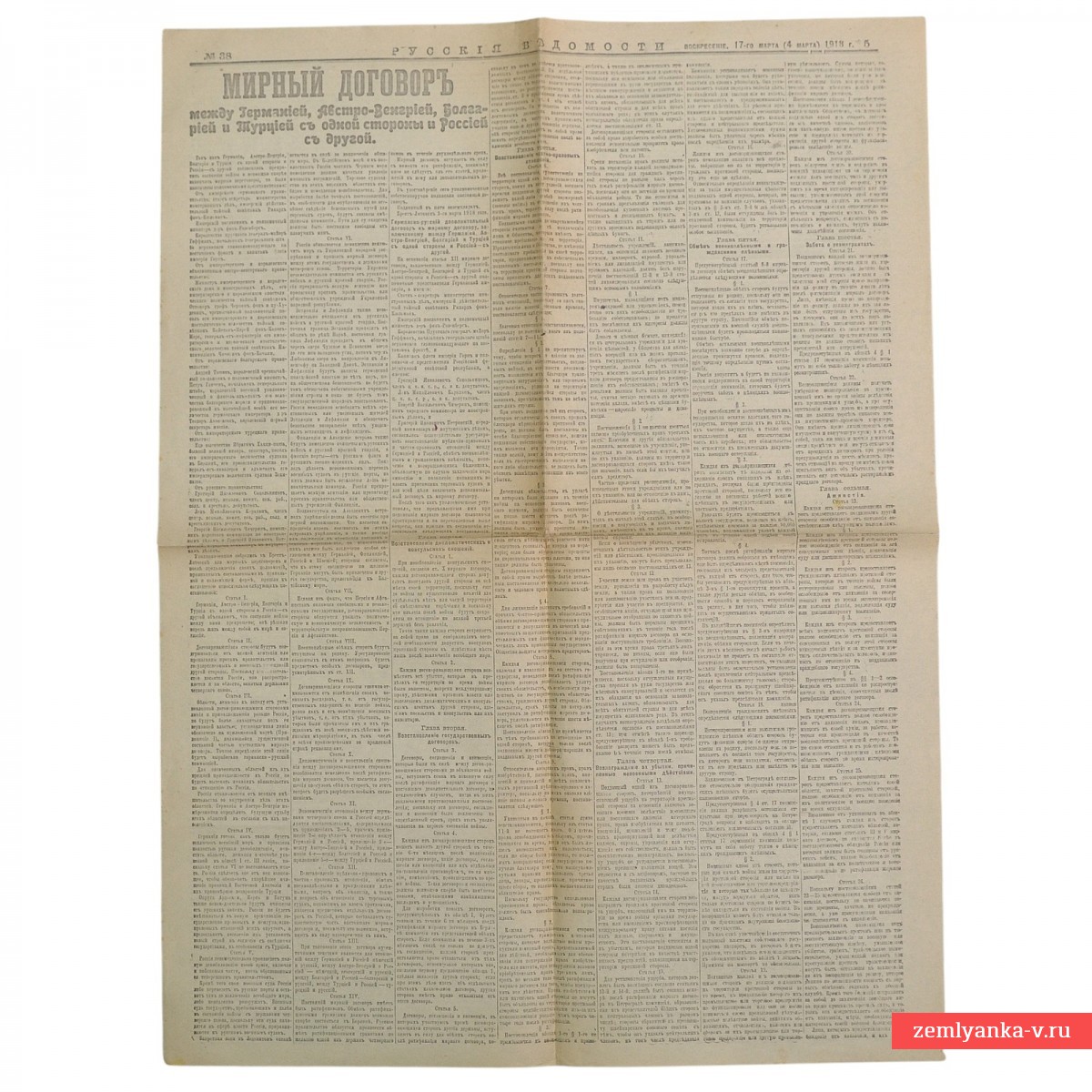 Очень редкая вкладка к газете «Русские ведомости» формата А1, полностью посвященная подписанному днем ранее мирному договору с Германией, Австро-Венгрией, Болгарией и Турцией. Отличное состояние. Гарантия подлинности.