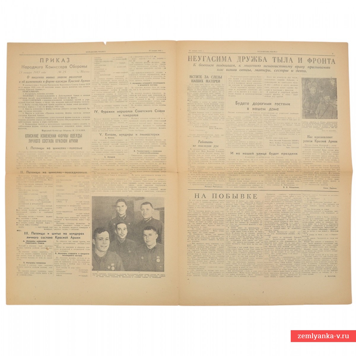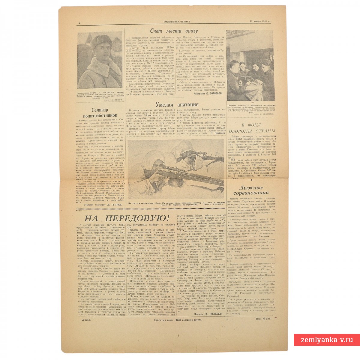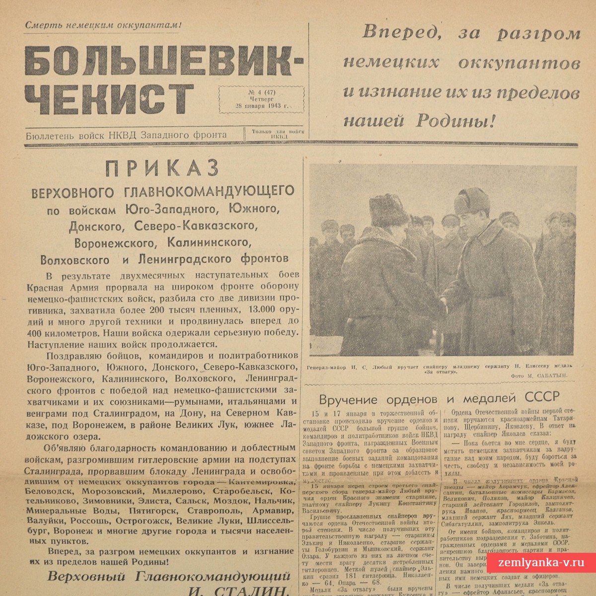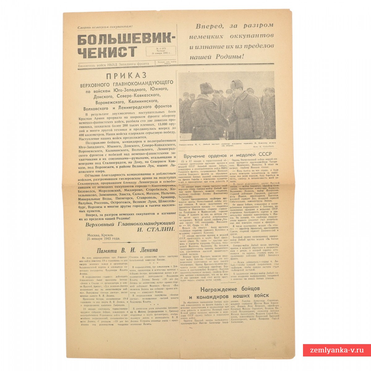 Это бюллетень войск НКВД Западного фронта, издававшийся в годы Великой Отечественной войны. Центральное место занимает приказ И. В. Сталина от 25 января 1943 года, посвященный успехам советских войск на ряде фронтов (Юго-Западном, Южном, Донском и др.). В тексте отмечается прорыв обороны противника, захват более 200 тысяч пленных и освобождение множества городов, включая Воронеж, Ставрополь, Нальчик и другие. Также есть статья о награждении отличившихся бойцов и командиров правительственными наградами, материал, приуроченный к годовщине смерти основателя советского государства (21 января) и многое другое. Формат А3, 4 полосы. Гарантия подлинности.