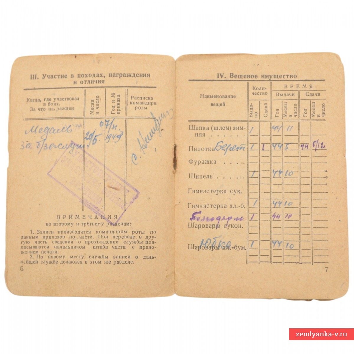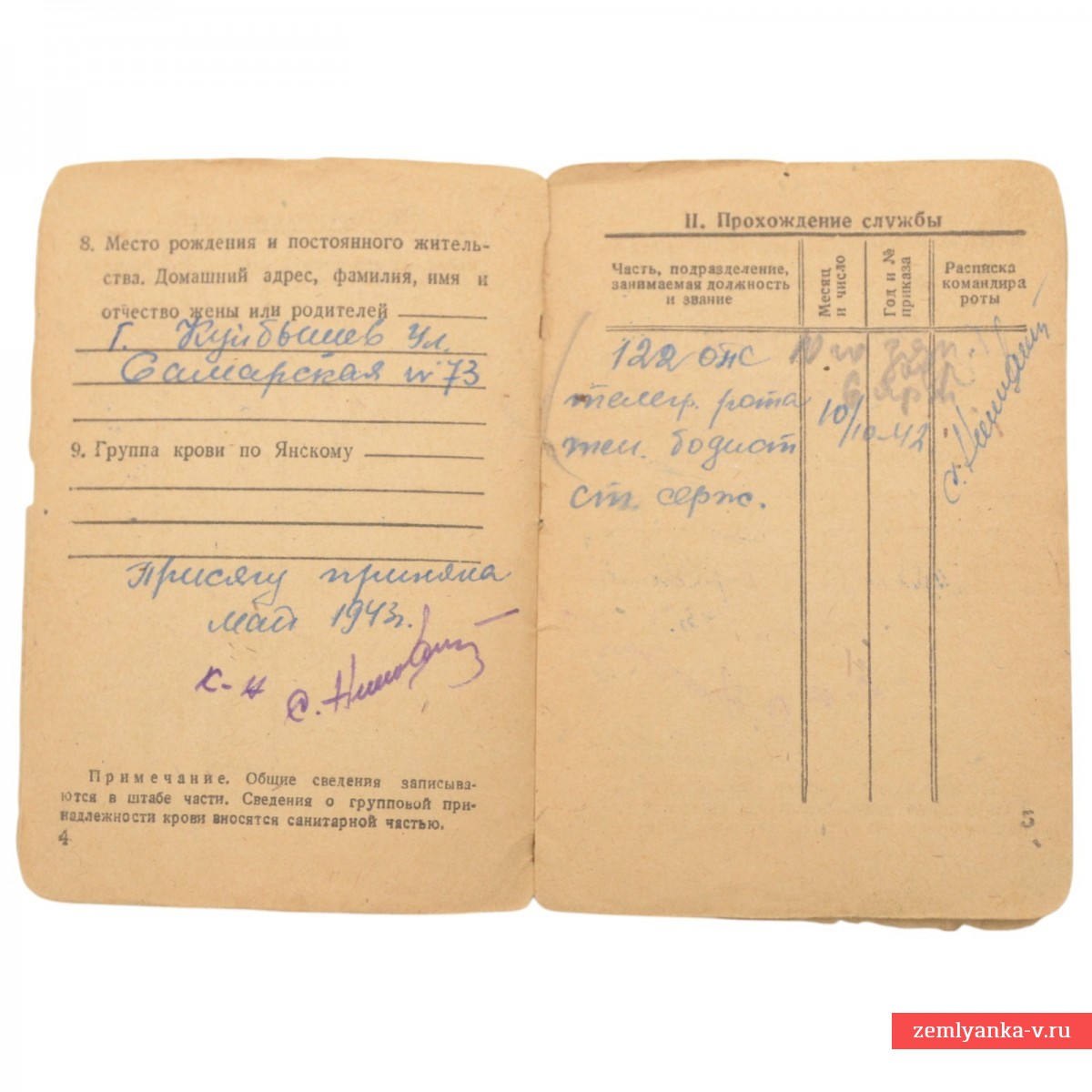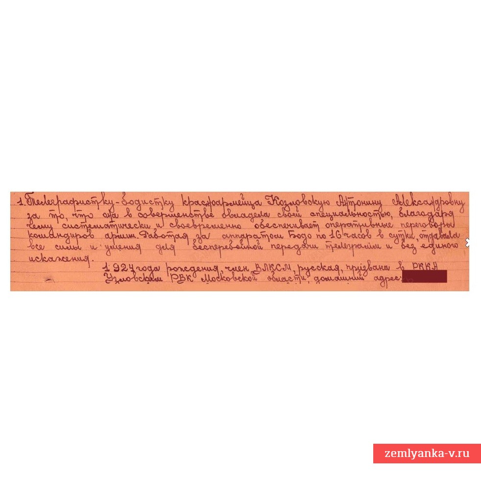 Оригинальная книжка в хорошем коллекционном состоянии. Выдана старшему сержанту Козловской Антонине Александровне – бодистке (оператору телеграфа, работавшую на аппарате «системы Бодо) телеграфной роты 122 ОПС. Редкая специальность. Награждена медалью «За боевые заслуги» (строка о награждении из наградного листа в ленте фотографий лота). Утрачена обложка. Гарантия подлинности.