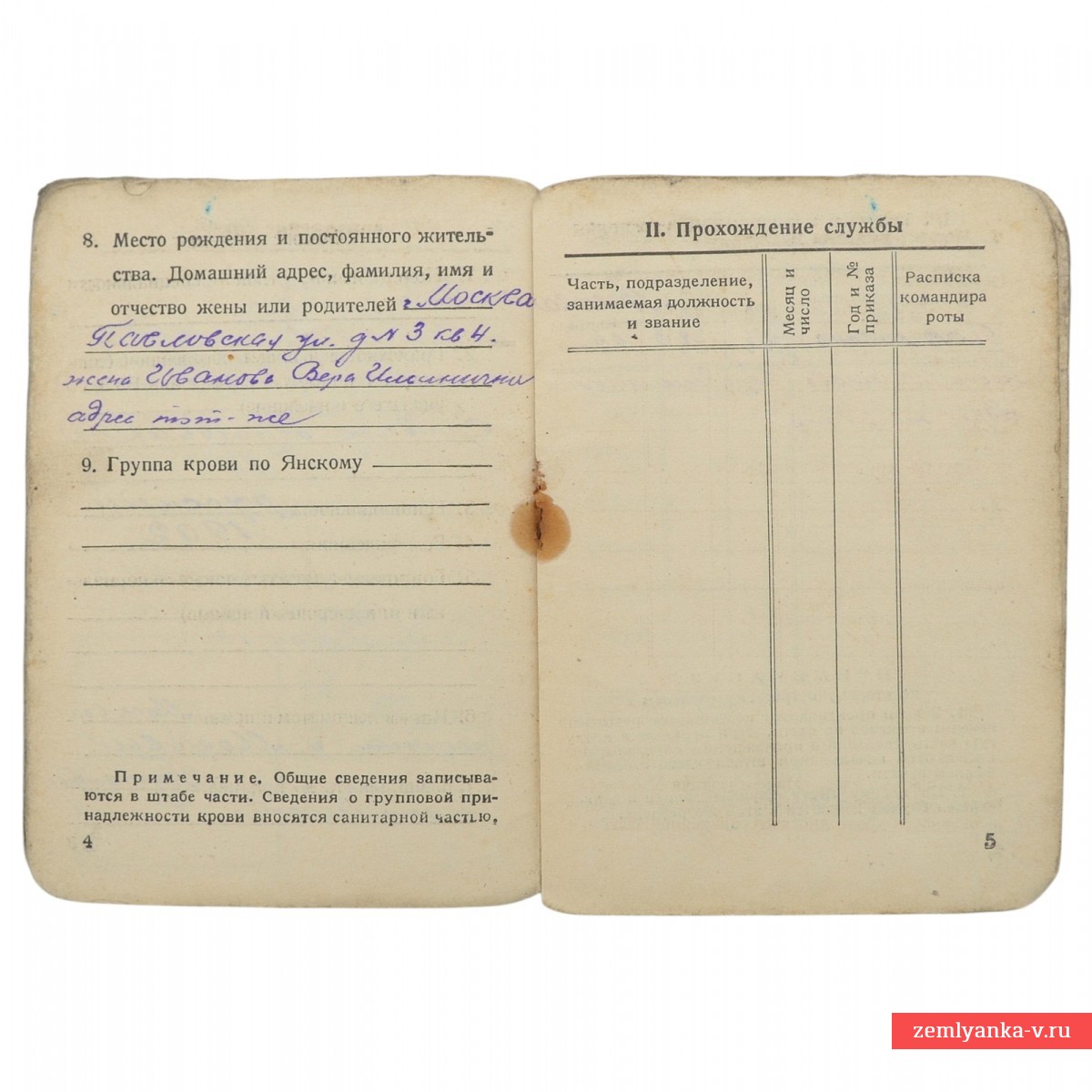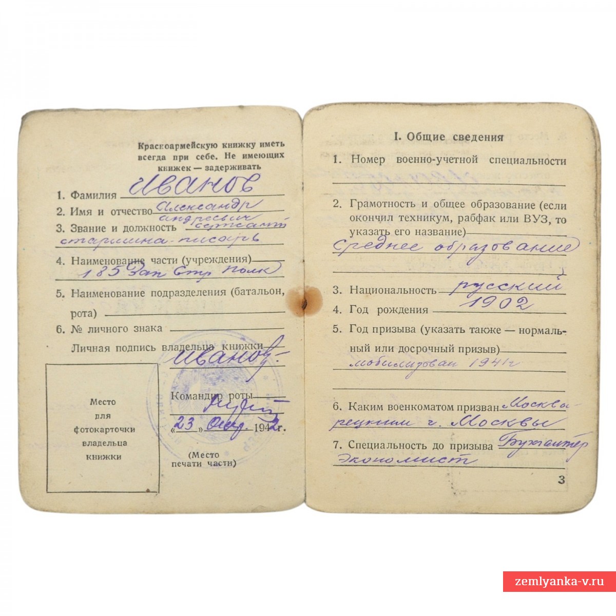 Оригинальная книжка в хорошем коллекционном состоянии. Выдана старшине-писарю 185-го запасного стрелкового полка Иванову А. А. Гарантия подлинности.