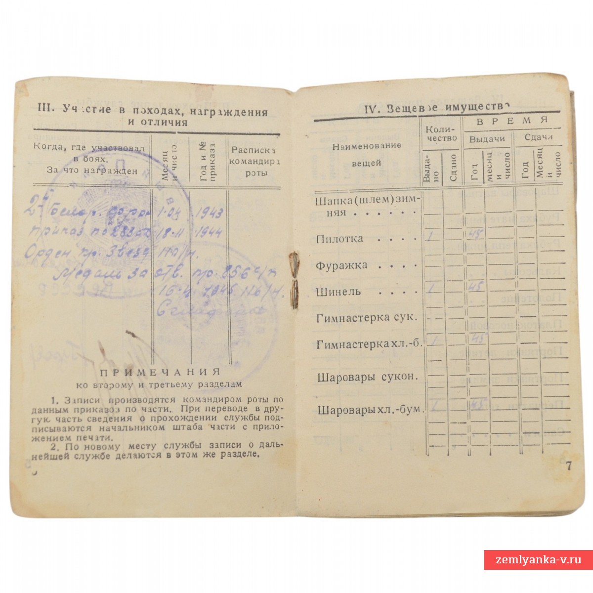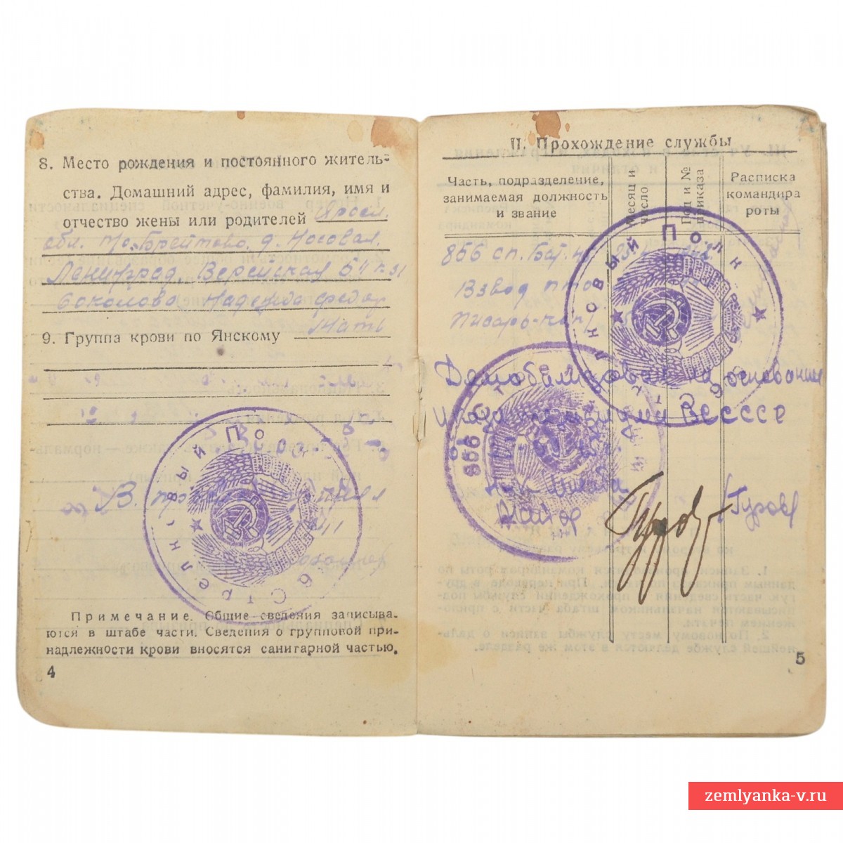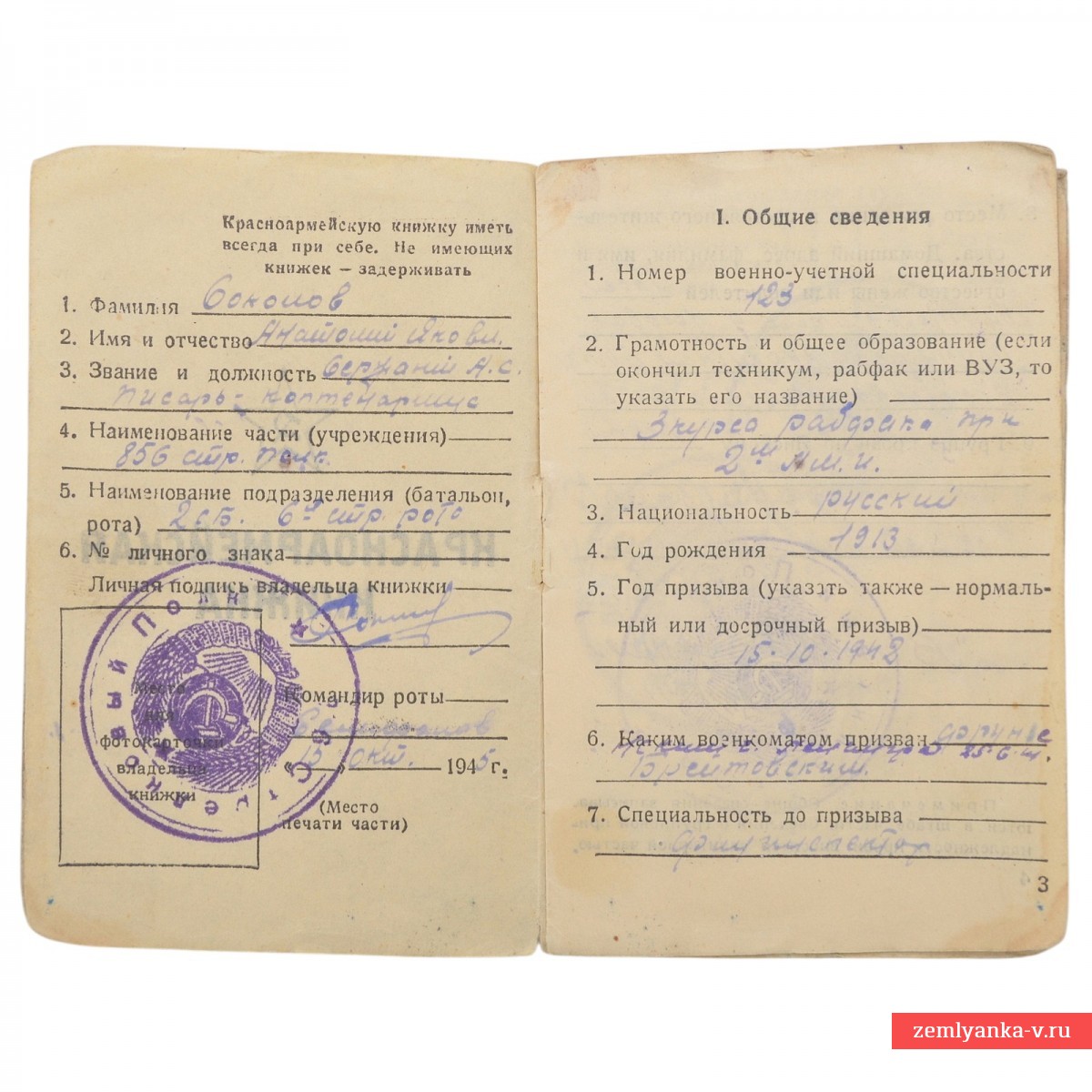 Оригинальная книжка в хорошем коллекционном состоянии. Выдана сержанту Соколову А. Я. – писарю-каптенармусу 856 стрелкового полка. Гарантия подлинности.