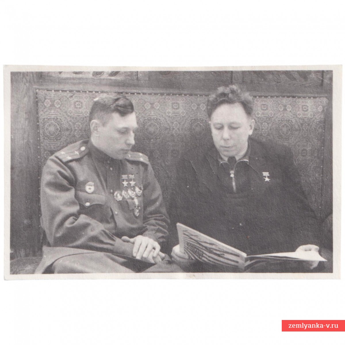 Оригинальный снимок в отличном состоянии. На фото подполковник ВВС РККА – дважды Герой ССР, а также Герой Советского союза в гражданской одежде. Размер 47*76 мм. К сожалению, определить фамилии награжденных на снимке нам не удалось, будем благодарны за помощь. Гарантия подлинности.