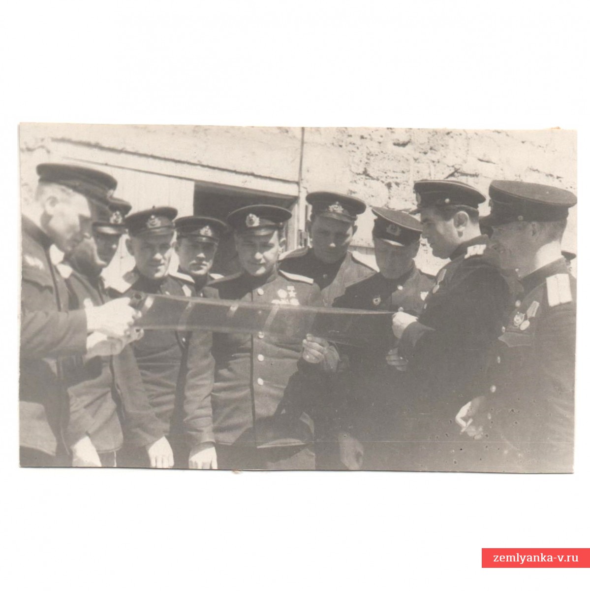 Оригинальный снимок в очень хорошем коллекционном состоянии. Размер 63*105 мм. Оборотная сторона подписана фамилиями изображенных, однако фамилия героя написана неразборчиво. Гарантия подлинности.