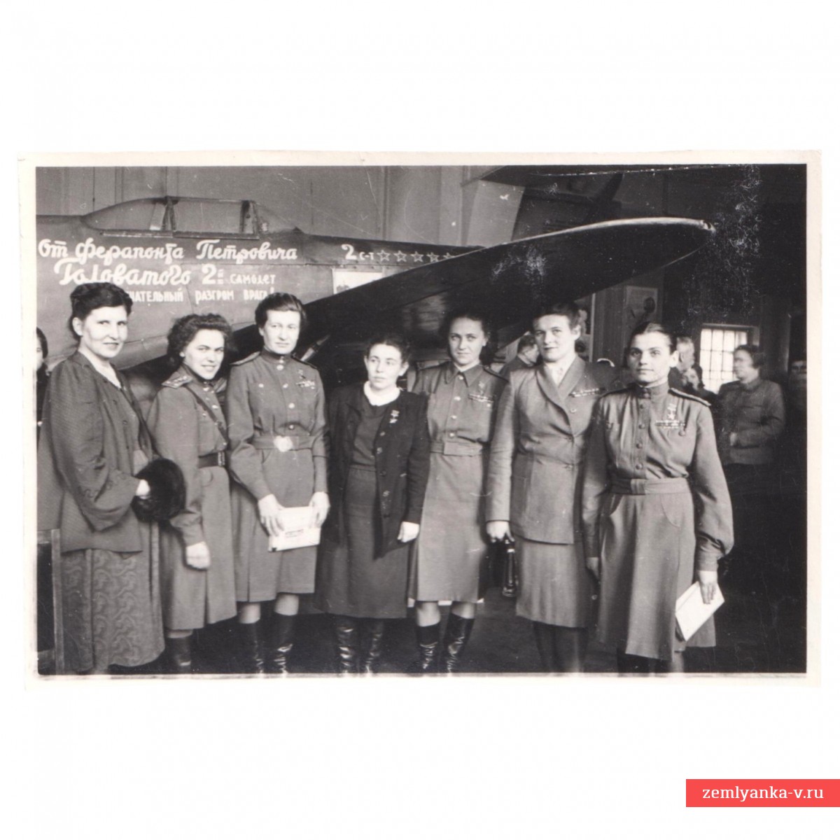 Оригинальный и крайне редкий снимок в неплохом коллекционном состоянии. Летчицы сфотографированы на фоне самолета Як-3, подаренного фронту колхозником Ферапонтом Головатым. Размер 52*77 мм. На оборотной стороне следы вклейки в альбом. На фото изображены:. А. Жигуленко (третья справа), М.П. Чечнева (крайняя справа), Р.С. Гашева (вторая слева), Р.Е. Аронова (первая слева), Литвинова Л. Н. (вторая справа), Е.Б. Пасько (4 справа): все они служили в 46-м Таманском полку. 46-й гвардейский ночной бомбардировочный авиационный Таманский Краснознамённый и ордена Суворова полк (46-й гвардейский нбап, до 8 февраля 1943 года — 588-й ночной легкобомбардировочный авиационный полк), также известный как «ночные ведьмы» — женский авиационный полк в составе ВВС СССР во время Великой Отечественной войны. Гарантия подлинности.